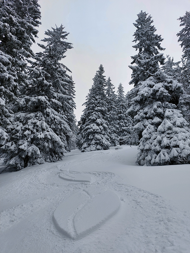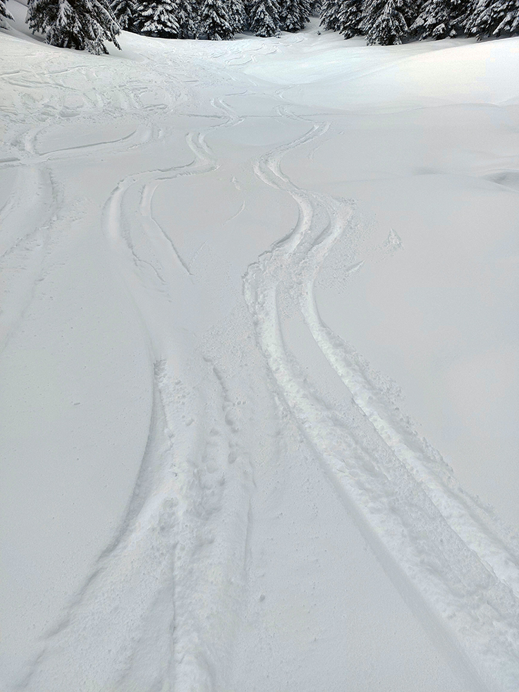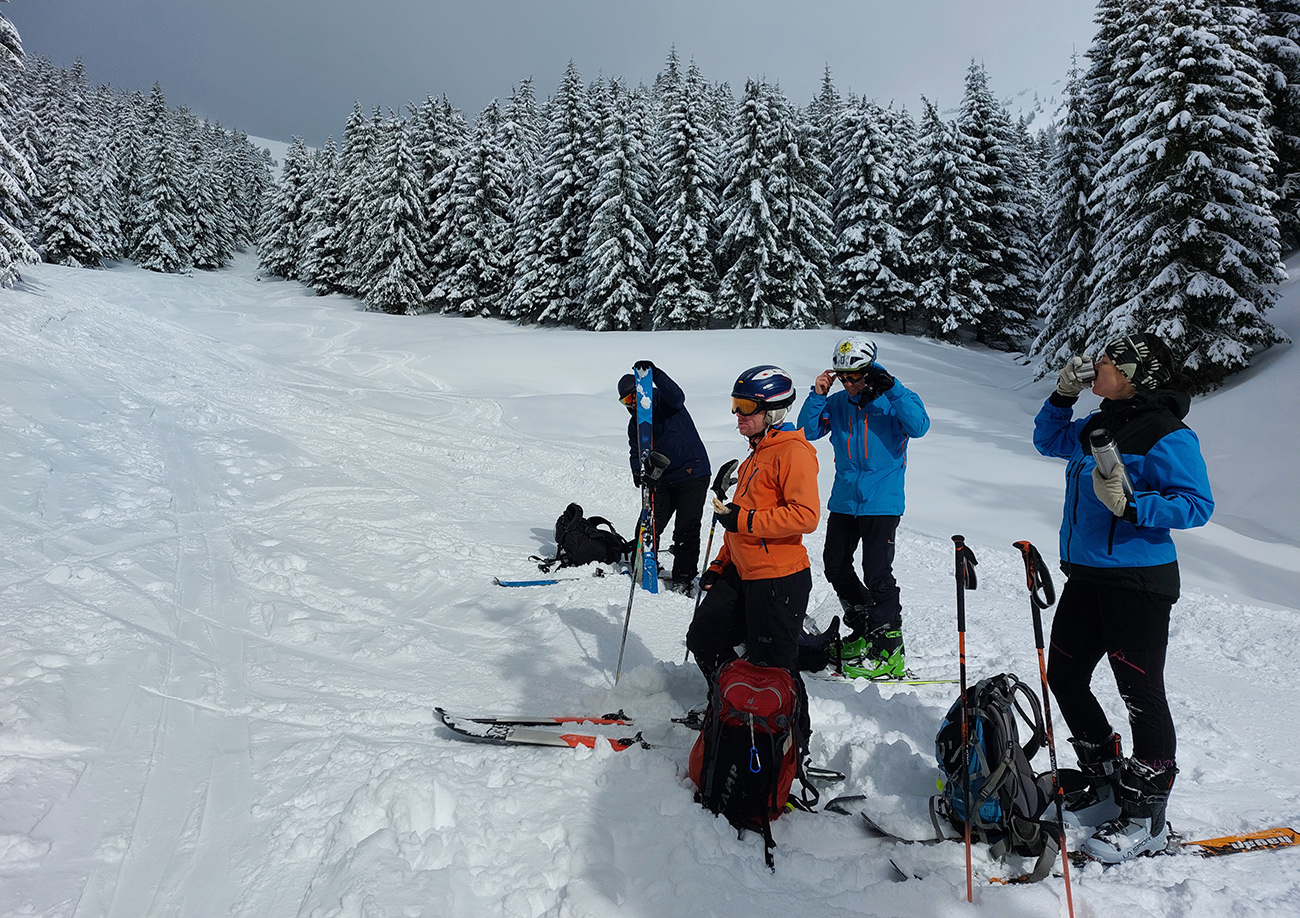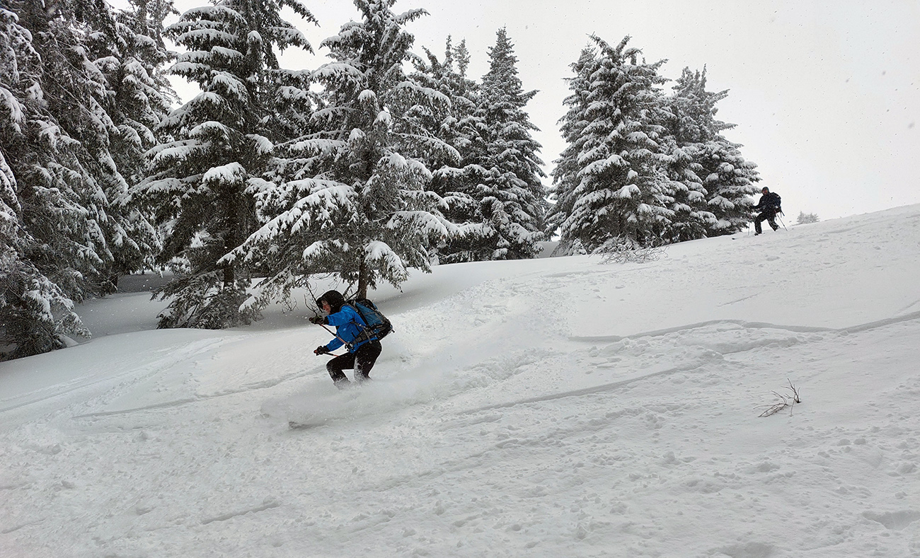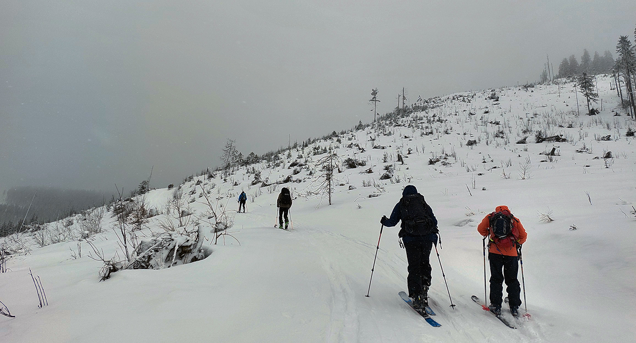 Cestou nazad sme sa vrhli pomedzi stromy do Turánskeho žľabu, ktorý už bol síce rozlyžovaný, ale práve medzi tými stromami to bolo takmer nepočmárané a každý si našiel tú svoju linku. Aj cez 20 cm prášku, paráda. Potom už len hore rúbaňou na vrchol Turánskeho a tie rúbaniská smerom k ceste na záver.