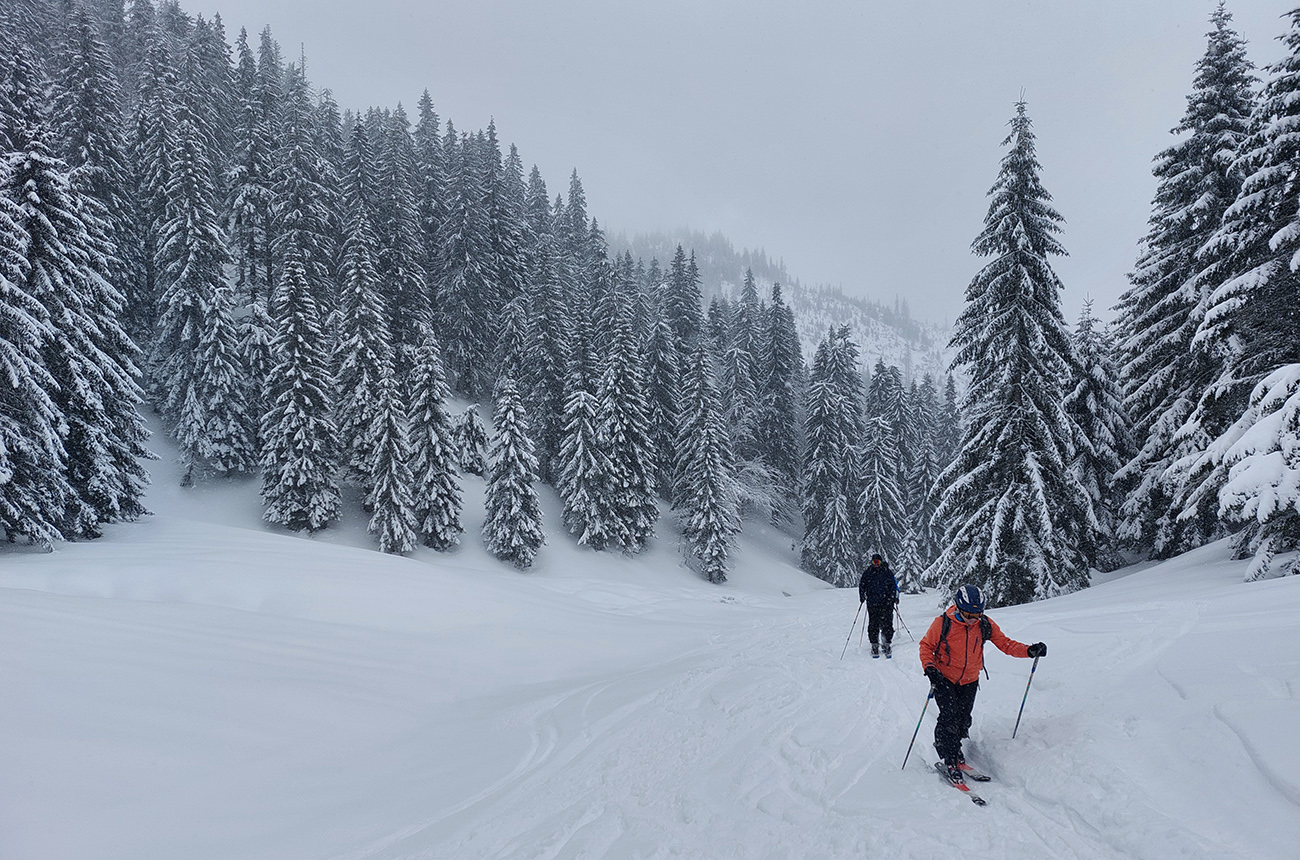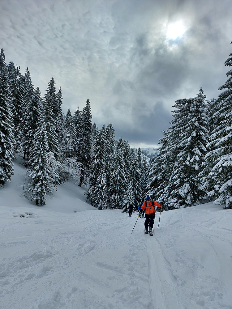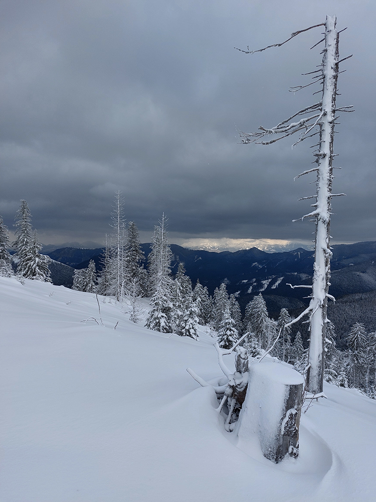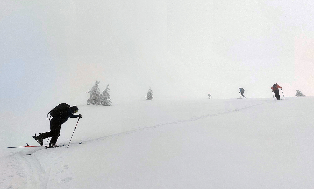 Ale pome od začiatku: v lese pod hrebeňom čistá paráda v prášku, nad lesom vetrom ubitá vrstva a hrebeň čistý, hrboľatý a zubatý firnový ľad. Stúpalo sa po tom čerstvom dobre, len v traverzoch nad lesom ak viacerí prešli, už sem – tam aj lyža podkĺzla na ľade, vo vydretej stope.
