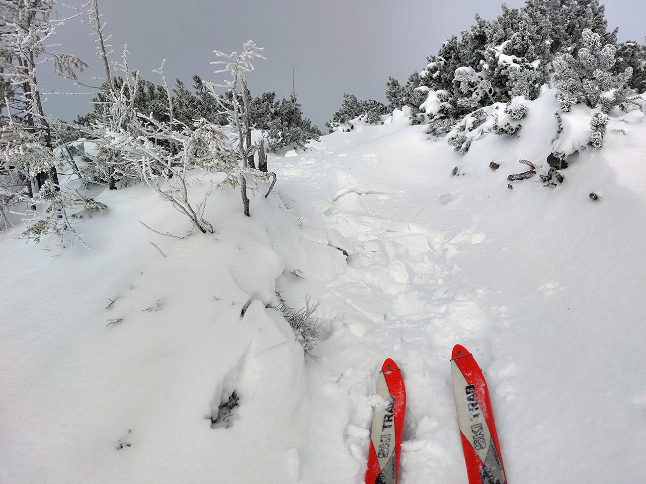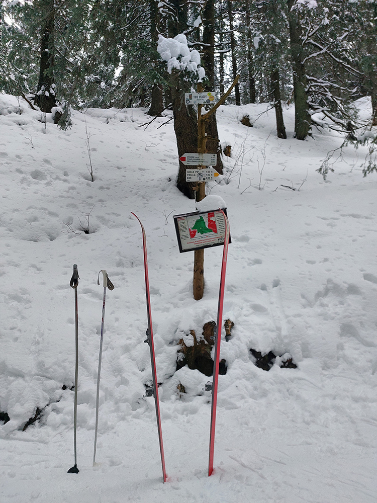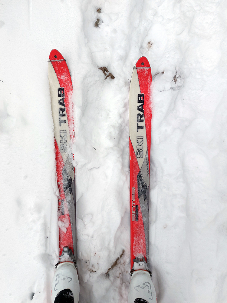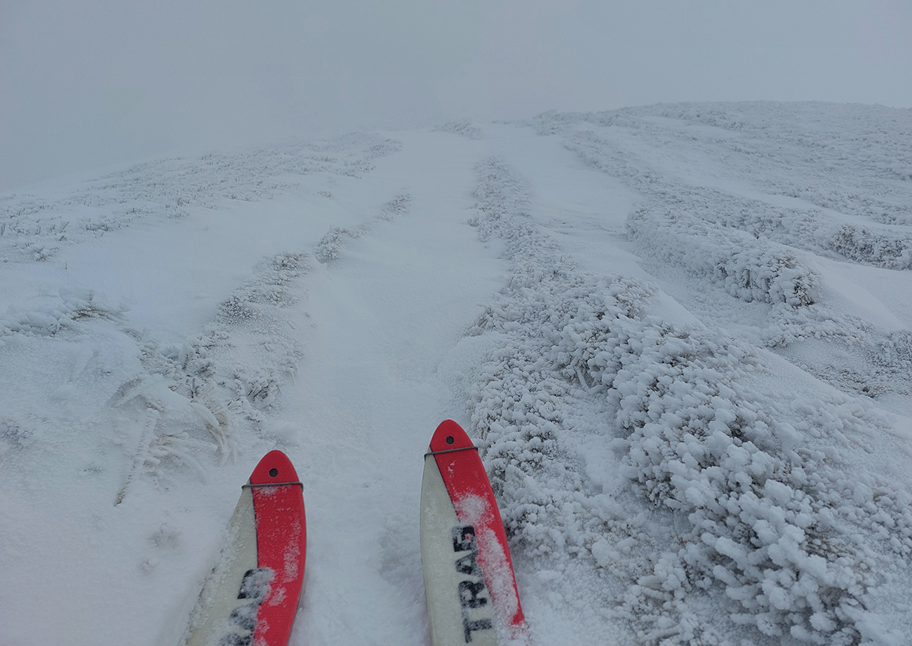 Stúpanie na Prašivú ma na pásoch bavilo len v spodnej časti, aj tam však bolo kameňov hojne. Potom lyže na batoh, inak by to ani nešlo. Aj nad lesom stopa len pre pešiakov, od pešiakov. Vďaka „predchodcom“ za komfortné schodíky a počasiu za posledné rozhľady. Do lyží som naskočil až hore v kosovke, kde sa sklon zmierňuje. Zároveň som ale vliezol do mlieka a jedovatého severáku. Pritom o kus nižšie to vyzeralo, že oblaky sú neškodne vysoko: