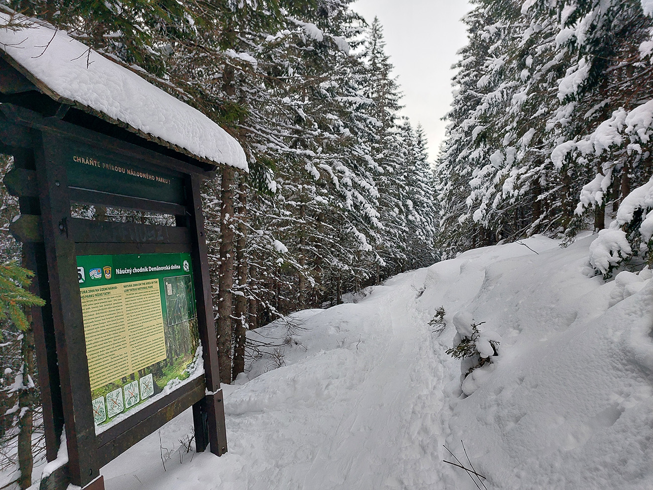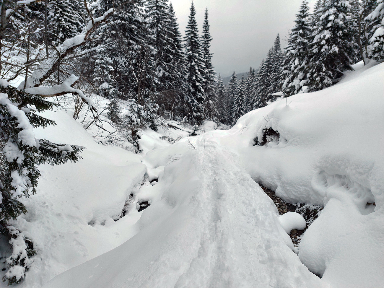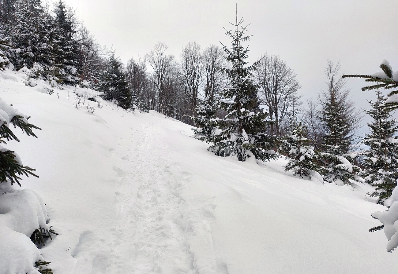 Hej bolo, lepší vietor fúkal. Aj pekné záveje naukladal. A dobre sa to prepadalo, poriadne hlboko. Našťastie aspoň čerstvé stopy po (asi) troch pároch snežníc sa dali občas využiť. Ale aj to len na kúsku medzi stromami.