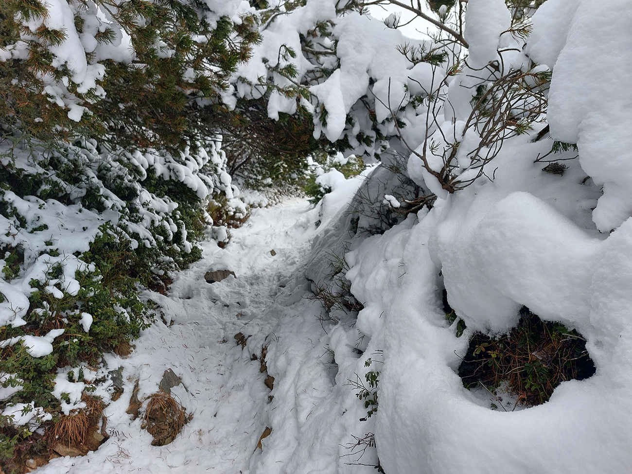 Od autobusu pod Prašivú to bola ešte relatívna paráda. Snehu za Poliankou dosť, ale pozor! Len na výstup. Základ žiadny, šutre striehli, zamaskované práškom, palice hlasno klepali o zem. V zjazdíkoch pred Kečkou veeeeeľká opatrnosť, aj tak boli škrtance. Kečku aj Kozí chrbát som traverzol – už tam som sa divil, že s výškou toho snehu akosi nepribúda tak, ako som si myslel.