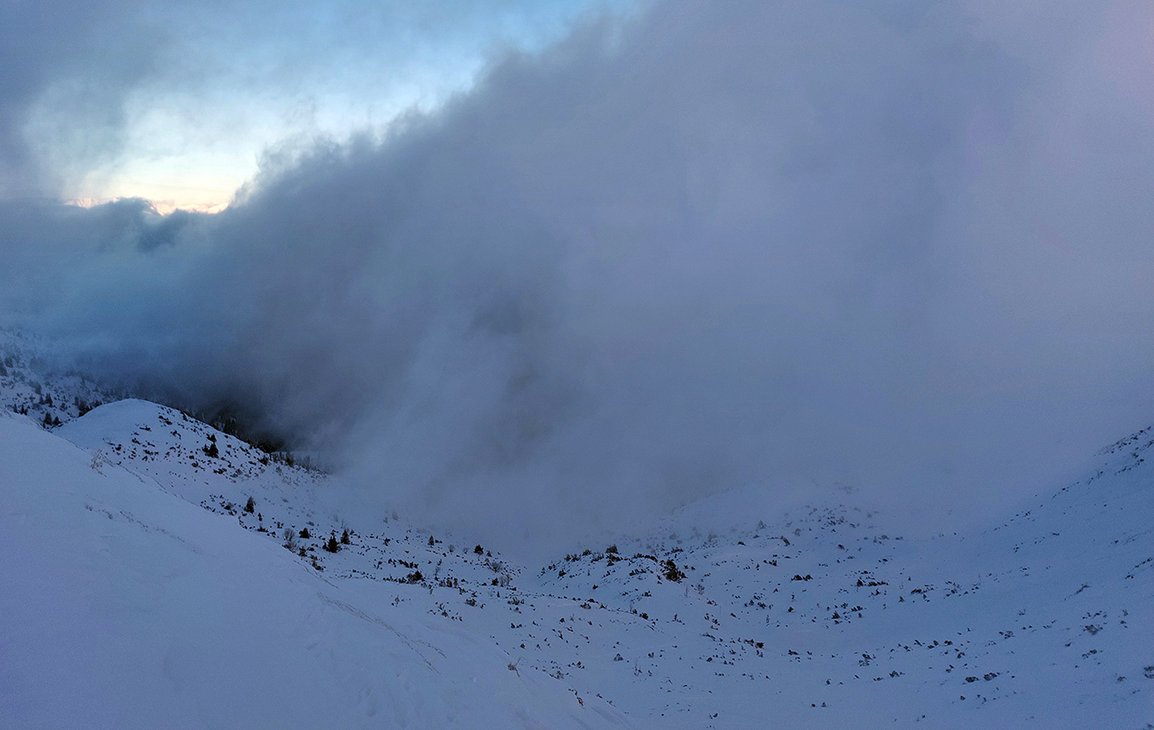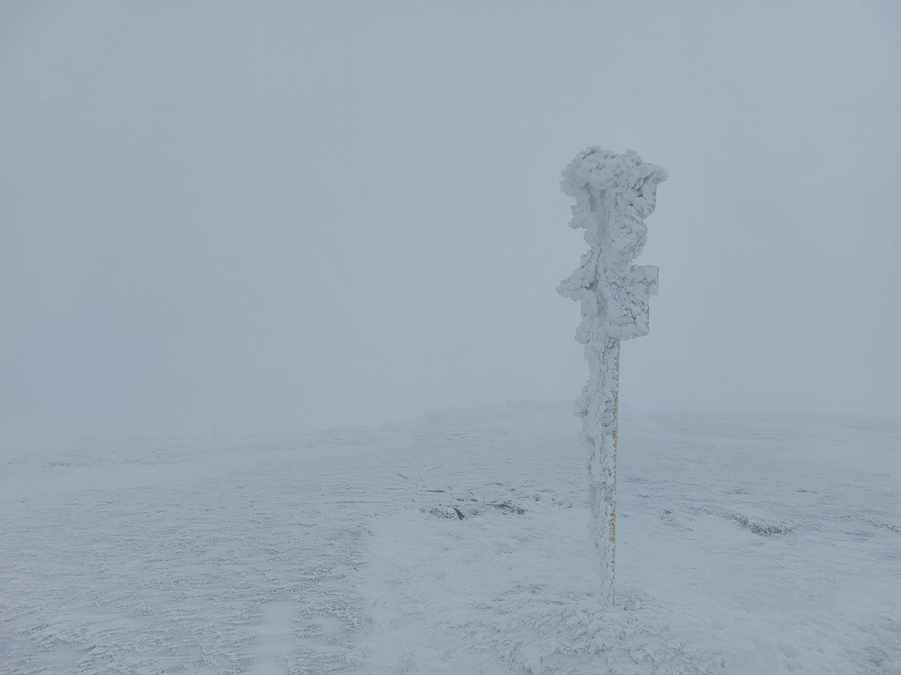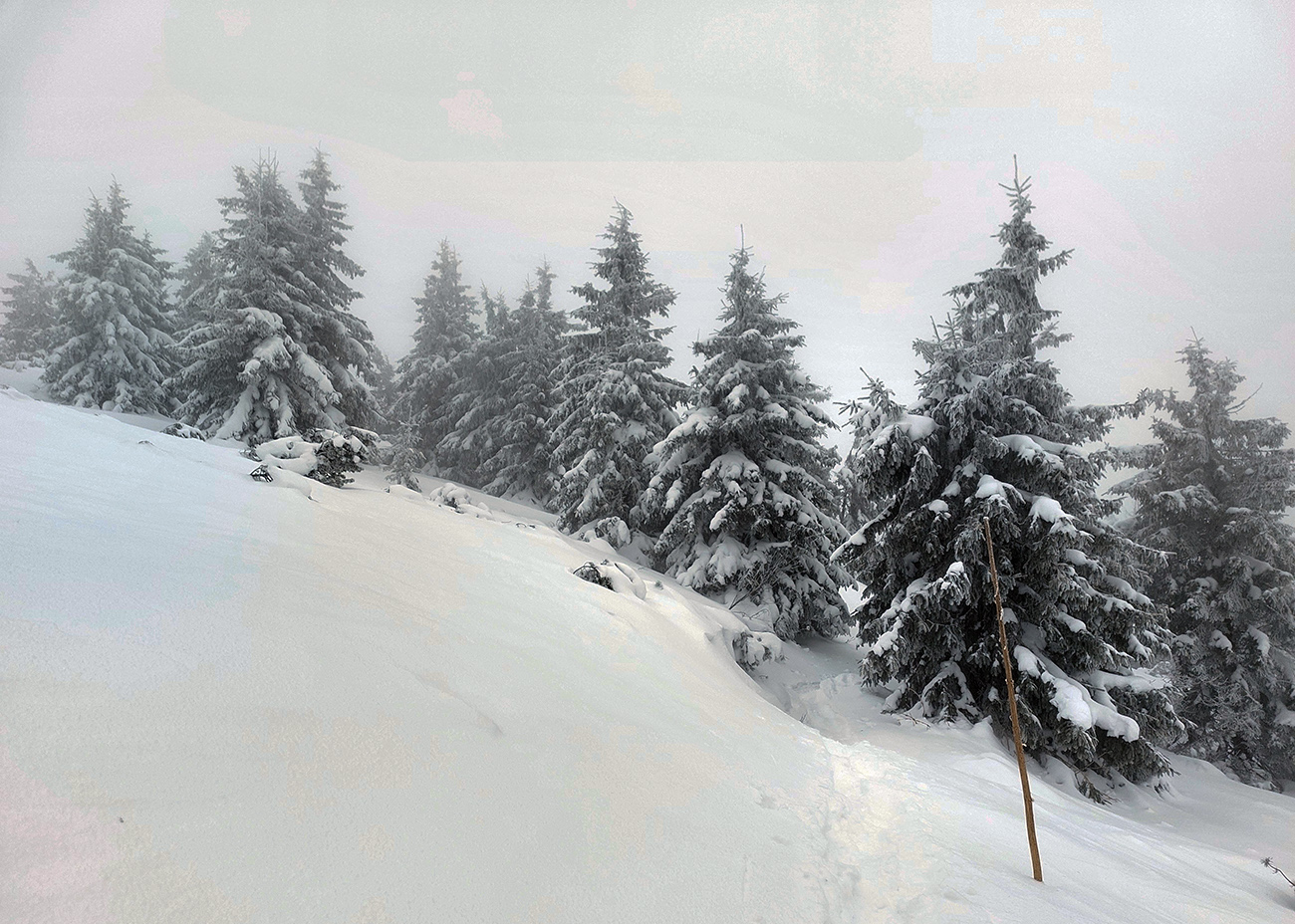 Posledné stúpanie na Poľanu, pásy dole a že hádam aj polyžujem, pod jej sedlom som čakal prašanové orgie. Hej boli by, keby som niečo videl. Ale len smejúce sa oranžové Tatry v diaľke, nad okrajom mraku, to ktorého som sa vnáral. Pod nohy som videl ledva toľko, aby som neponičil výstupové cikcaky.