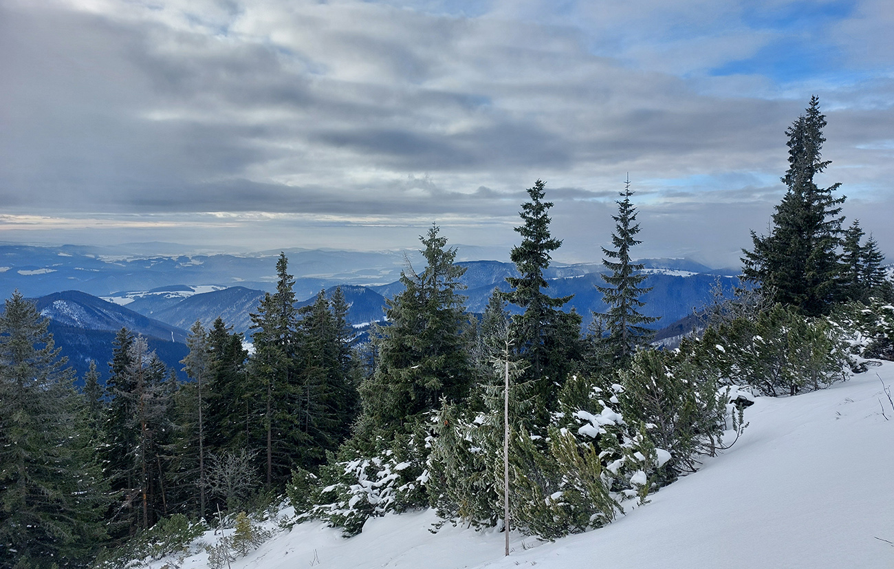 Aspoň pred Ďurkovou sa mraky trochu potrhali, tak som videl, kade vrchol najlepšie traverzovať. No to zas dáka energetická kríza prišla, tak nastala nutná pauzička v závetrí. Siahol som do tajných rezerv, ktoré som už dlhšie niesol pekne v teple na tele. Pomohli, aspoň trochu. A možno aj ten výhľad do krajiny: