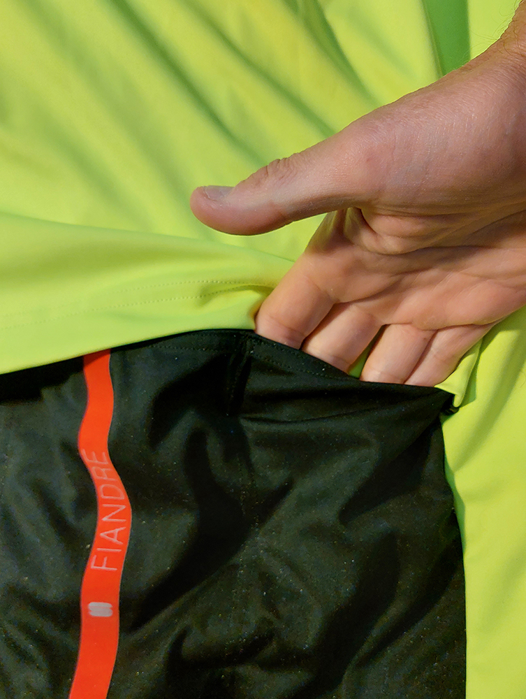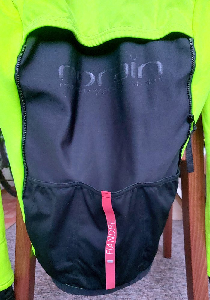 Spomínanému výbornému odvetrávaniu pomáha zadná strana rukávov a spodné dve tretiny chrbta z materiálu NoRain. To je zas tradičná a roky vylepšovaná špecialitka priamo od výrobcu Sportful – podľa ich vlastnej stránky „hrejivá, pružná a priedušná tkanina ThermoDrytex Plus, ktorá je pomocou nanotechnológie upravená tak, aby čo najrýchlejšie odvádzala vodu z povrchu a zabraňovala jej nasiakavaniu“. Až som sa divil, ako sa odvetrávanie zlepšilo, keď som dal preč ten zadný panel. Aj pod ním sú ale všetky tri vrecká relatívne dobre dostupné, presahuje ich len o máličko. Pravý zips ostáva na bunde (treba ho vytiahnuť a skryť hore, aby neplápolal), ľavý ostane na paneli. Ale za jazdy a navyše v rukaviciach toto na fotkách radšej neskúšajte: