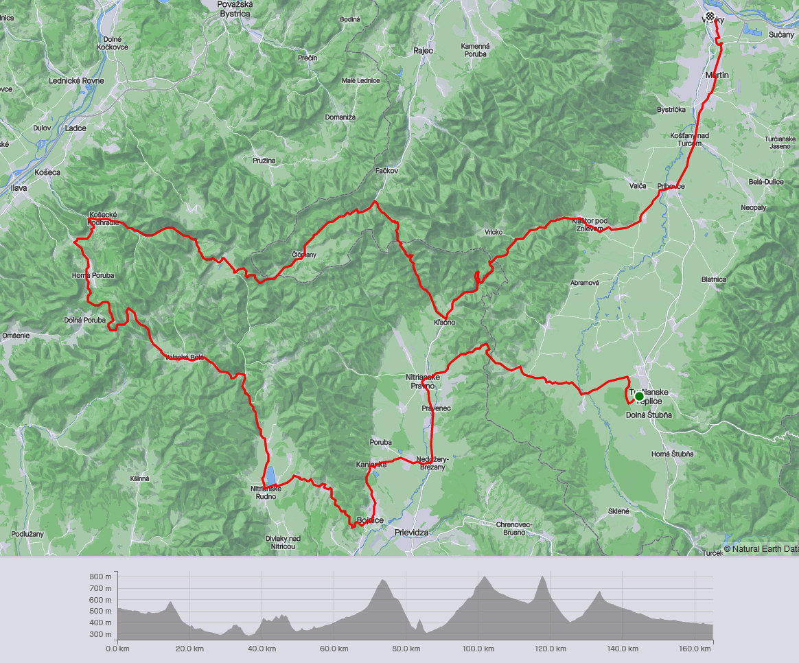 ...čiže obľúbené žiletkárske stúpania v srdci Strážovských vrchov, na rozhraní Turca, Ponitria a Považia. Plus Vyšehradské a Vríčanské sedlo, lebo sa k tým stúpaniam z názvu bolo treba nejako z domu dostať. Alebo ďalší z variantov kombinácie cyklisticky veľmi pozitívnych ciest v tejto časti krajiny, ako ich už tu na Vetromagu máme párkrát zreportované (odkazy dole). Pekná nedeľa pred koncom mája to bola – akurát, že tesne popoludní hrozili búrky, tak bolo treba chytro vyraziť. Ale zas ráno chladné, tak sa mi nechcelo moc na rovinách mrznúť a nechal som sa doviezť do Turčianskych Teplíc prvým vlakom. Že to nebude dlho trvať cez Dubové a Budiš, a potom zahrejem motory stúpaním popod Vyšehrad. Cestou pod ten prvý kopec, so slnkom za chrbtom, to bolo síce o zohriatom zadku a zmrznutom bruchu, ale popod hrad potom už paráda, lebo vyššie viac slnka aj tepla: