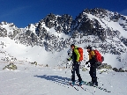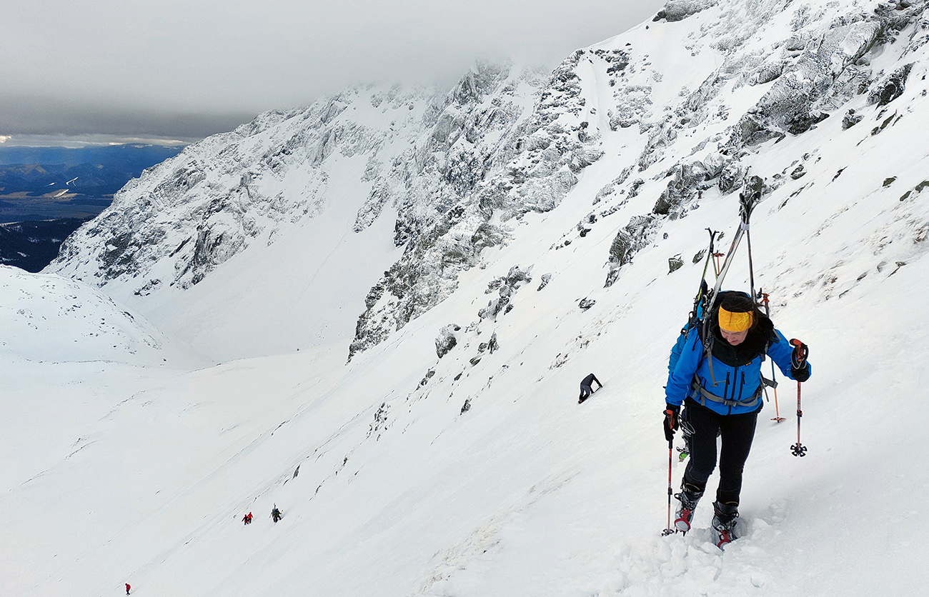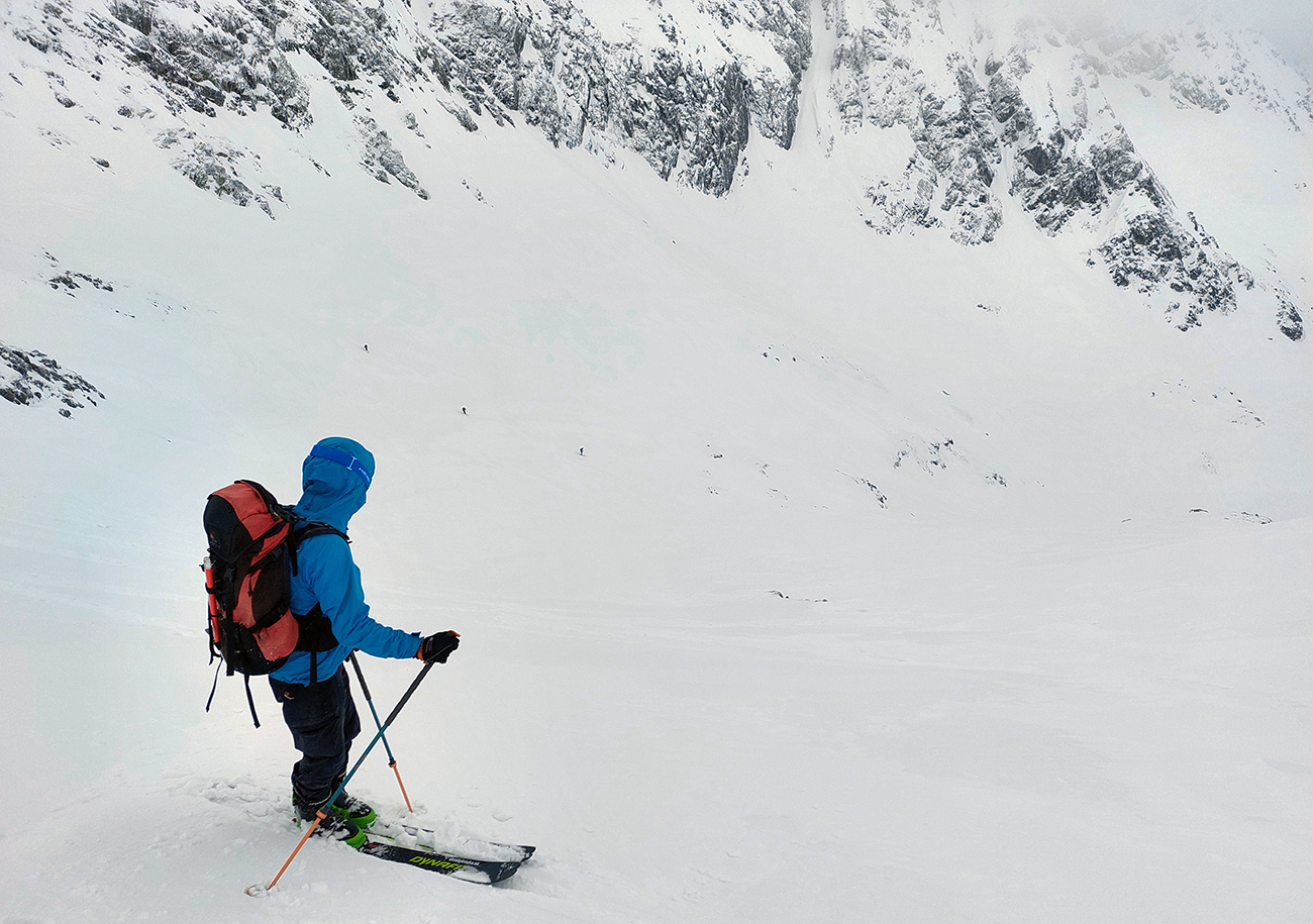 V prechode do strmého záveru výstupu pod Vyšným Kôprovským sedlom lyže na batoh. Stopy už boli, pohodlne to išlo aj bez mačiek, tuhá a pevne prilepená čerstvá nádielka poskytla takú akurát oporu. Len to už prihučali mraky, zachytávali sa stále nižšie na vrcholkoch a začínala difúzka. V sedle už poriadne fučalo, na Kôprovský už sme ani nešli, nebolo tam vraj vidieť ani na krok – hovorili tí, ktorí už sa vracali.