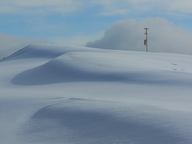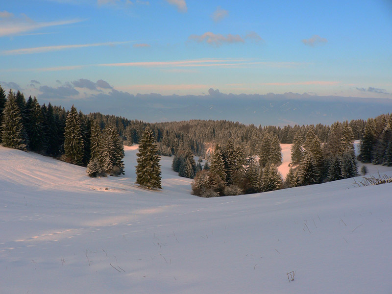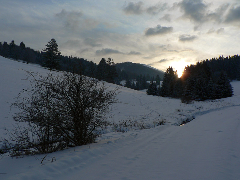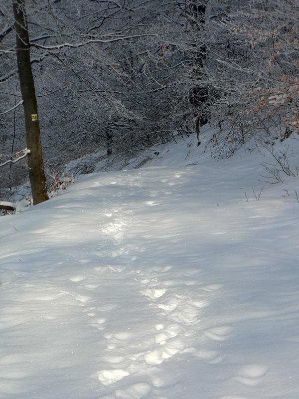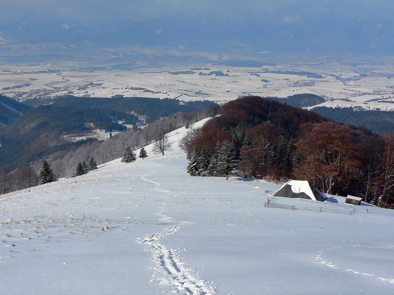 Tenká ľadová škrupina sa na zvážnici v Slávkovej doline ešte prepadávala – pod ňou blato. Na lúkach Žiarca by sa už dalo, aj zlyžovať, mimo lesa je snehu viac. Dokonca aj ratrakom naťahané pásy pre bežkárov bolo vidno pod čerstvým popraškom. Od hornej stanice vleku na Lehote je to až na Poľku po zvážnici a väčšinou v lese, takže zas máličko snehu, ale už je to vyššie, na výšľap stačí. Smerom dolu by to spod hrán napriek tomu iskrilo. Vrcholová lúka sa dá v pohode aj smerom dolu, lebo tu je popri lese nafúkaného a zamrznutého snehu dosť. Ale zas len na úzkom páse, inak tu tráva trčí ako v novembri.