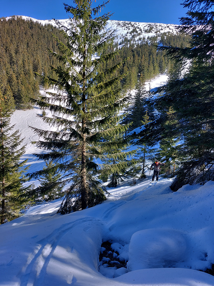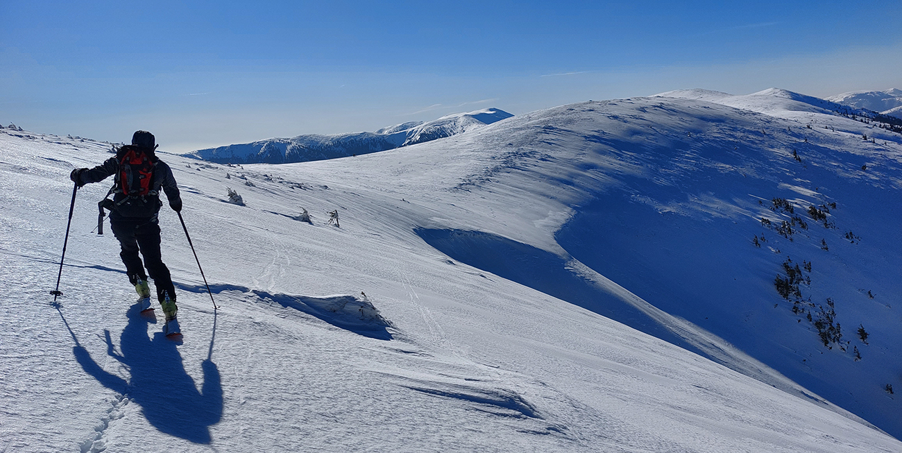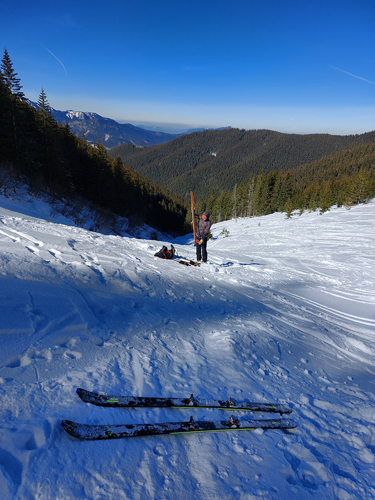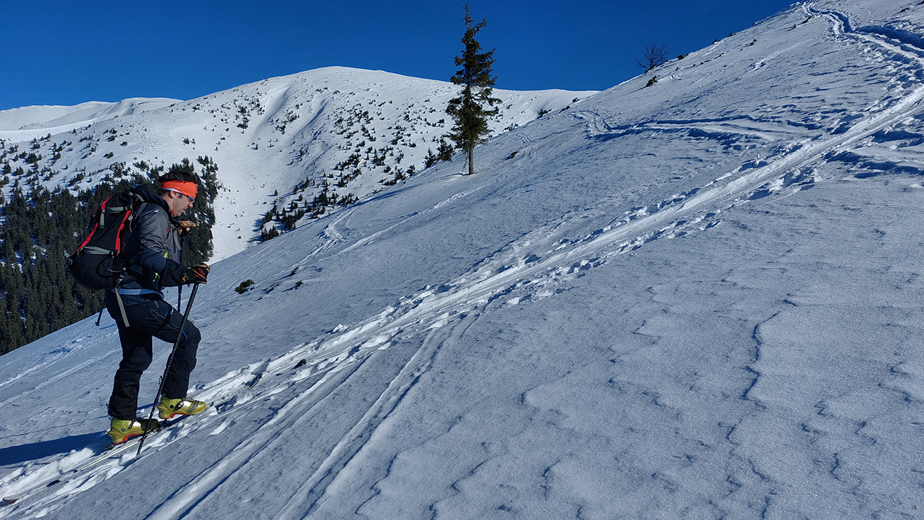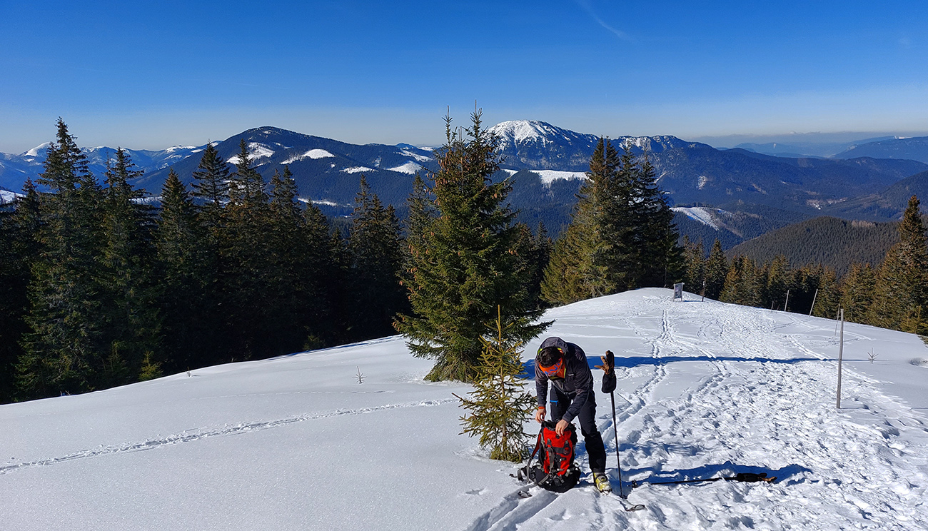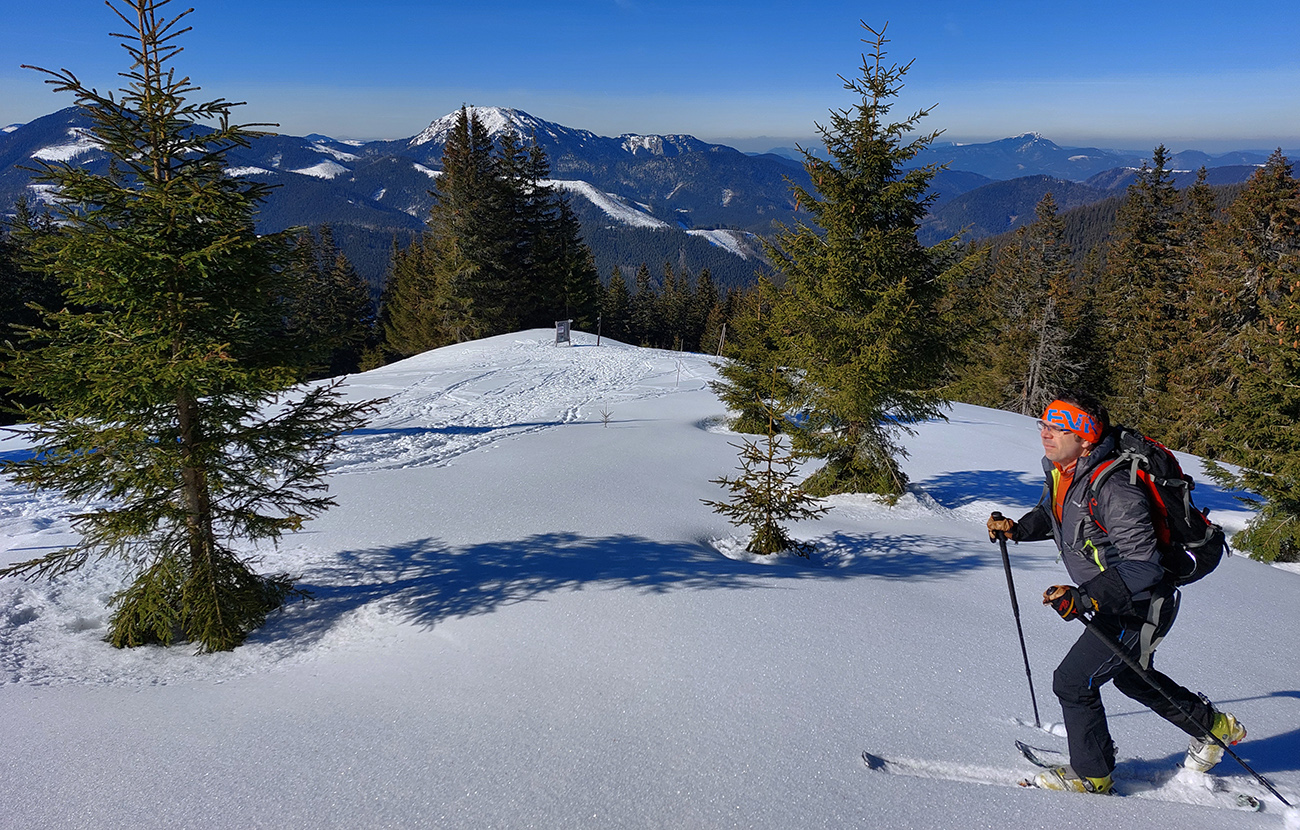 A tam samozrejme dilema, že kade hore. Zhodli sme sa napokon, že to vezmeme zľava a keď sa vyššie rozkukáme, uvidíme čo ďalej. Napokon sme to tam otočili dvakrát. Prvá jazda v parádnom prašane na tvrdom podklade, priamo do severu. Druhá trochu horšia o „zjazdovku“ vedľa, aj nejaké kôrky už za nohy ťahali, orientácia svahov už hrala podstatnú rolu. Ale slniečko sme videli po dlhej dobe konečne inak ako len cez okno pracovne, to bolo hlavné. A teplota ideál, aj vietor len osviežoval, nemrazil.