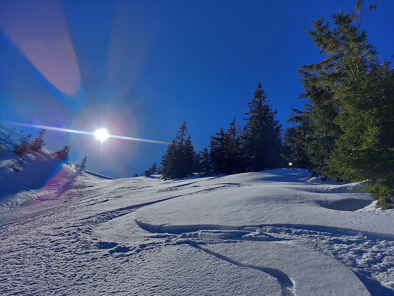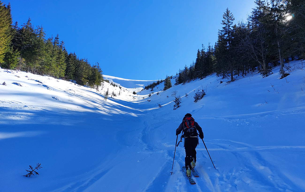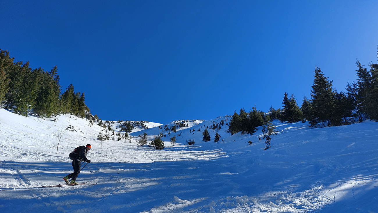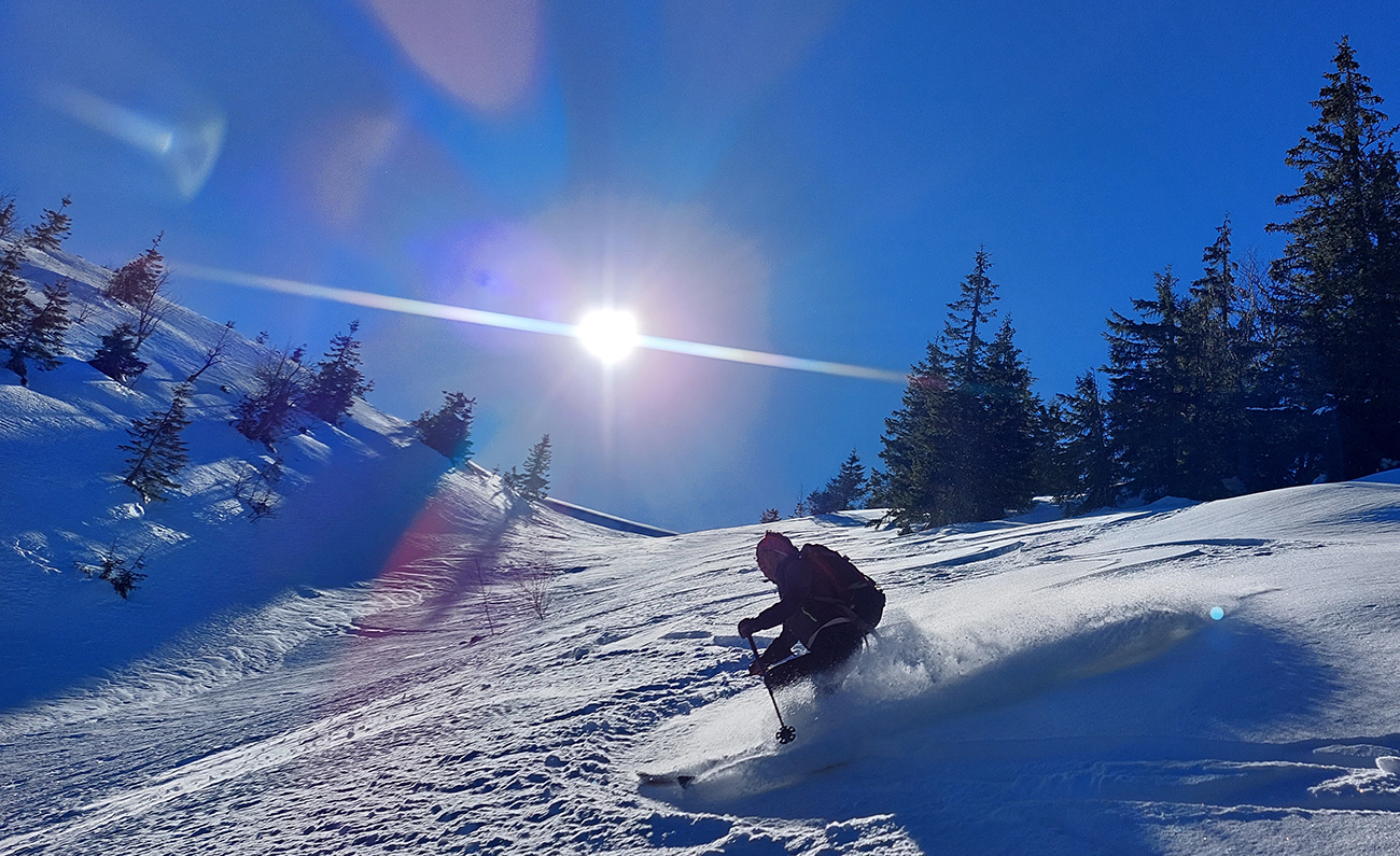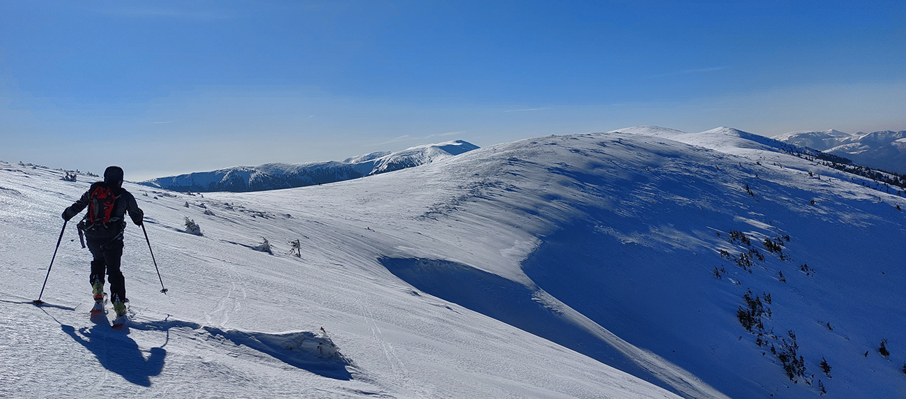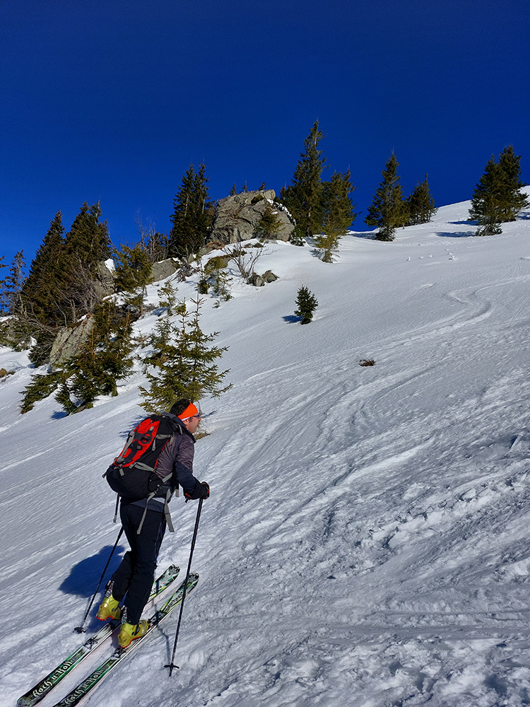 A tam samozrejme dilema, že kade hore. Zhodli sme sa napokon, že to vezmeme zľava a keď sa vyššie rozkukáme, uvidíme čo ďalej. Napokon sme to tam otočili dvakrát. Prvá jazda v parádnom prašane na tvrdom podklade, priamo do severu. Druhá trochu horšia o „zjazdovku“ vedľa, aj nejaké kôrky už za nohy ťahali, orientácia svahov už hrala podstatnú rolu. Ale slniečko sme videli po dlhej dobe konečne inak ako len cez okno pracovne, to bolo hlavné. A teplota ideál, aj vietor len osviežoval, nemrazil.