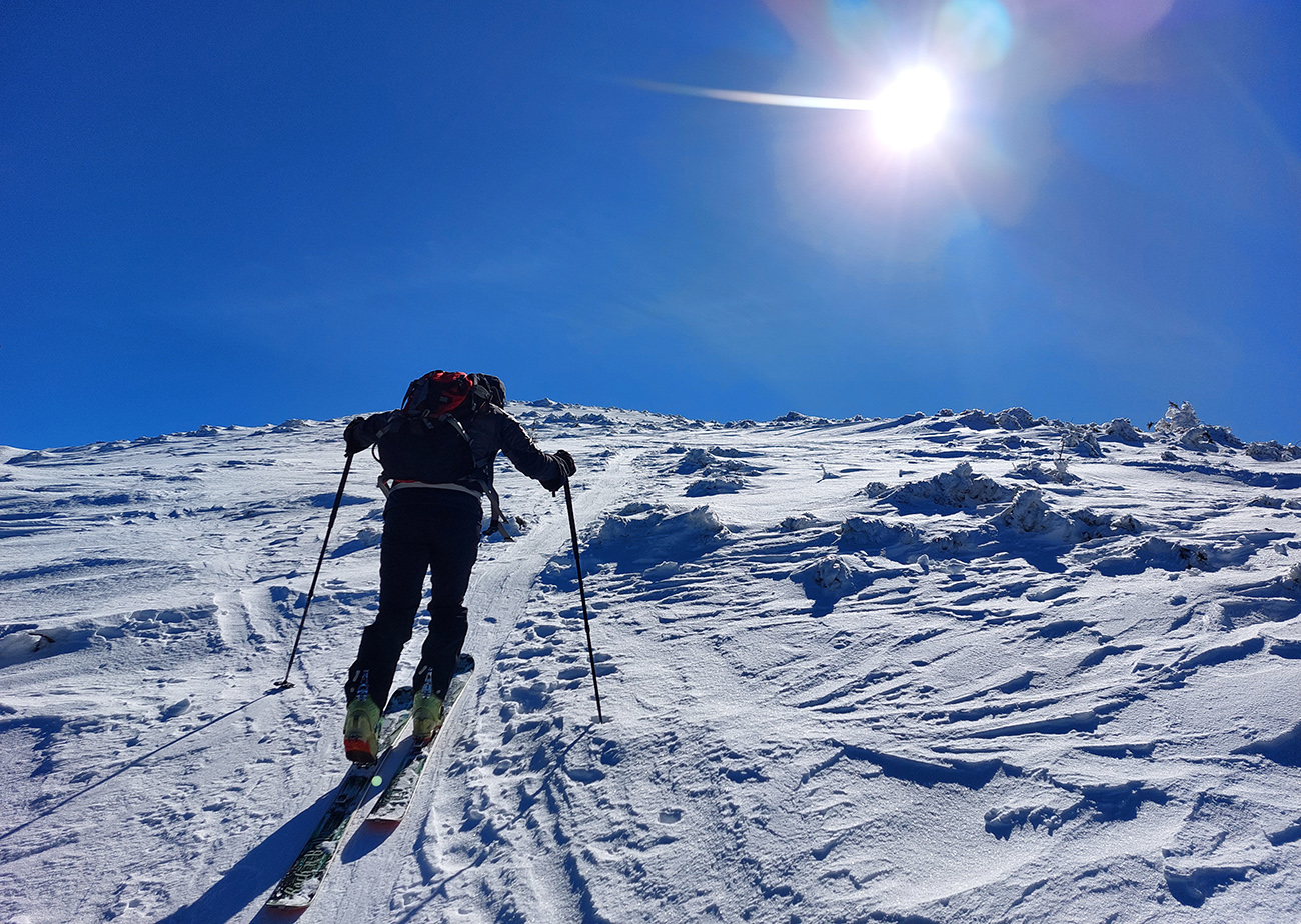 Tie dva kiláky po hrebeni nakoniec neboli až taká tragédia – síce ľadové vlny, šindle, hobliny, hrče a iné pásožravé patvary, ale nejako sme väčšinou pomedzi ne preštrikovali po zvyškoch aj po čerstvých náfukoch normálneho snehu. Do juhov sme ani nenakukli, tam to isto bolo mokré a inak hnusné. Niektoré nešťastnejšie časti hrebeňa už boli samozrejme do hneda, až fuj.