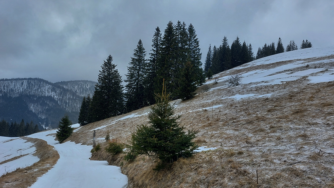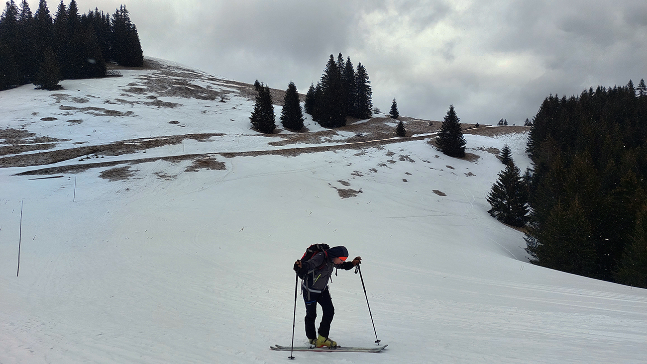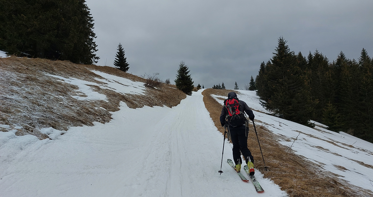 Napriek názvu boli podmienky aj hraničné, aj dobré. Ako je to možné? Tiež sme sa divili, aj keď tie hraničné podmienky dominovali. Ale že tam nájdeme aj prášok na pár oblúkov, to sme teda skoro neverili. Ale poporiadku. Prechádzajúci studený front v nedeľu 5.3. síce zabezpečil na víkend nevyhnutné zhoršenie počasia, jemné poletovanie snehových vločiek a trochu menej jemný severáčik, ale na druhej strane ešte nezabezpečil komfortné prekrytie na kameň zamrznutých, špinavých a hrboľatých firnov novým snehom. To hádam príde, predpoveď je sľubná. Brutálne teplá predošlých dní zase zabezpečili, že na južne exponovaných svahoch okolo Vtáčnika len tak – tak, že netreba lyže v rukách nosiť. Citlivejšie povahy asi aj nosia. Haršajzne sme nepoužili, no na niektorých miestach by trochu aj pomohli.