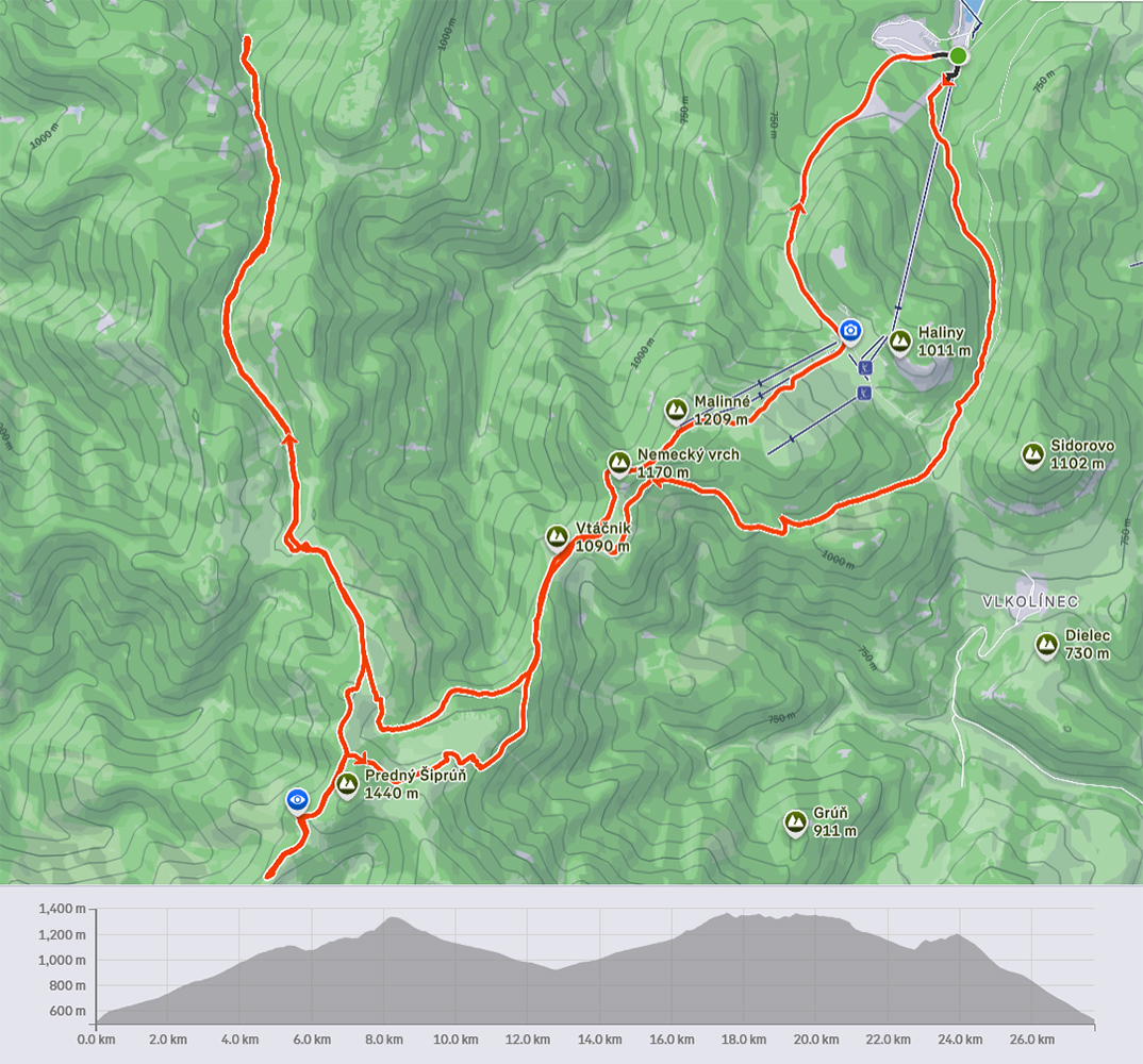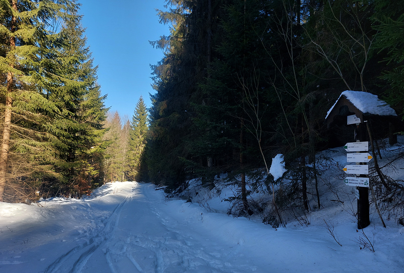 Pretože snehová nádielka z prelomu rokov po oteplení poriadne zamrzla a lyžovanie vo voľnom teréne nie je žiadna slasť, vymýšľal som niečo, kde by som sa mohol šúchať celý čas, najlepšie bez častého odliepania pásov. A tak som vymyslel toto – v „jadre výletu“ sklonom skôr bežkársky terén, lenže pod lyžami buď ľad, alebo sa to naopak prebáralo, takže skialpy tento raz vhodnejšie. Jednoduché to bolo: z Hrabova po Medvedej ceste na Vlkolínske lúky, Suchým Hrabovom pod Vtáčnik, traverzom cez záver Čutkovskej doliny a popod Nižné Šiprúnske sedlo na lúky pod Tvarožným grúňom, dole po žltej dolinou Bystrého potoka a s nejakými zachádzočkami a obmenami nazad: