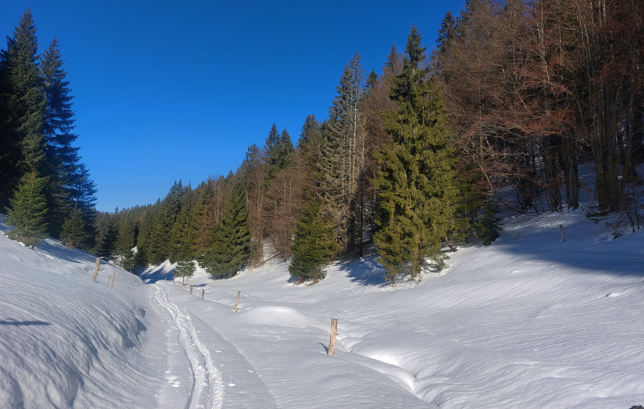 Dole dolinou zopár hlbších stôp, ako zo dva páry lyží dole šmýkali predo mnou, asi ešte „za mäkších podmienok“. Tak som s radosťou využil, že sa cestou nazad nebudem musieť až tak pretláčať s podkladom. Dolinka pekná, snehu dosť, otočil som to „Na jame“, kde sa pripája cyklotrasa z Čutkovskej doliny. Stopy pokračovali tým smerom, ono by sa to v podstate asi aj dalo pekne zokruhovať – buď cez Čutkovskú nazad pod Vtáčnik, alebo z Čutkovskej aj ďalej, až do Hrabova. Snehu v tých severných polohách jesto.