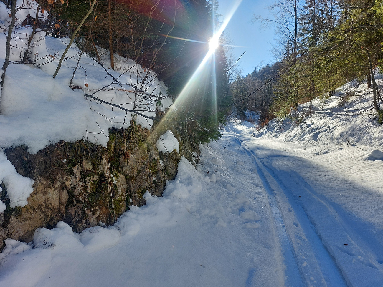 Čiže: sneh državý, zmrznutý, takže na Medvediu cestu som sa vydriapal priamo po cyklotraili popod lanovku. Medvedia cesta vytvrdená skoro na korčule, do ligotava. Smerom dole by to poriadne svišťalo, ale brzdiť nie je problém, pirane vidno.