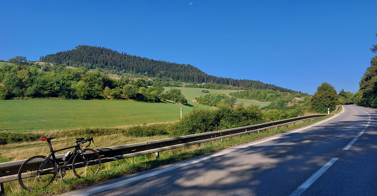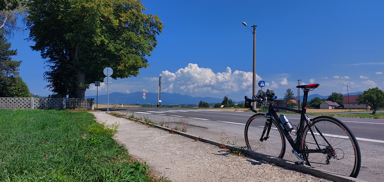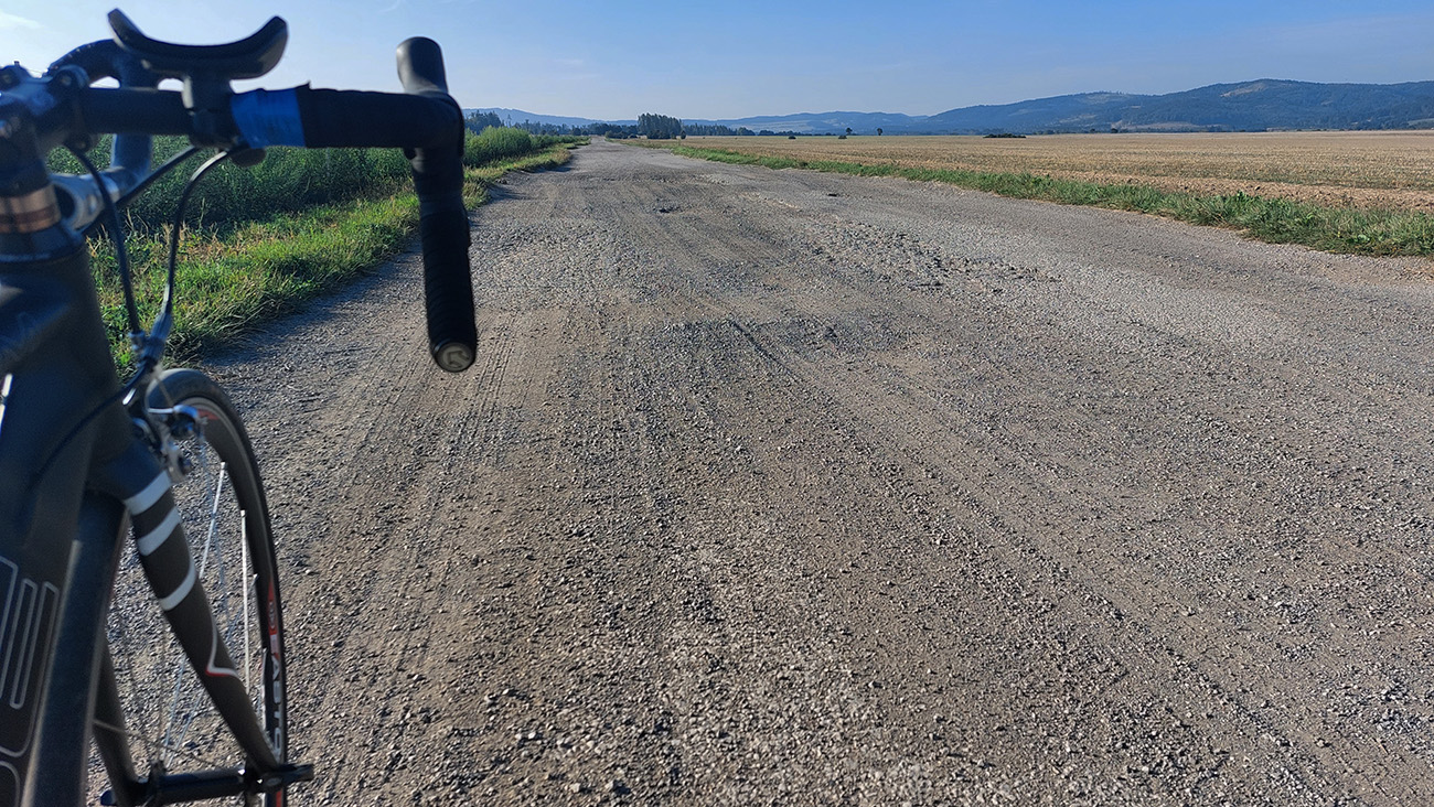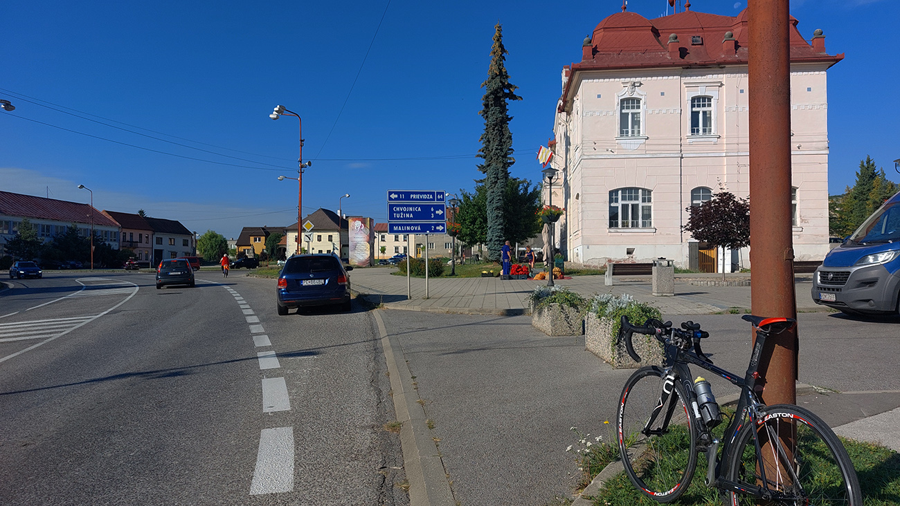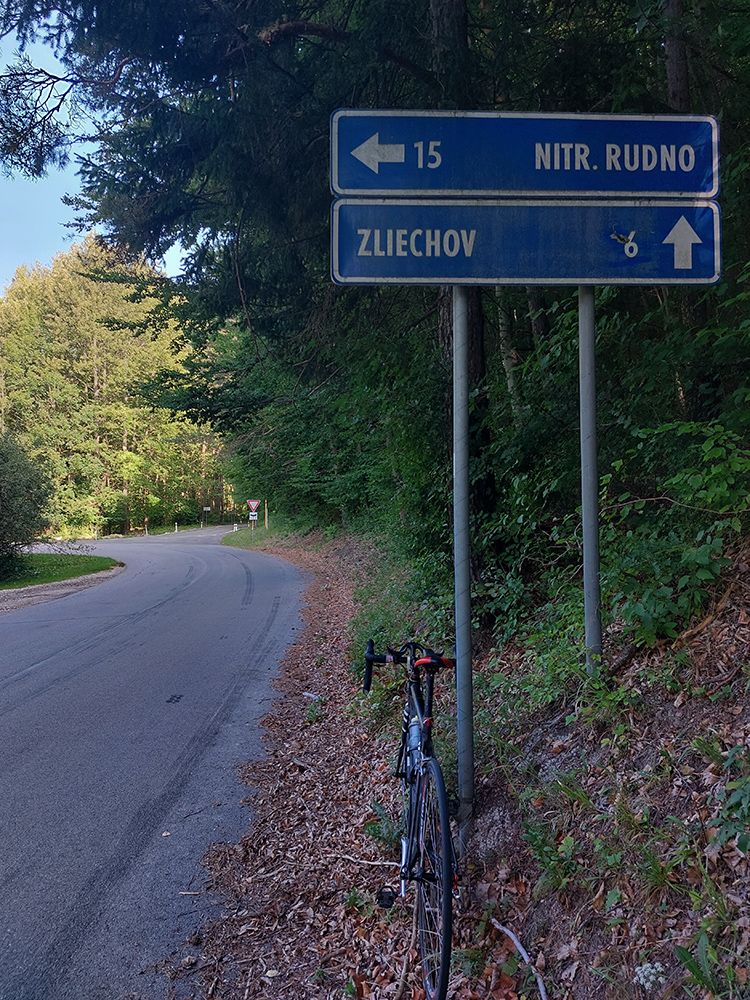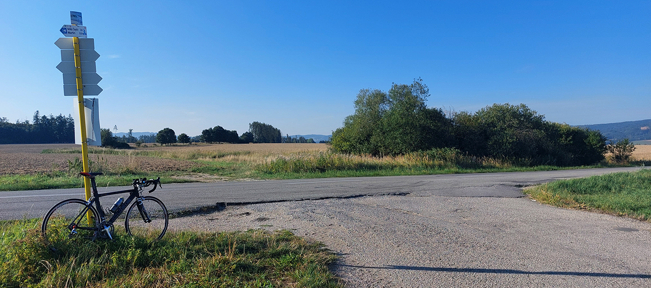 Takže začiatok a koniec v Ležiachove pri cintoríne. Žiadna morbídna symbolika, je to pre mňa len taký dobrý „logistický“ bod, lebo tu často tankujem bidóny a je tu dosť miesta na zastávke pri ceste. A dnes tu ten okruh aj uzavriem. Príjemne vlažné ráno, síce pracovné, ale v strede prázdnin, tak cestou do Moškovca ešte nie je moc premávka. Fičí južný, tak si „líham do nadstavcov“, nech to mám čím skôr za sebou. Lebo krajnica tu prakticky neexistuje a dlhé rovinky šoférov zvádzajú... V Moškovci prvá modifikácia oproti origo okruhu: ani doprava na PD, ani doľava na TR, ale stredom po „cezpoľnej“ asfaltke:
