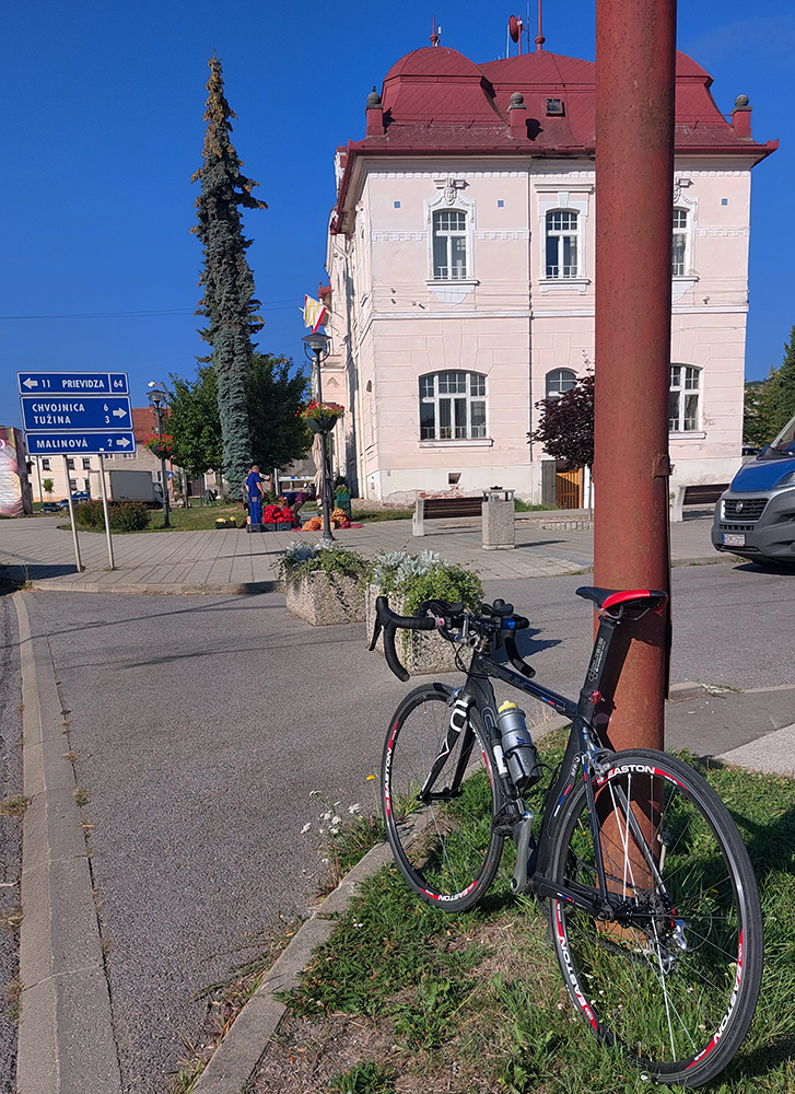 Zjazd na turčiansku stranu je strmo krátky a trochu hrboľatý len hore v lese, potom paráda, ako sa to otvorí na lúky, do doliny Vríce. Podchádzam hrad Zniev, ale je presne pod slnkom, tak z fotiek nič. Na (takmer) záver teda ešte prejazd cez Kláštor pod Znievom, čerstvú dedinu roka 2021. Na 100 km zaokrúhľujem takmer presne pri budove Prvého slovenského gymnázia a zároveň sa dozvedám, že Slovenské Pyreneje naozaj zase budú (20. – 21. augusta), a to rovno okrúhly 60. ročník, paráda! To chce kofču na oslavu a tu na námestí je kde posedieť, najmä takto v lete.