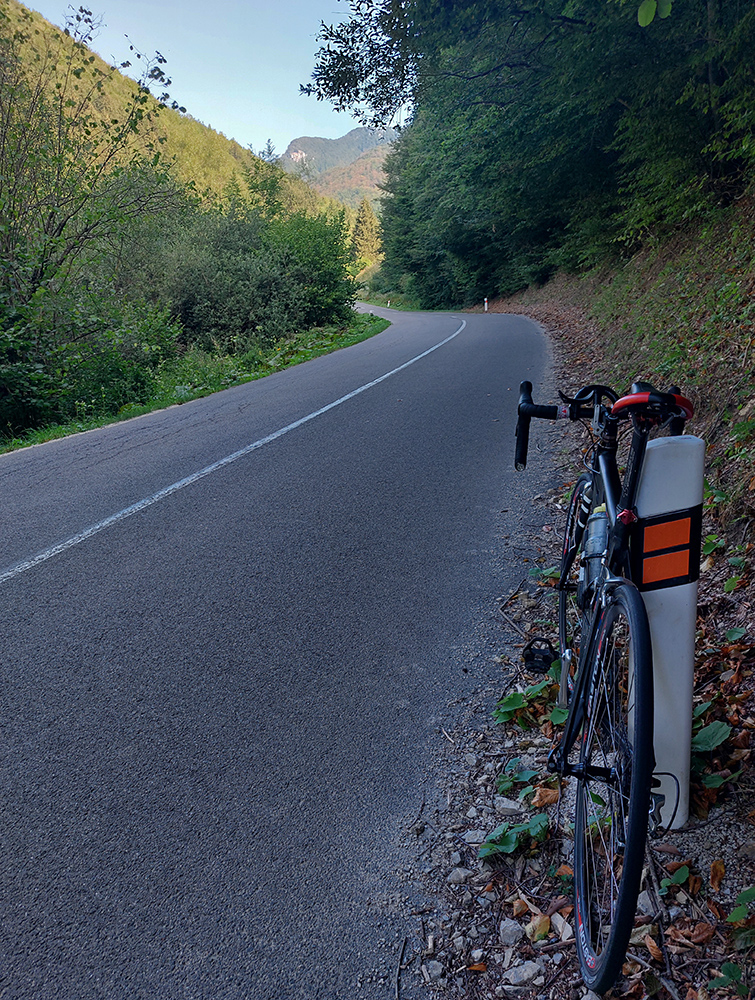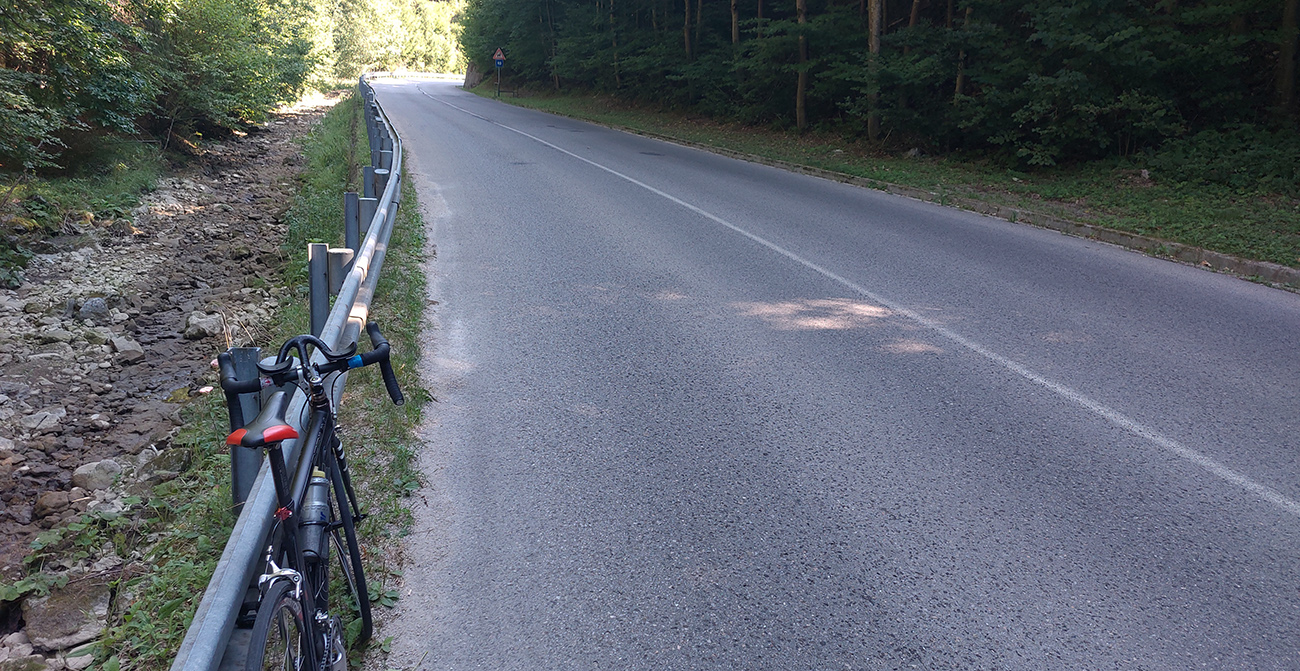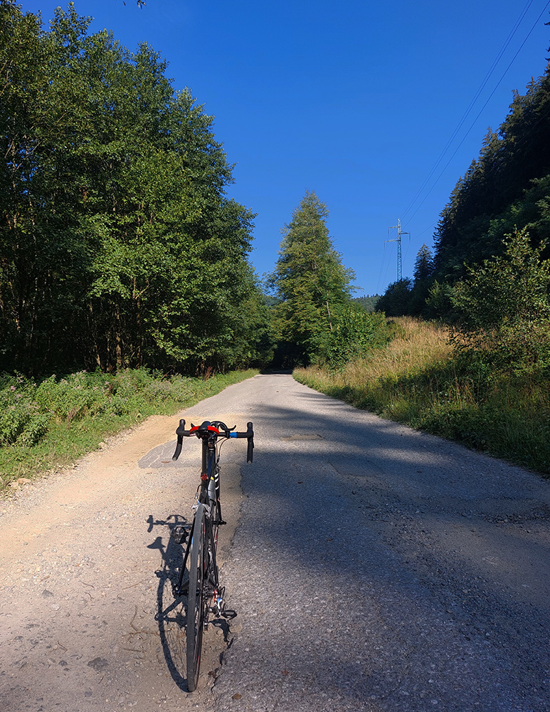 Takže skratka vybavená, nasleduje už len krátky, stále hladučký zjazd po širokej ceste na križovatku a napájam sa na klasický okruh. Čaká na mňa skoro šesť kilákov do kopca, nad Zliechov, pod Strážov. Jeho bralá párkrát cestou hore preblesknú nad stromami, ale nie je veľmi čas obdivovať, lebo cesta sa poriadne „zvýživňuje“. Ten pocit, keď už to lámem na najľahšom prevode a predo mnou sa cesta ešte viac postaví... Ešte že aj tu už je asfalt hladučký: