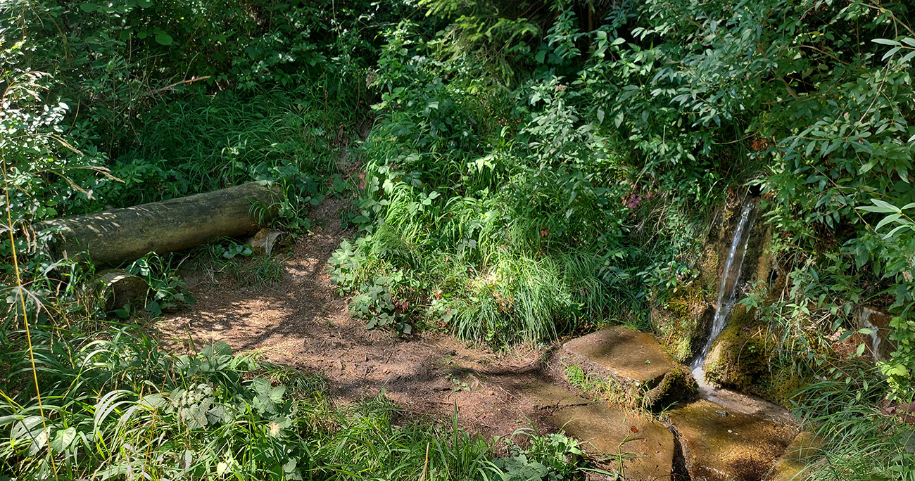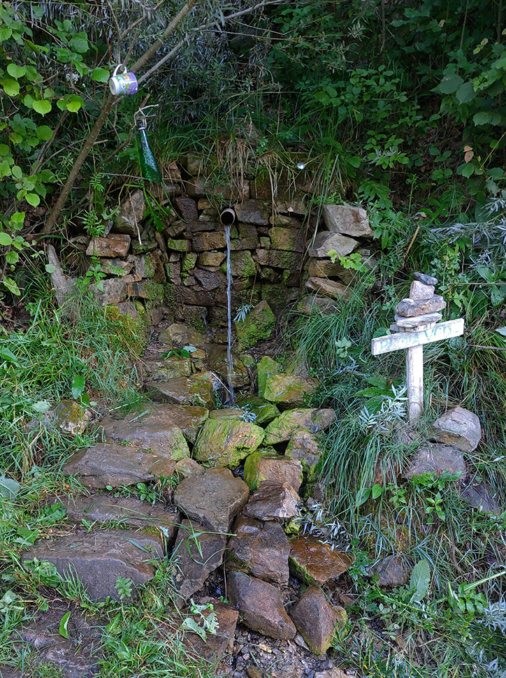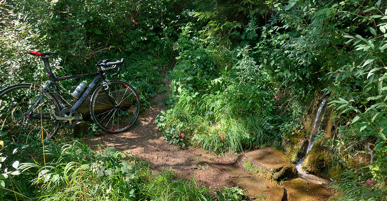 Tak hrkocem hore dolinou, tu je asfalt nie veľmi hladký. Aj preto tadeto chodím najradšej týmto smerom. Čerstvé záplaty smrdia a sú to len také fliačiky, cestu ešte viac zhrboľatia. Zato ale ma prekvapuje parádny prameň hneď pri ceste, alebo asi skôr prepad z toho vodojemu nad ním. Trochu ukrytý v kroví, len vodu počujem cvrčať. Možno preto som si ho doteraz nikdy nevšimol? Má ideálnu polohu, akurát mi začína dochádzať voda. Na túto čerstvú dôjdem až domov, ani ležiachovský cintorín mi nebude treba :-)