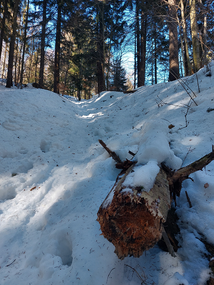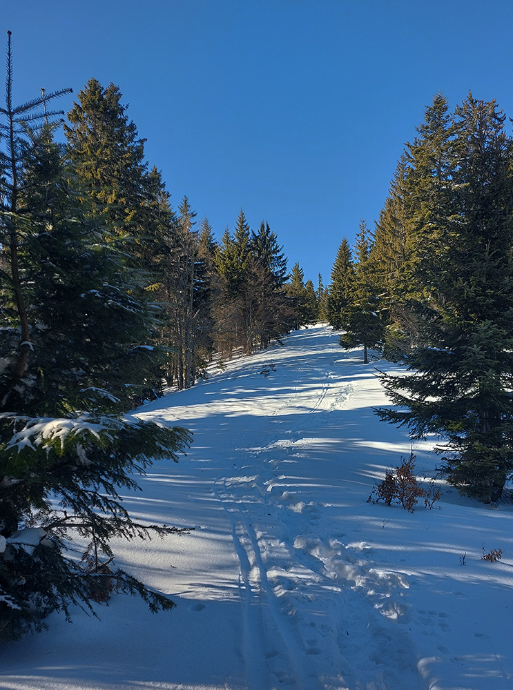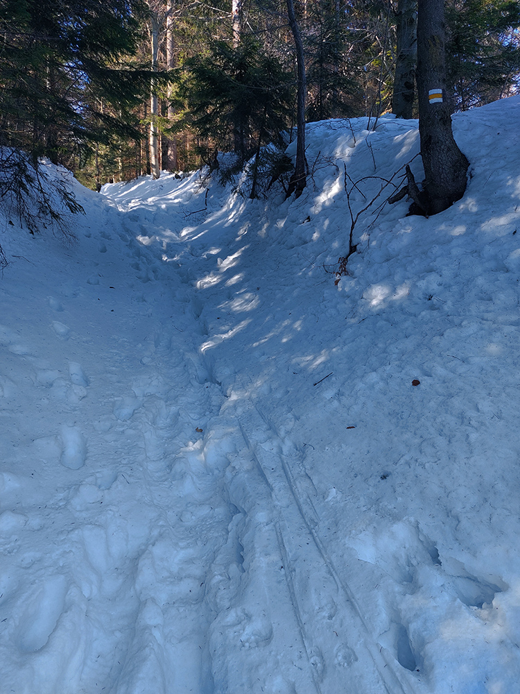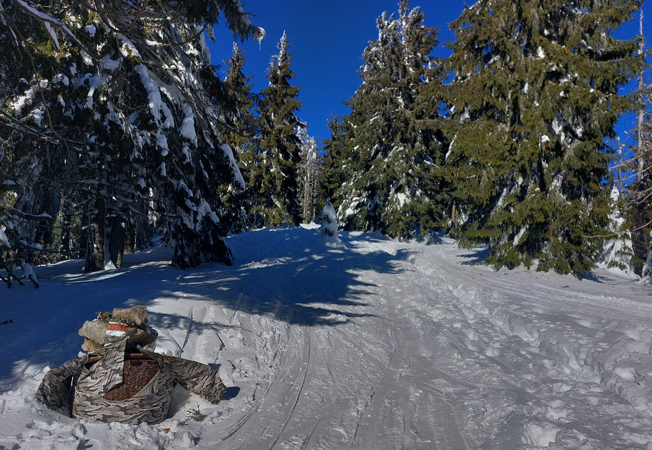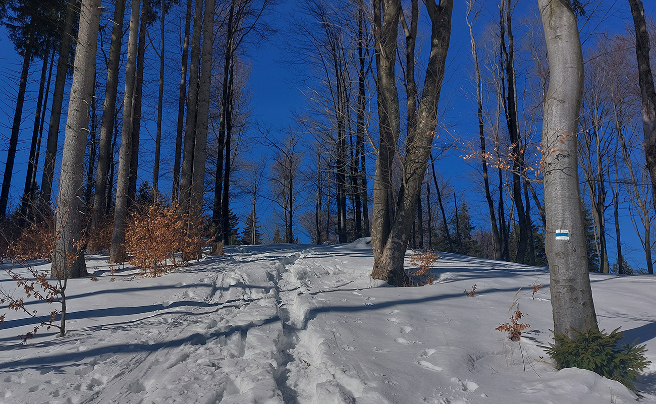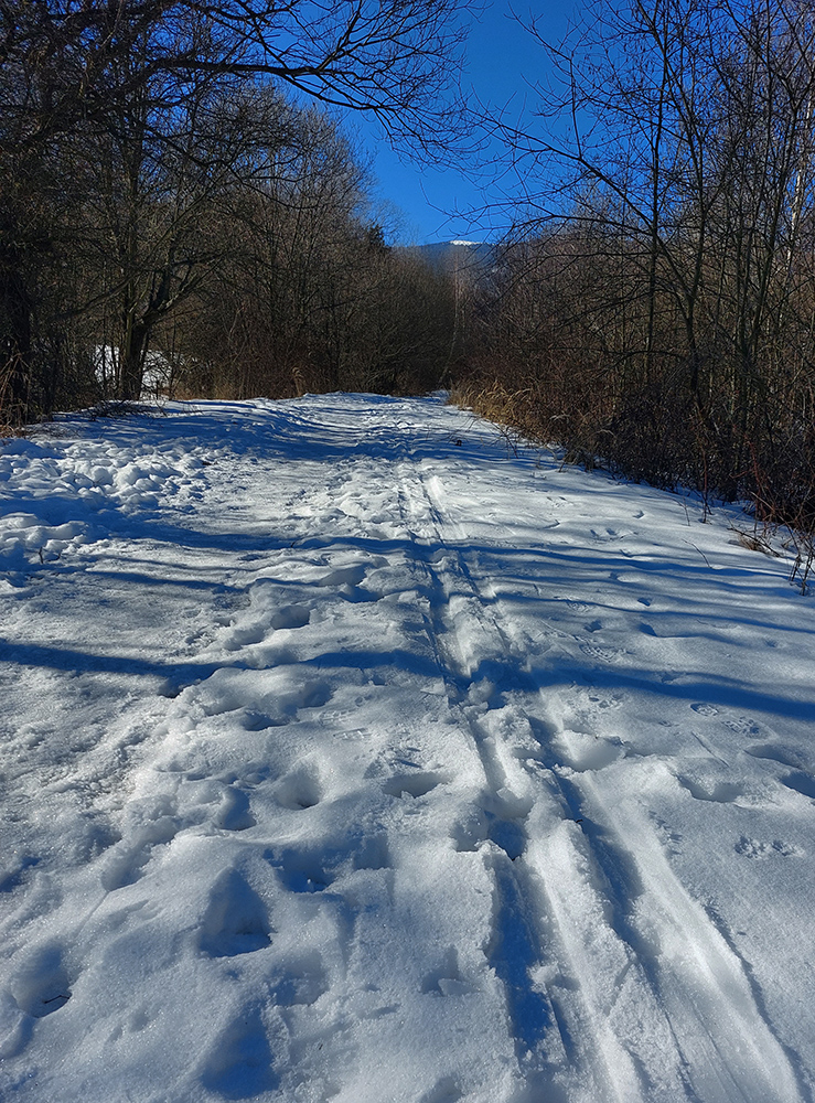 Takže modrá: v pohode od smerovníka „Ústie Kamennej doliny“, tam sa dá aj zaparkovať, ak tam lesáci nenaťahajú drevo. Nižšie potom až na otočke spomenutej emhádé. Len treba skočiť cez potok a bordel po ťahaní stromov, potom už len do lyží. Tam sa dá v pohode aj zlyžovať lesom, toľko tam je snehu. Drsného, zmrznutého. Zatiaľ. V úvodnom stúpaní na križovatku zvážnic v riedkom lese čisto pod nohami, potom v strmšom a užšom pod Diaľnou majú pešiaci aj šliapači pekne svoje vlastné stopy, a vlastne tak až hore. Dole tvrdý šmirgeľ, hore na ňom vrstvička čerstvého poprašku, ktorý už okolo obeda na slnku vlhol.