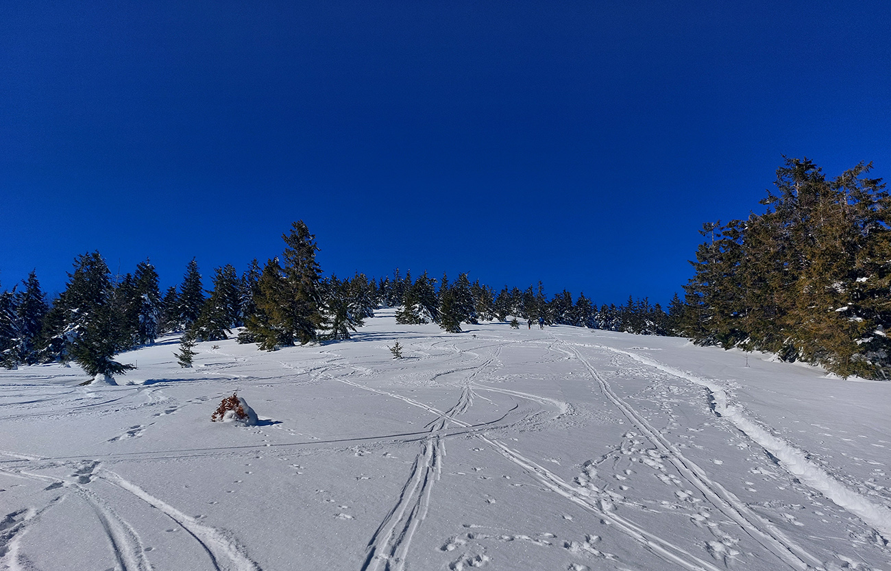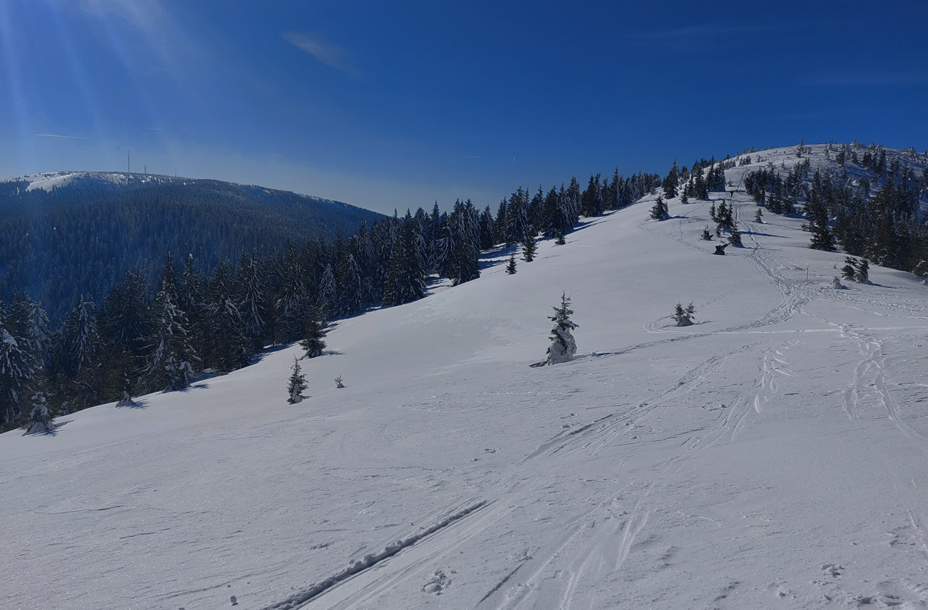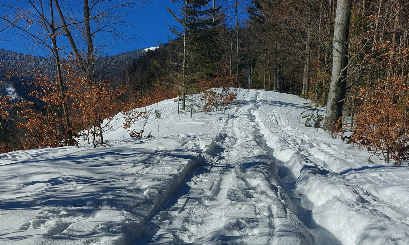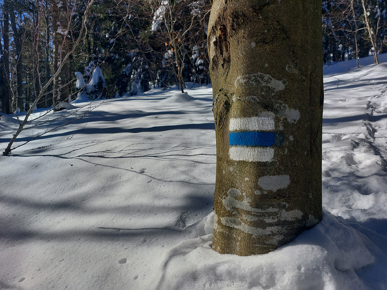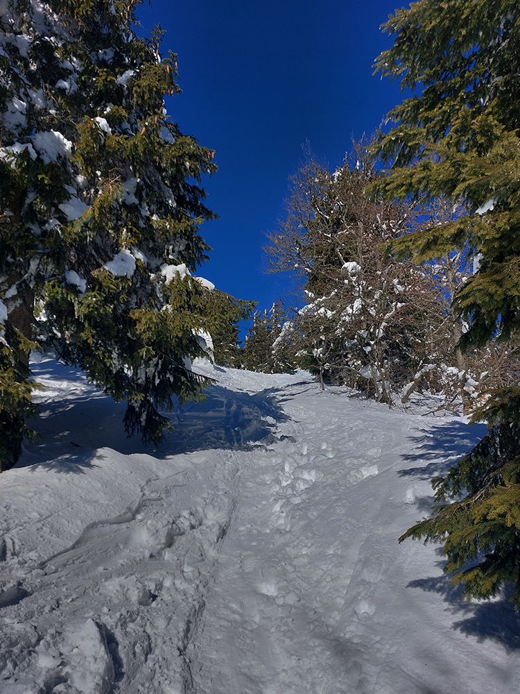 Takže modrá: v pohode od smerovníka „Ústie Kamennej doliny“, tam sa dá aj zaparkovať, ak tam lesáci nenaťahajú drevo. Nižšie potom až na otočke spomenutej emhádé. Len treba skočiť cez potok a bordel po ťahaní stromov, potom už len do lyží. Tam sa dá v pohode aj zlyžovať lesom, toľko tam je snehu. Drsného, zmrznutého. Zatiaľ. V úvodnom stúpaní na križovatku zvážnic v riedkom lese čisto pod nohami, potom v strmšom a užšom pod Diaľnou majú pešiaci aj šliapači pekne svoje vlastné stopy, a vlastne tak až hore. Dole tvrdý šmirgeľ, hore na ňom vrstvička čerstvého poprašku, ktorý už okolo obeda na slnku vlhol.