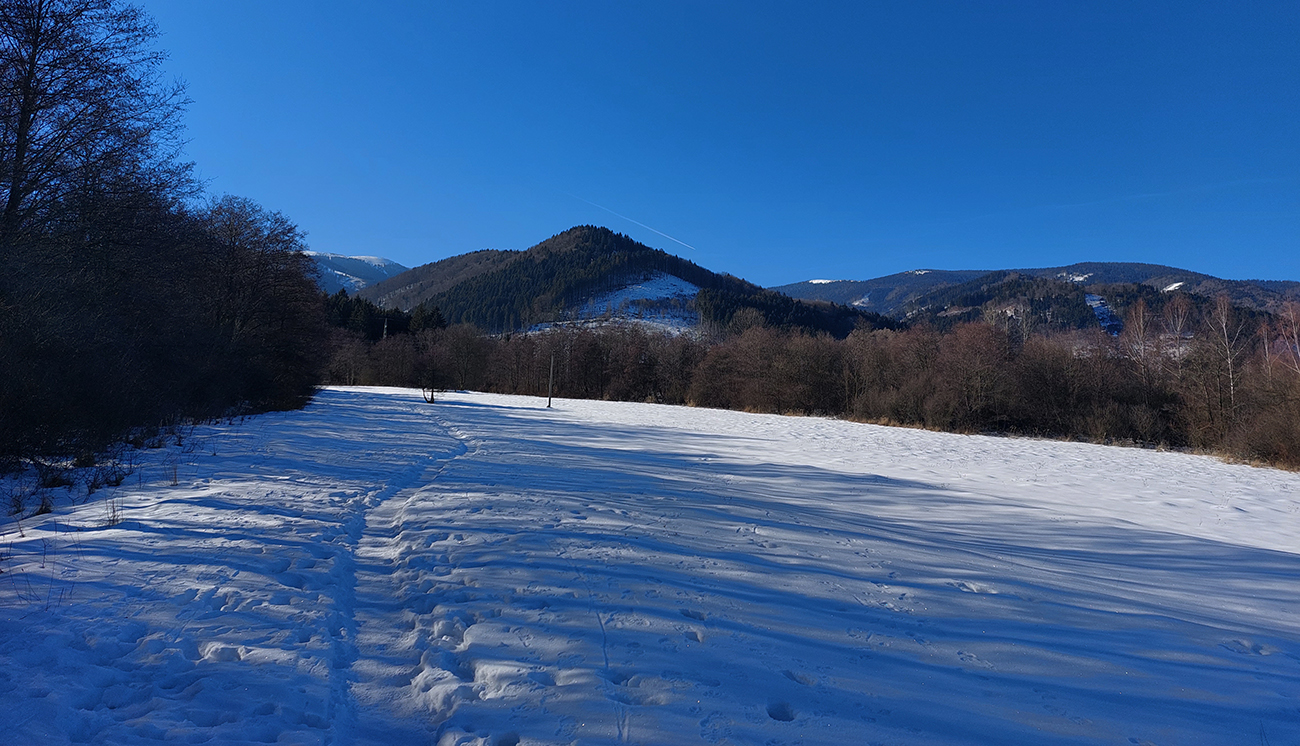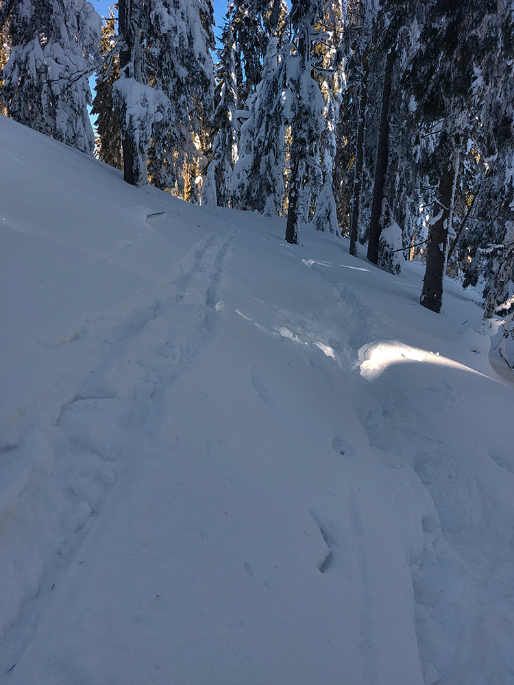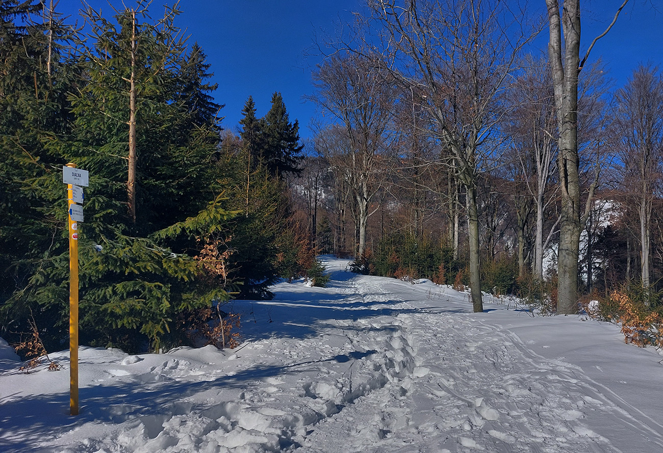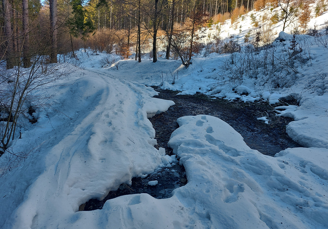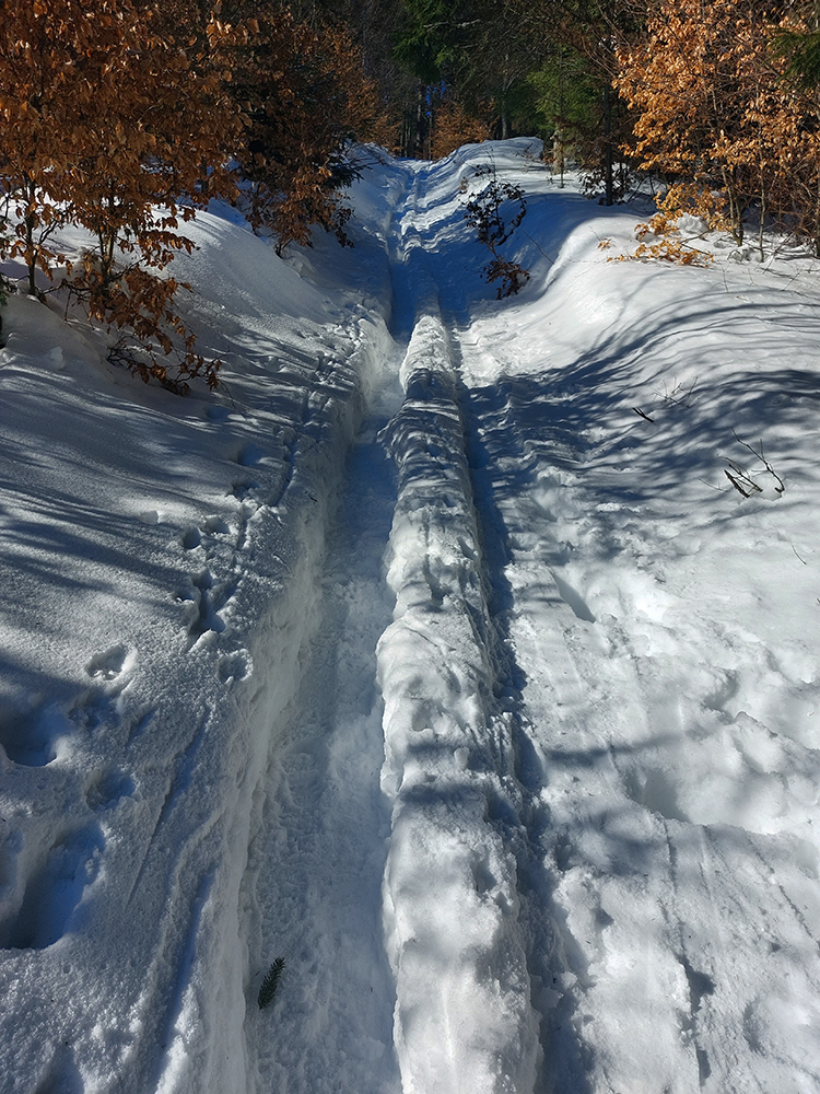 Takže modrá: v pohode od smerovníka „Ústie Kamennej doliny“, tam sa dá aj zaparkovať, ak tam lesáci nenaťahajú drevo. Nižšie potom až na otočke spomenutej emhádé. Len treba skočiť cez potok a bordel po ťahaní stromov, potom už len do lyží. Tam sa dá v pohode aj zlyžovať lesom, toľko tam je snehu. Drsného, zmrznutého. Zatiaľ. V úvodnom stúpaní na križovatku zvážnic v riedkom lese čisto pod nohami, potom v strmšom a užšom pod Diaľnou majú pešiaci aj šliapači pekne svoje vlastné stopy, a vlastne tak až hore. Dole tvrdý šmirgeľ, hore na ňom vrstvička čerstvého poprašku, ktorý už okolo obeda na slnku vlhol.