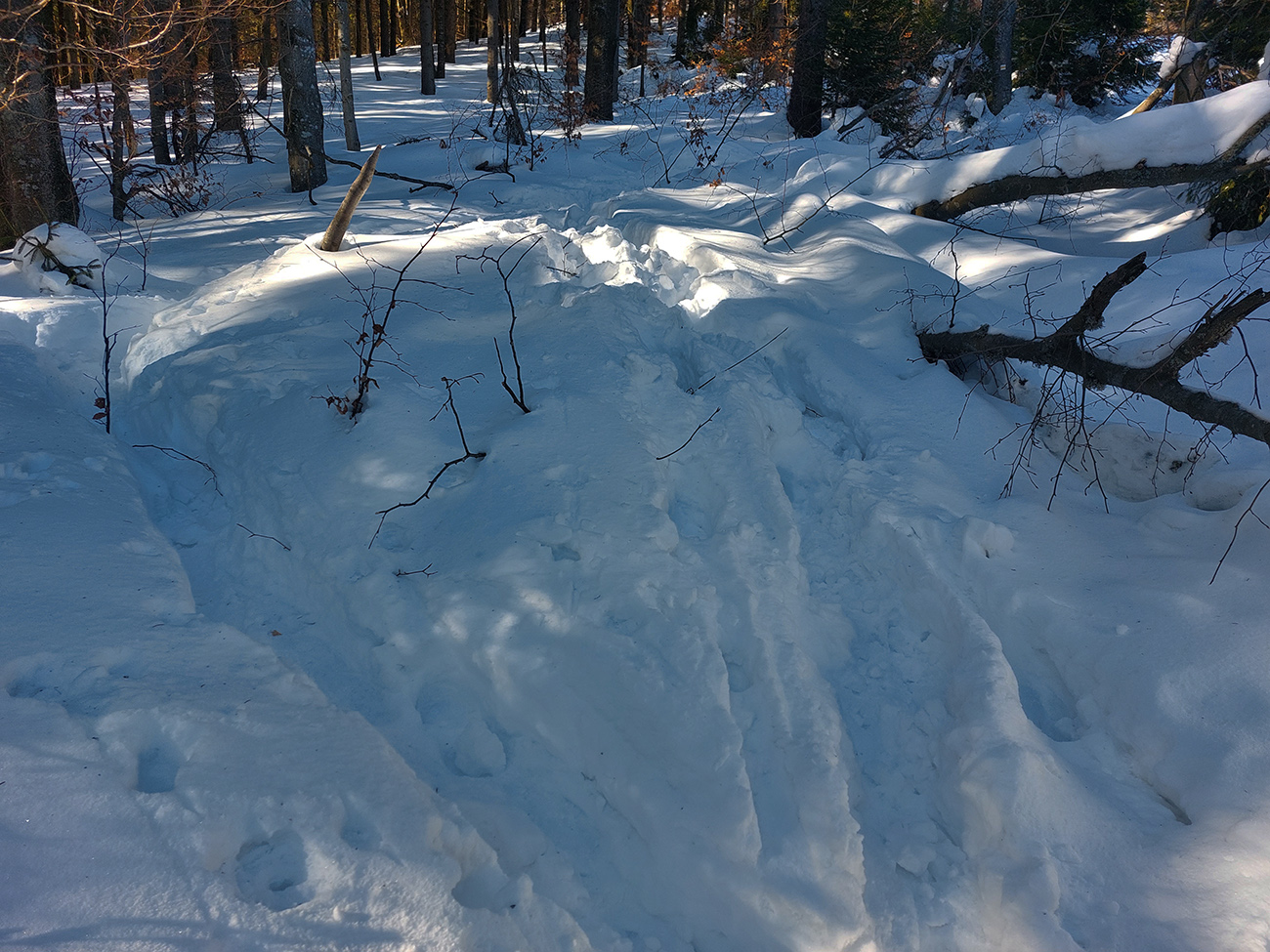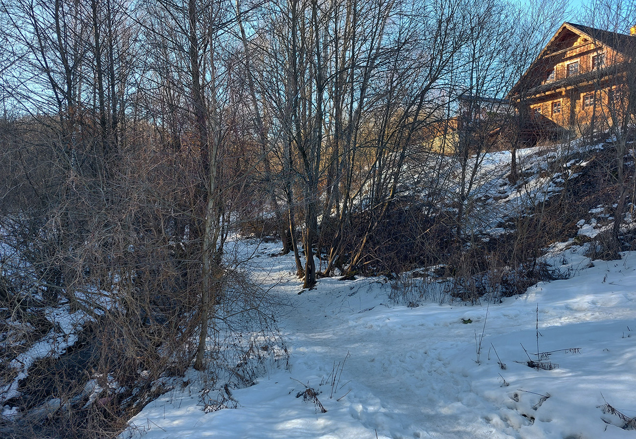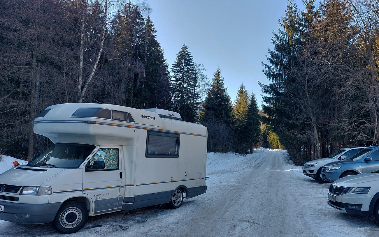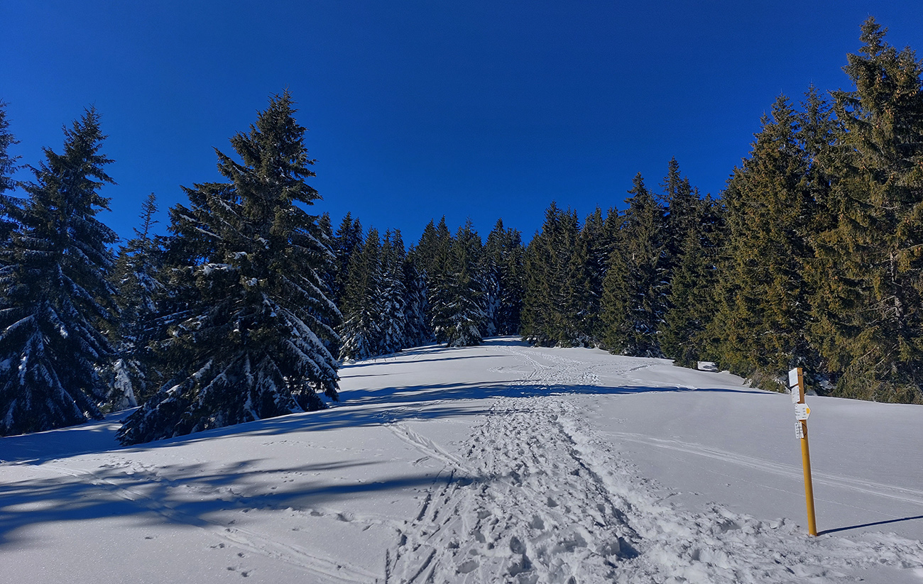 Takže modrá: v pohode od smerovníka „Ústie Kamennej doliny“, tam sa dá aj zaparkovať, ak tam lesáci nenaťahajú drevo. Nižšie potom až na otočke spomenutej emhádé. Len treba skočiť cez potok a bordel po ťahaní stromov, potom už len do lyží. Tam sa dá v pohode aj zlyžovať lesom, toľko tam je snehu. Drsného, zmrznutého. Zatiaľ. V úvodnom stúpaní na križovatku zvážnic v riedkom lese čisto pod nohami, potom v strmšom a užšom pod Diaľnou majú pešiaci aj šliapači pekne svoje vlastné stopy, a vlastne tak až hore. Dole tvrdý šmirgeľ, hore na ňom vrstvička čerstvého poprašku, ktorý už okolo obeda na slnku vlhol.