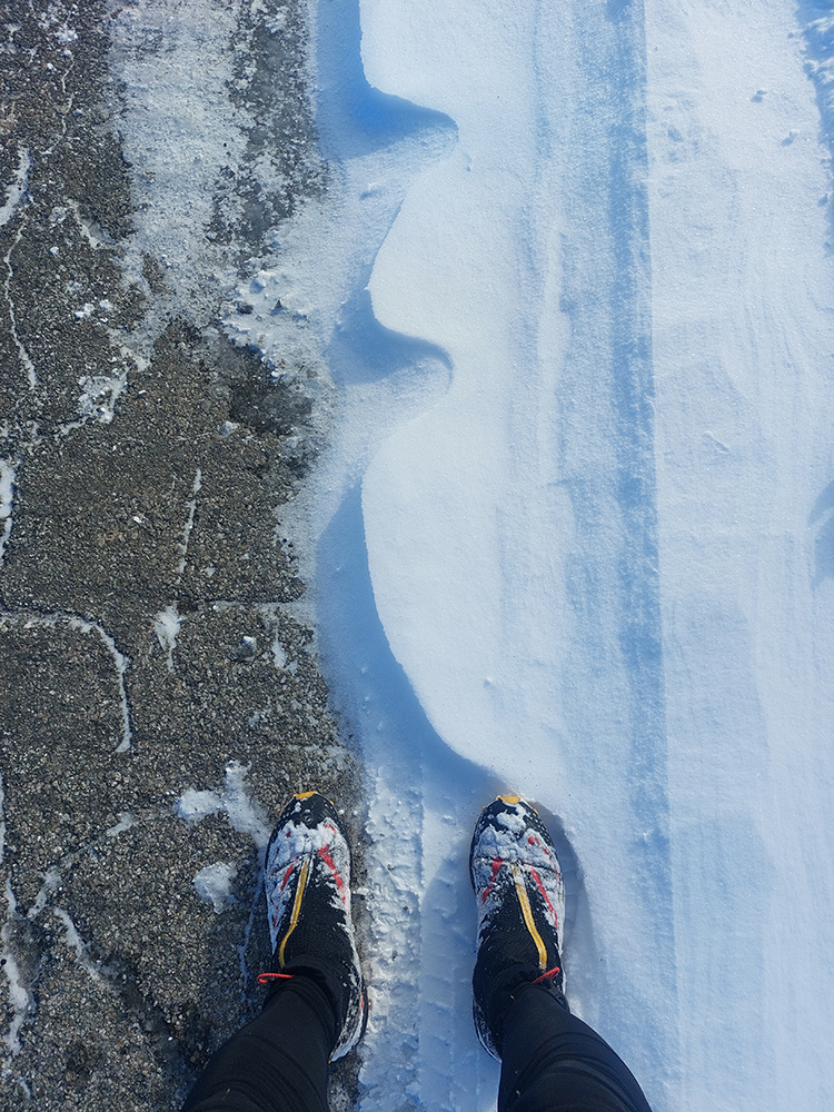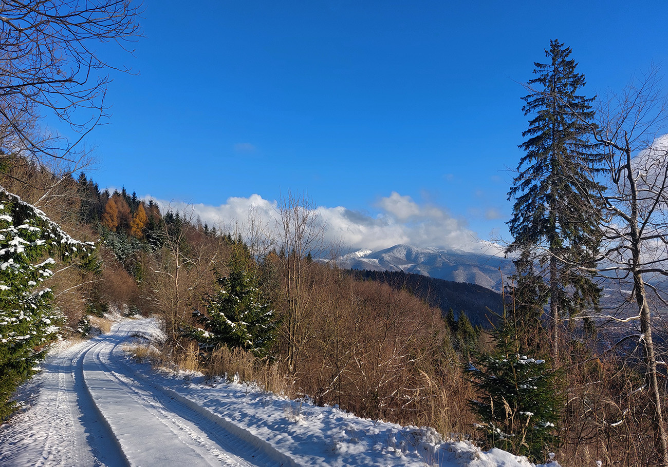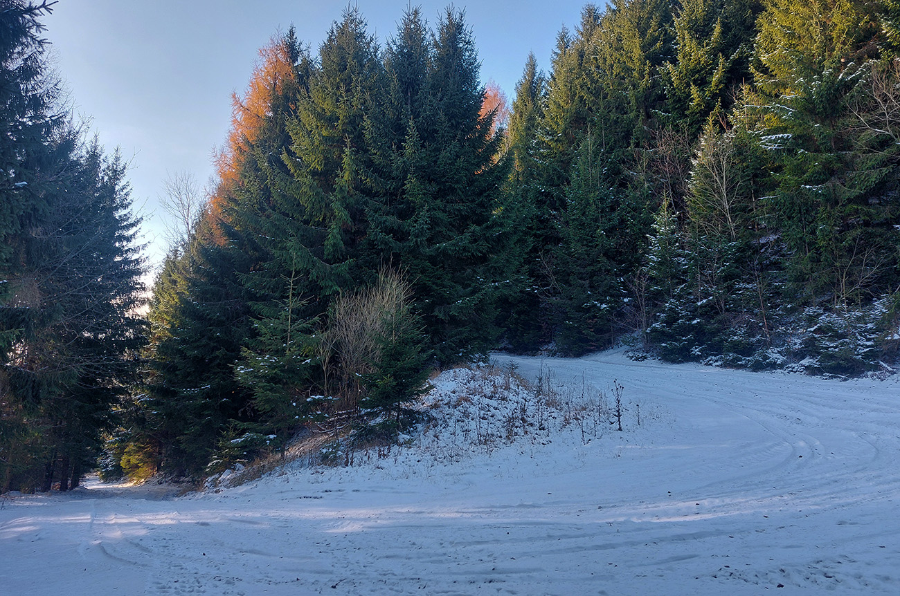 Pod Kalužnou: odtiaľ by sa dalo „od parkoviska“. Asfaltka odhrnutá, ujazdená, dalo by sa po pevnej bielej vrstve komfortne hore a opatrne hádam aj dole, isto aspoň po nižšie parkovisko pri Studničke..