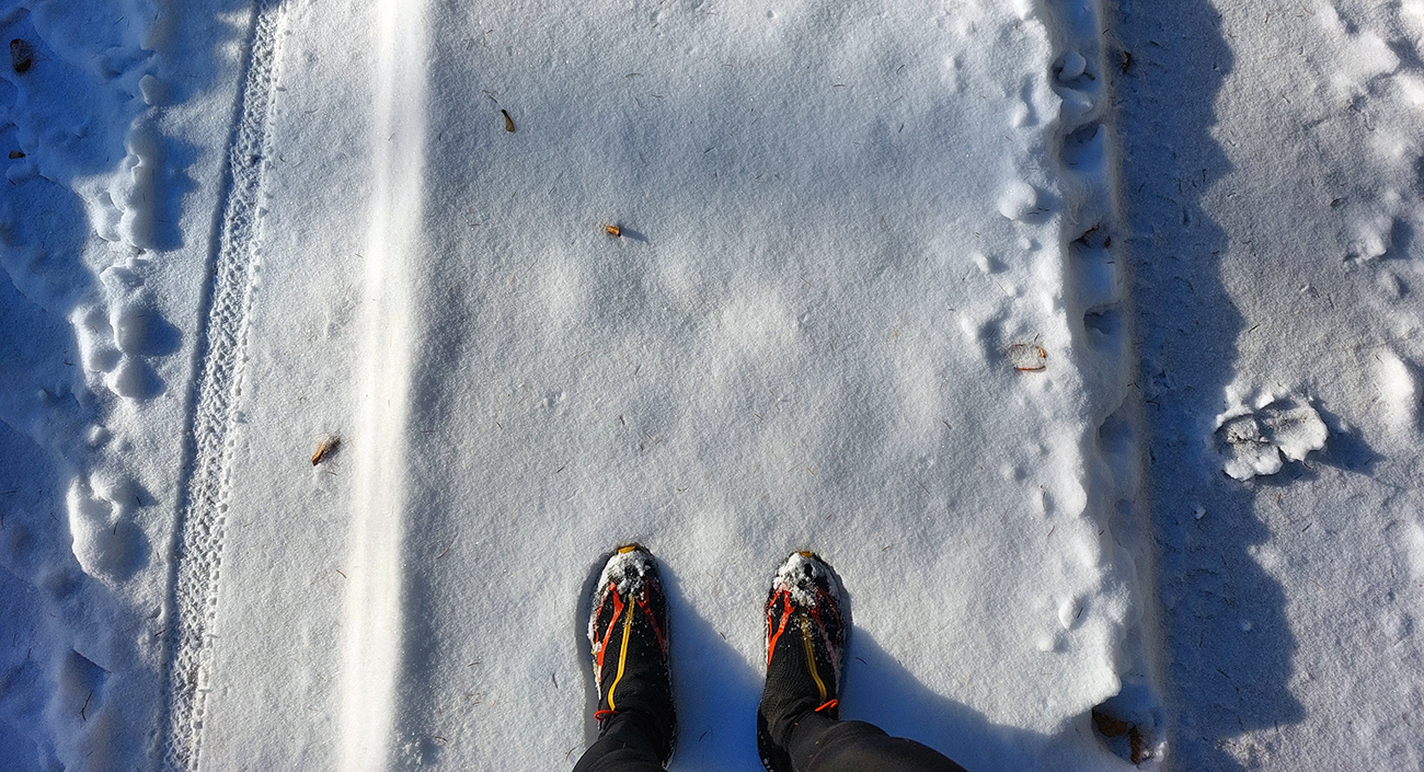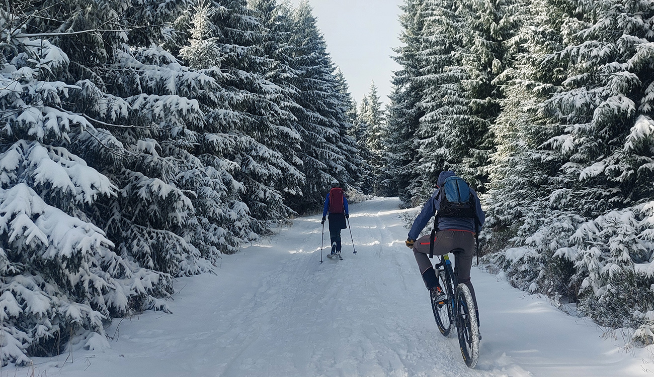 Po Medvedej ceste by sa opatrne na pásoch dalo mooožno aj od Investičky, takých 5 cm na zamrznutej hline, stredom to ide. Ale lepšie furt na bajku. Popri padaní aj fúkalo, tak tesne pred napojením na serpentíny viac tej hliny.