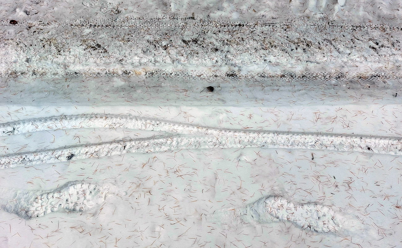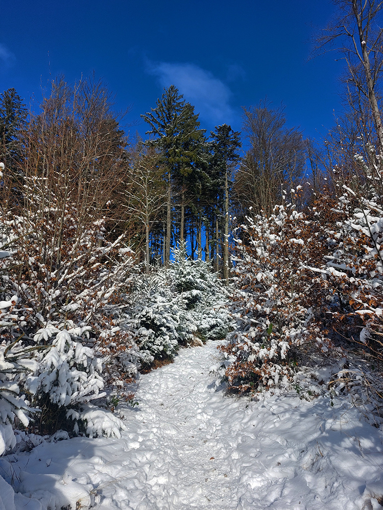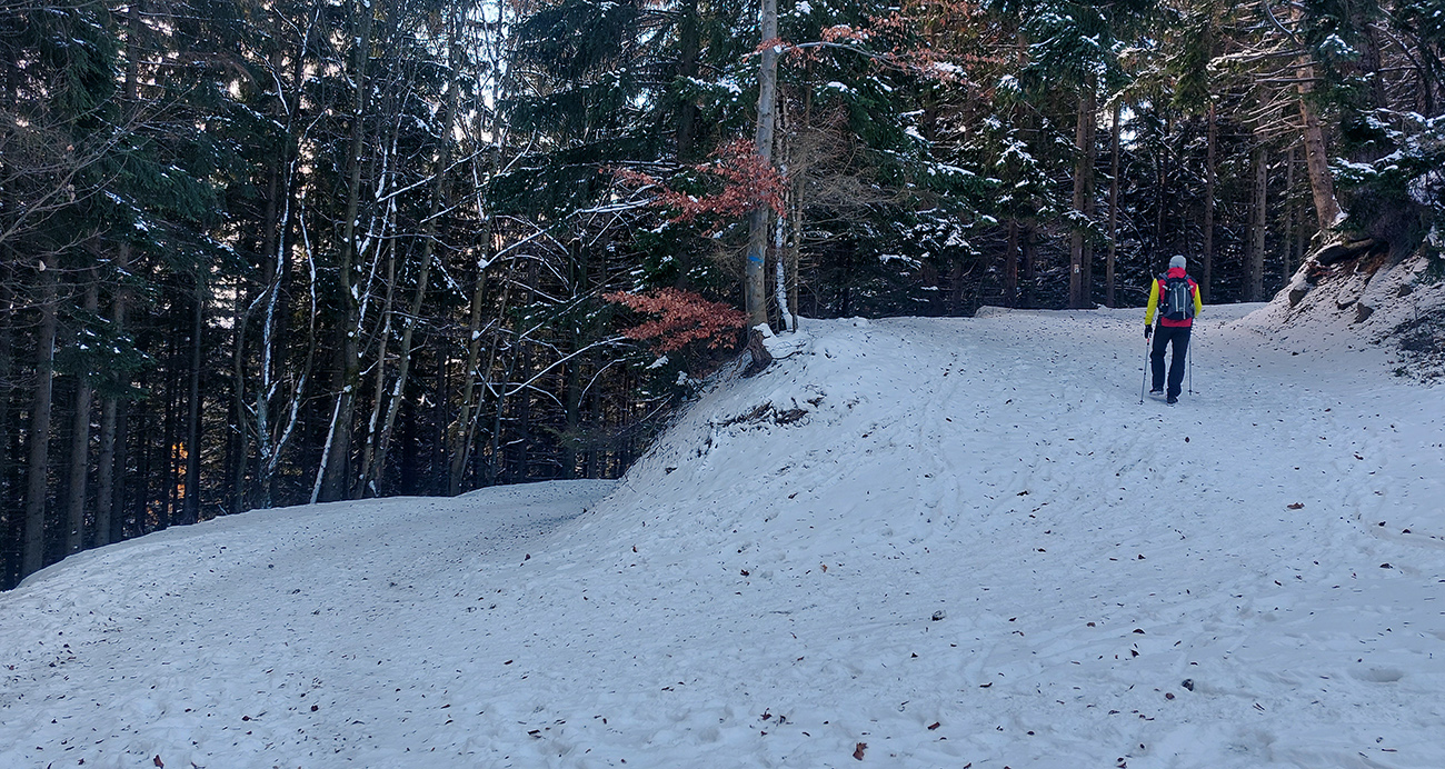 Taaakže: rýchly pohľad na radar a družicu – toto dlho nevydrží, treba ísť! Aspoň sa potešiť a zdokumentovať pre budúce generácie, aké záľahy snehu sme tu kedysi mali. Na lúkach nad mestom blatká trochu primrzli, tak sa chrumkavo stúpalo. Rampa ešte v letnom režime, čiže rampár žiadny, len značky, na ktoré každý kašľal ako vždy a autá chodili hore – dole, ako sa im zachcelo. Cesta síce široká, ale už pod snehom, tak bacha.