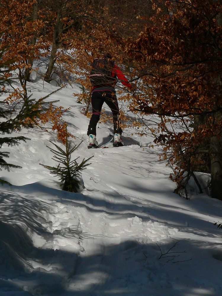 Po výleze na asfaltku pod Kalužnou: popri ceste, popri mantineloch sa dá, ale špinavo a kamienkami pomakované, pešiakmi rozchodené. Lepšie je preskočiť cestu a prekľučkovať pomedzi bukovú mladinu - stopa parádne natiahnutá a pešiaci majú vedľa vlastnú, tak je aj hladká. Vyššie v dospelom lese sa síce obe stopy spájajú, ale to už je na rovine a miesta dosť.