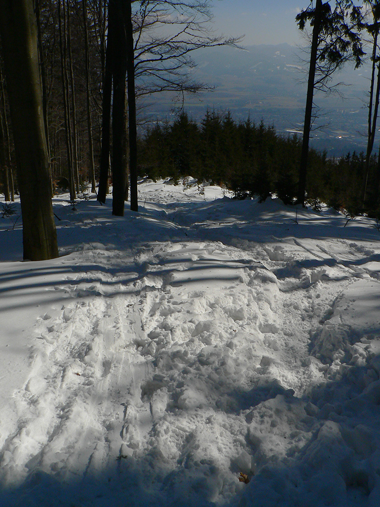 Po žltej (alebo radšej povedľa, lesom) už snehu hoodne ubudlo, ale stále sa dá komfortne, bez veľkého kľučkovania. Od smerovníka Ráztoky už snehu mrte, ale zase žiadna stopa, na chlpato tade už dlhšie nešiel nik. Zato pešia stopa tvrdá ako betón.