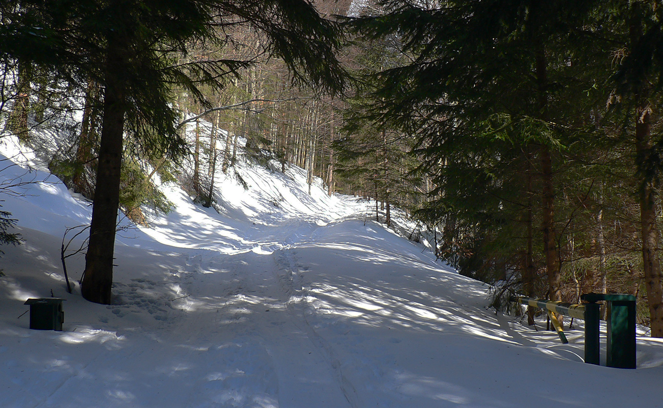 Podmienky sa odspodku postupne vinou denného tepla zhoršujú, ale len pomaličky, lebo v noci to mrzne na kosť a cez deň to (aspoň v tieni) veľmi nepovoľuje. Zo Strání: hneď od mostíka to síce vyzerá, ale radšej treba vyniesť takých 400 m za prvú zákrutu, vystavenú slnku. Tá je ešte celá vytopená, nedá sa to obísť (pod ňou tiež ešte treba na kúsku prenášať). Až nad ňou už pohoda definitívna, to jediné odtopené miesto nad prvou skratkou sa zatiaľ dá obísť. Potom aj vyššie, v tých strmších rovinkách pod delom, kde je síce čistý ľad, ale bez kameňov, sa prejsť dá. Hore aj dole - zatiaľ.