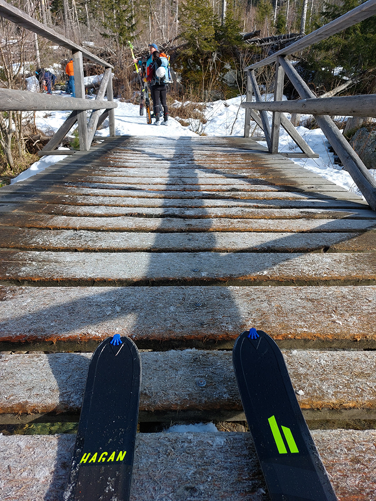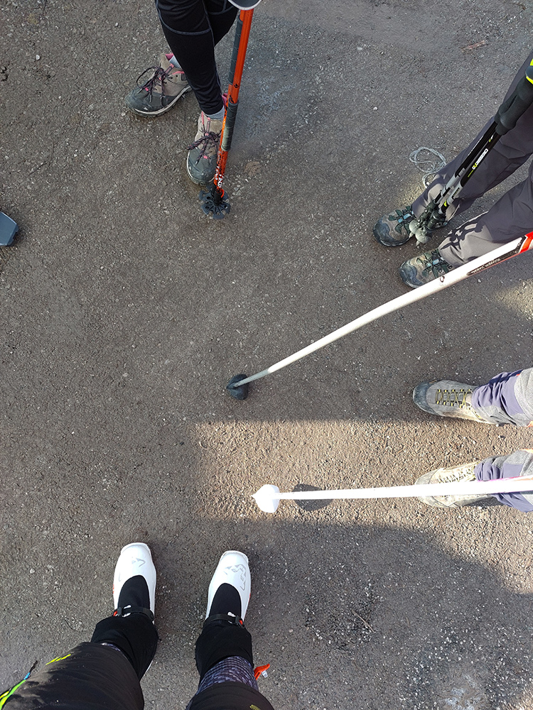 Do lyží sme optimisticky naskákali už na začiatku chodníka, hneď za „uzáverou“. Na to, že zosunutý chodník je zatvorený, celkom slušná premávka na ňom. Aj na lyžoch sa dalo, len potom sme ešte párkrát (až po serpentínu) krátko prenášali. Ale je to na mnohých miestach už len tak – tak. Chce to pevné nervy a málo lásky k pásom na miestach, kde sa to „horšie kĺže“.