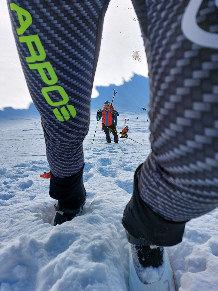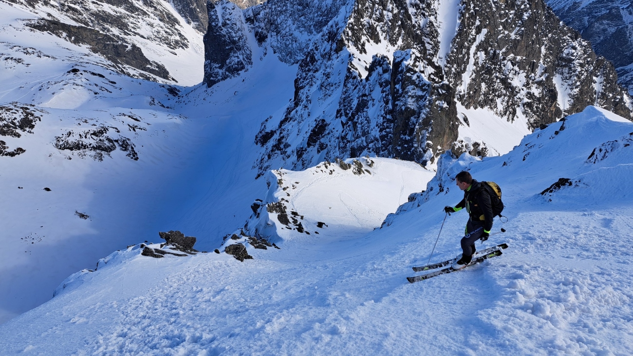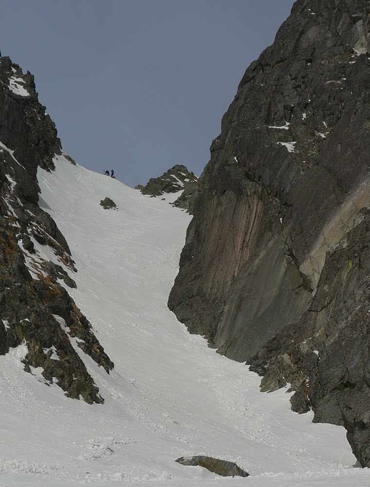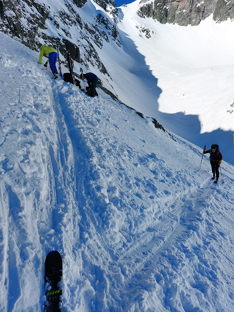 Hore výhľadové fotoorgie na všetky strany, ale aj vysoké oblaky, lezúce pomaly od západu. Tak zas pekne slušne peši dole, len tá „výnimka“ musela frajeriť na lyžiach. Lenže ako tieň pokročil, v hornej časti už takmer furt len nesmelým zosúvaním po drsnom šmirgli a v užšej dolnej časti spočiatku tiež, lebo pod načechranou, firnovou hladinou striehli žraloky.