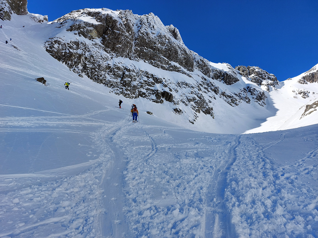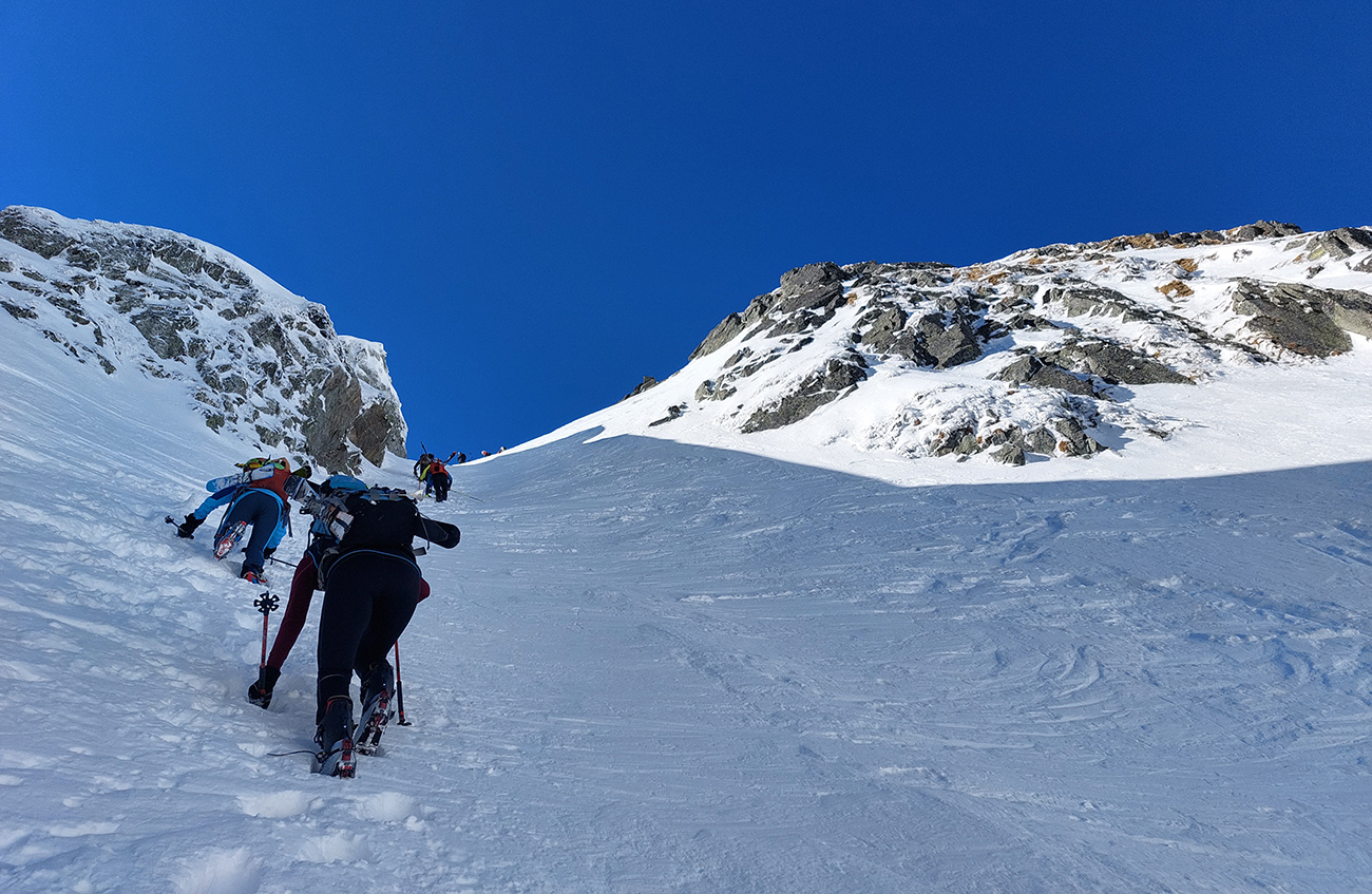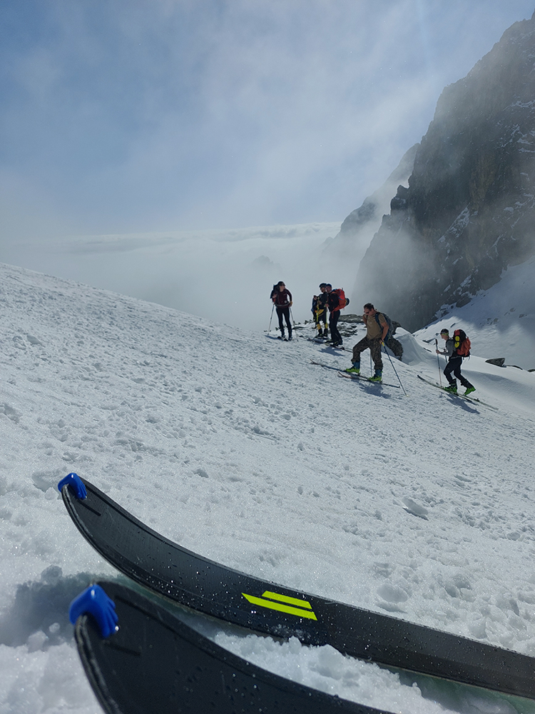 Hore výhľadové fotoorgie na všetky strany, ale aj vysoké oblaky, lezúce pomaly od západu. Tak zas pekne slušne peši dole, len tá „výnimka“ musela frajeriť na lyžiach. Lenže ako tieň pokročil, v hornej časti už takmer furt len nesmelým zosúvaním po drsnom šmirgli a v užšej dolnej časti spočiatku tiež, lebo pod načechranou, firnovou hladinou striehli žraloky.