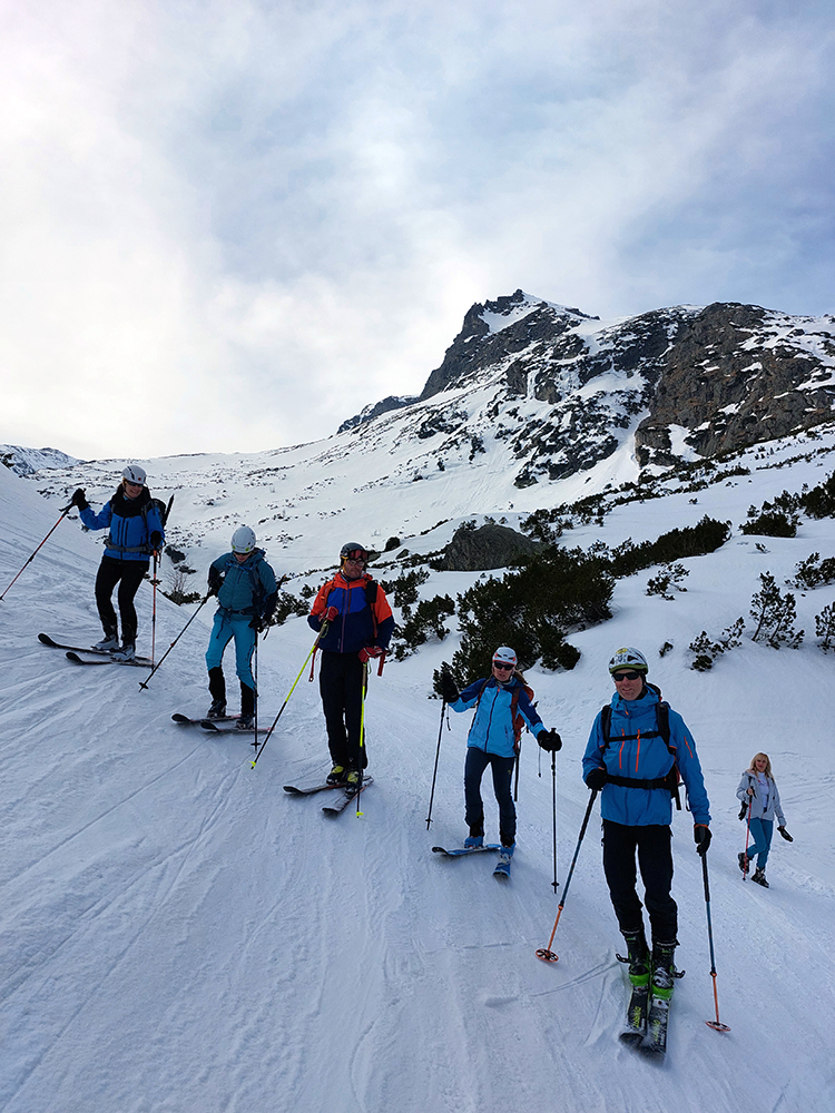 Stopa natiahnutá tak do polovice strmého pod Priečnym sedlom, potom superkomforné schody – ďakujeme predjazdcom. Mačky? Načo? Pár ľudí lyžovalo oproti: slušný hrmot, zjazdovka rovná, tvrdá, ale nie ľadová, podklad ideálne državý, aj oblúky sa im darili celkom estetické.