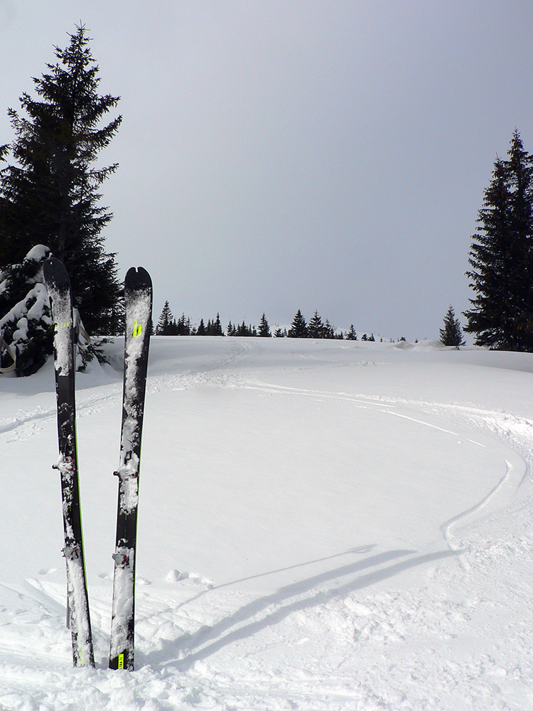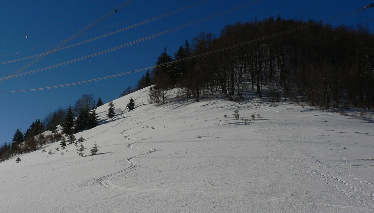 Potom nad lesom už paráda. Sneh akurát držal, ale nelepil, zo zadekovaných dolín aj dáke tie hmly vybehli na hrebeň, nebolo bárs horúco a viditeľnosť parádna. Tak som si „z výkladu“ ako prvé vybral juhovýchodné rebro Malej Chochule. Až dole po les úplná paráda. Kompaktný, rovný povrch, ani prašan, ani kašan, kôrka žiadna, len úplne dole už sneh trochu navlhnutý.