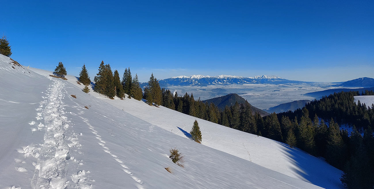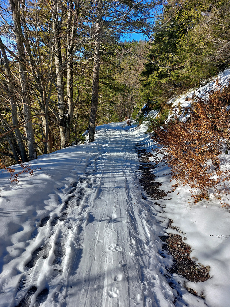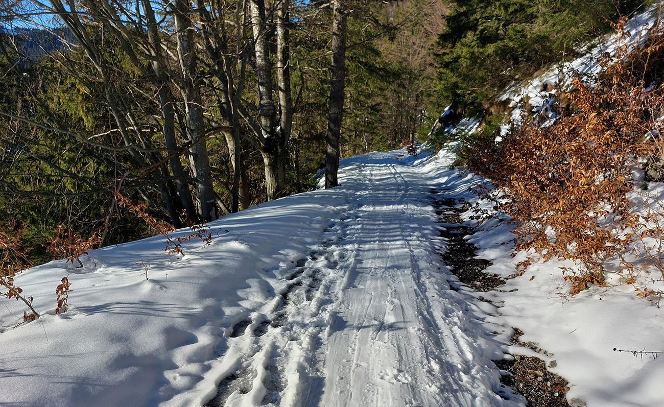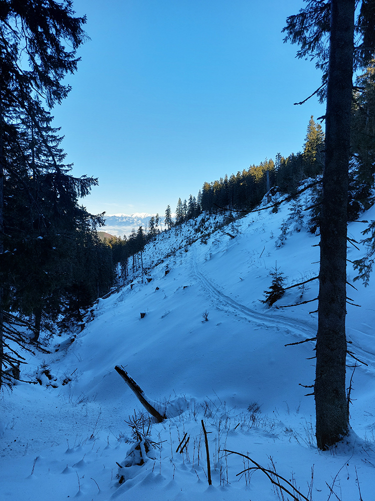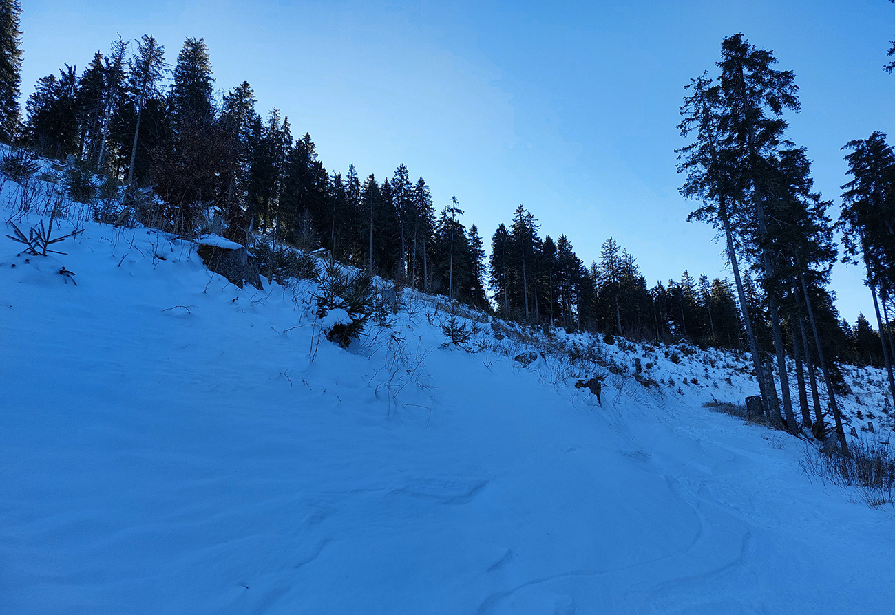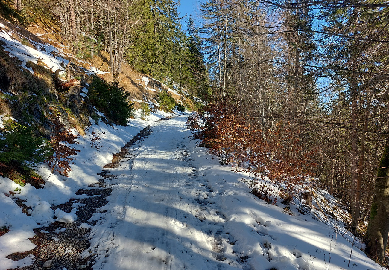 Takže po zjazdovke len kúsok a hneď nástup na Medvedí chodník. Ten centimeter snehu na ňom je uchodený, vytvrdený, až vyleštený a zrána zamrznuto hrkotavý. Húfy piraní tam plávajú, ale všetky vidno zďaleka, tak na výstup komfort. Alebo aj preto, lebo som pre istotu nasadil kameňačky.