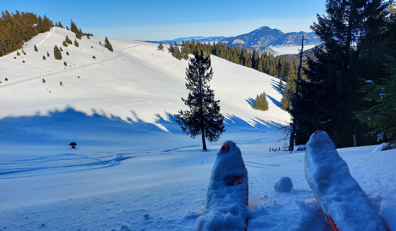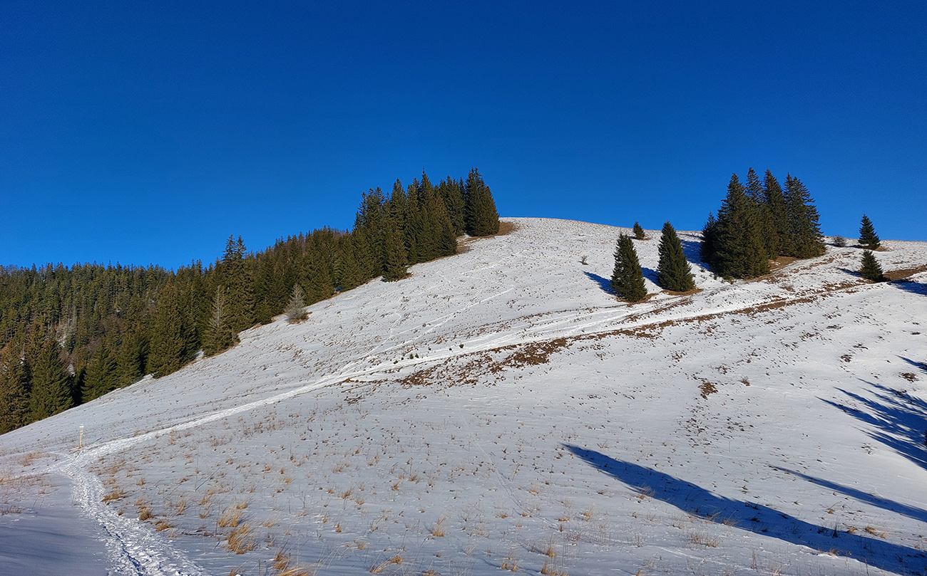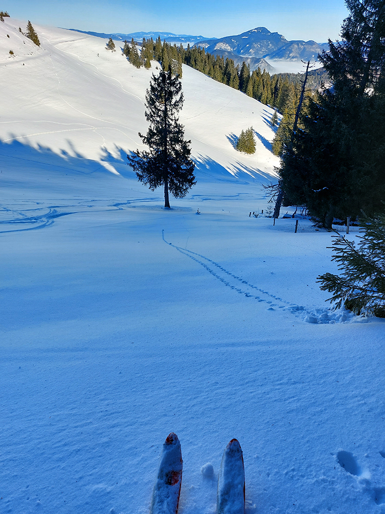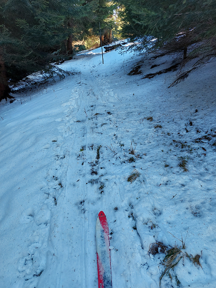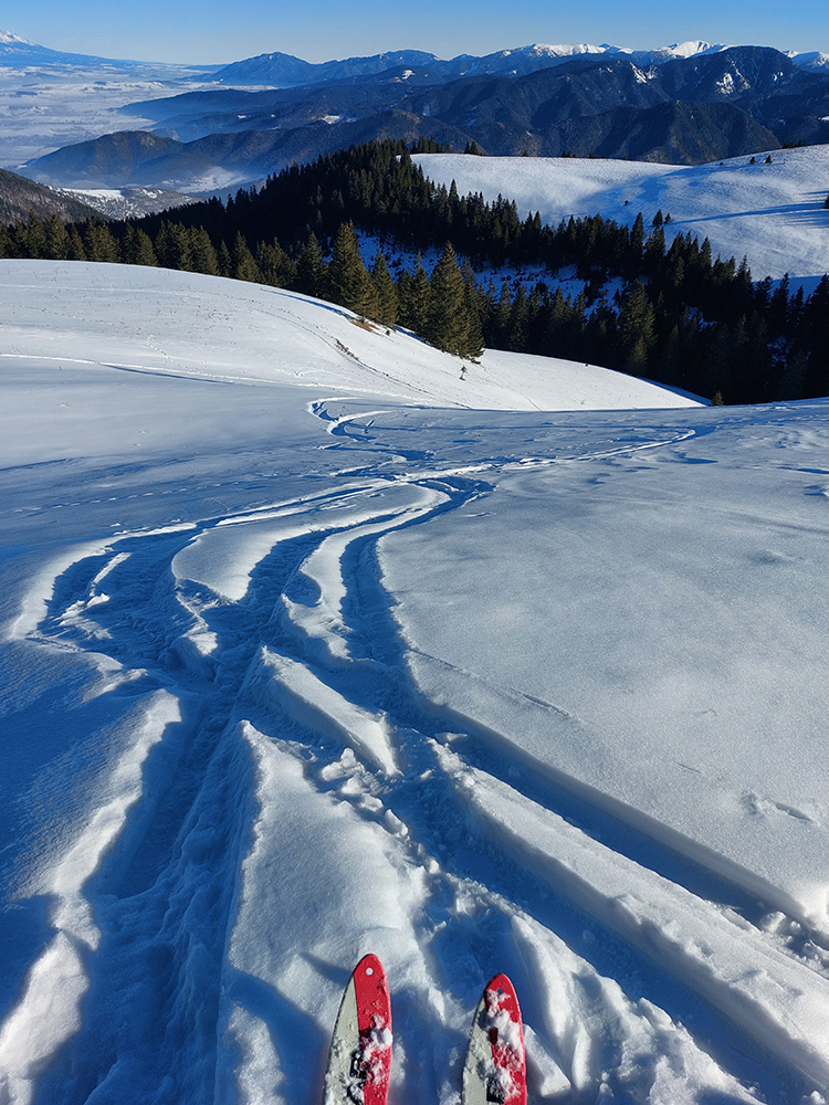 Slnko nízke, ukryté za stromami, prášku (kolo obeda už troooošku vlhnúceho) tak 10 cm, pod tým niečo staršie a hutnejšie, no fakt lepšia voľba ako striedať lepidlo a vatu na hrebeni smerom na Smrekovicu. Krátke síce, ale parádne lyžby, každá dĺžkou tak akurát na jeden záťah.