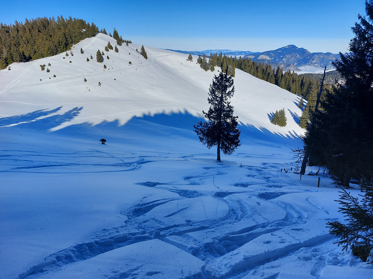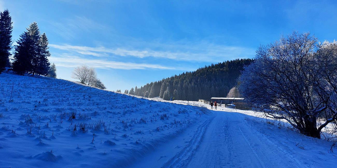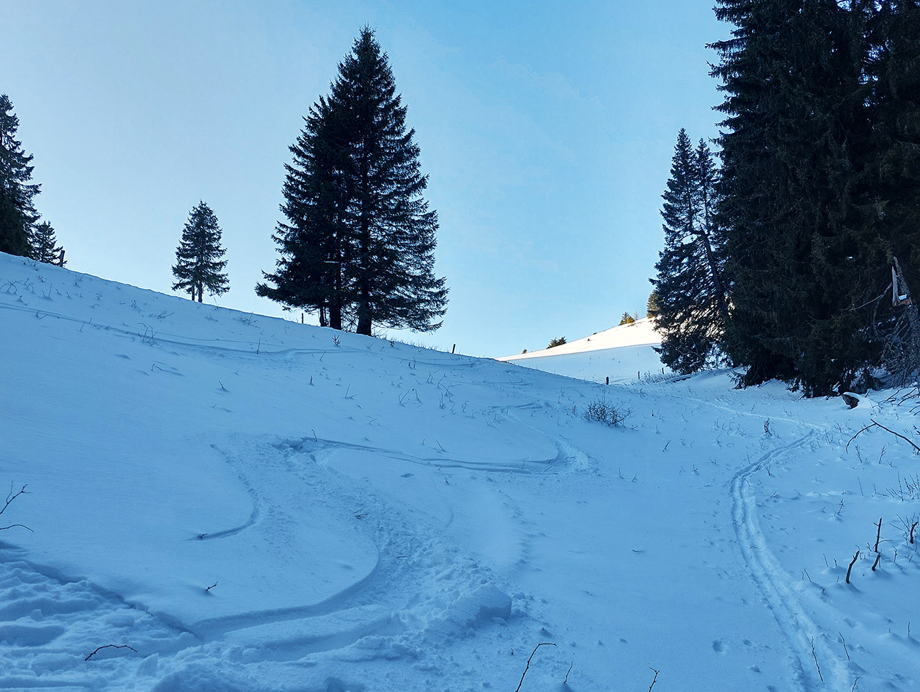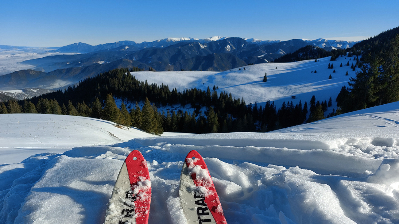 Slnko nízke, ukryté za stromami, prášku (kolo obeda už troooošku vlhnúceho) tak 10 cm, pod tým niečo staršie a hutnejšie, no fakt lepšia voľba ako striedať lepidlo a vatu na hrebeni smerom na Smrekovicu. Krátke síce, ale parádne lyžby, každá dĺžkou tak akurát na jeden záťah.