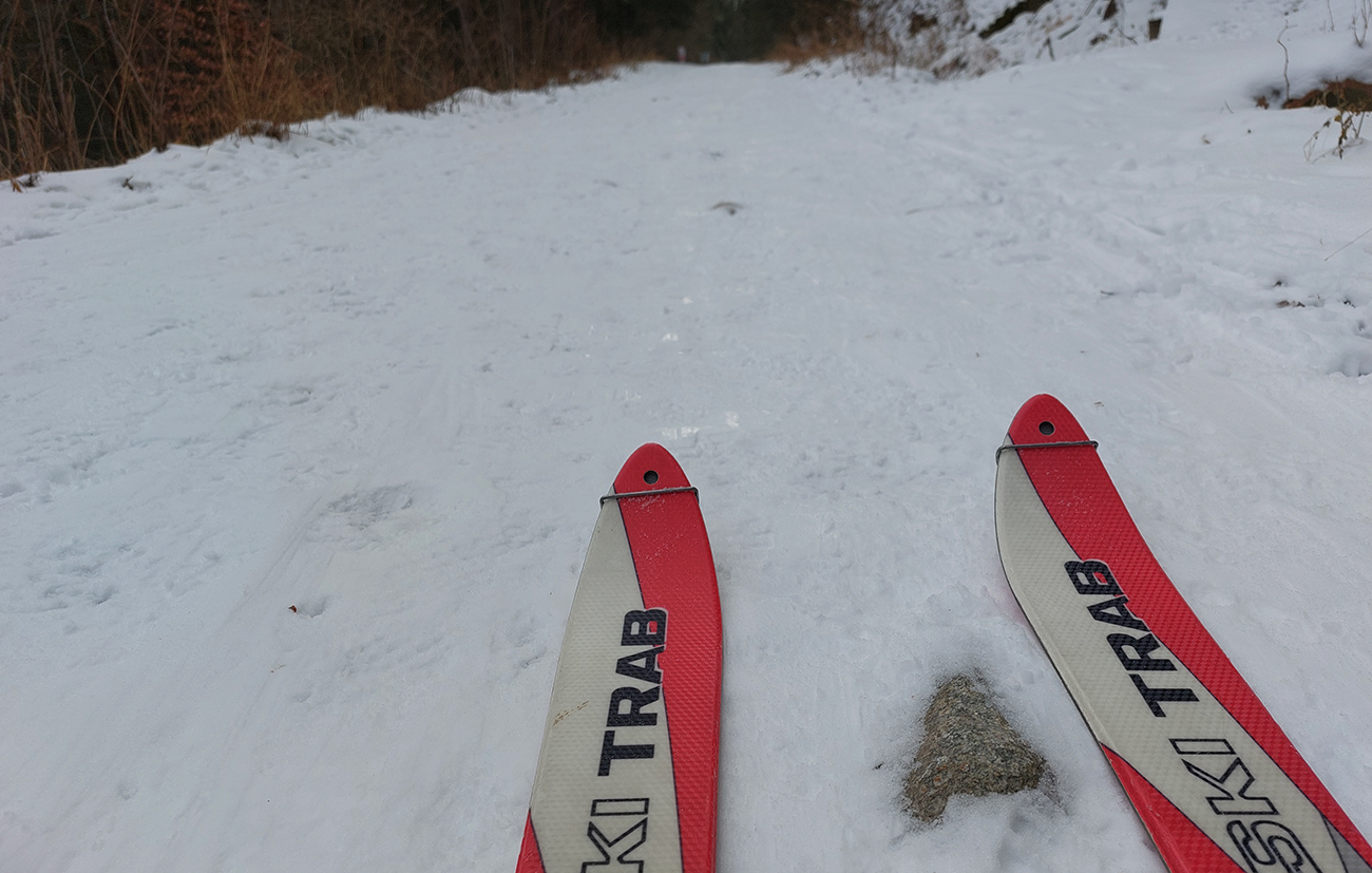 Tak už len odjazd – cestou pod Vtáčnik mi to išlo (mám dojem) lepšie na pásoch po tej špine napadanej zo stromov, ako na sklzniciach, už zbavených vosku. Cesta k Mederličke ešte zúfalejšia ako ráno a za chatou ten krátky úsek hustým lesom na zjazdovku čisté zúfalstvo – viac hnedej ako bielej. Pozajtra tam budú hríby rásť. Takže už len po umeláku, po zjazdovkách, odjazd dole. Aspoň v tomto je to Malino super.