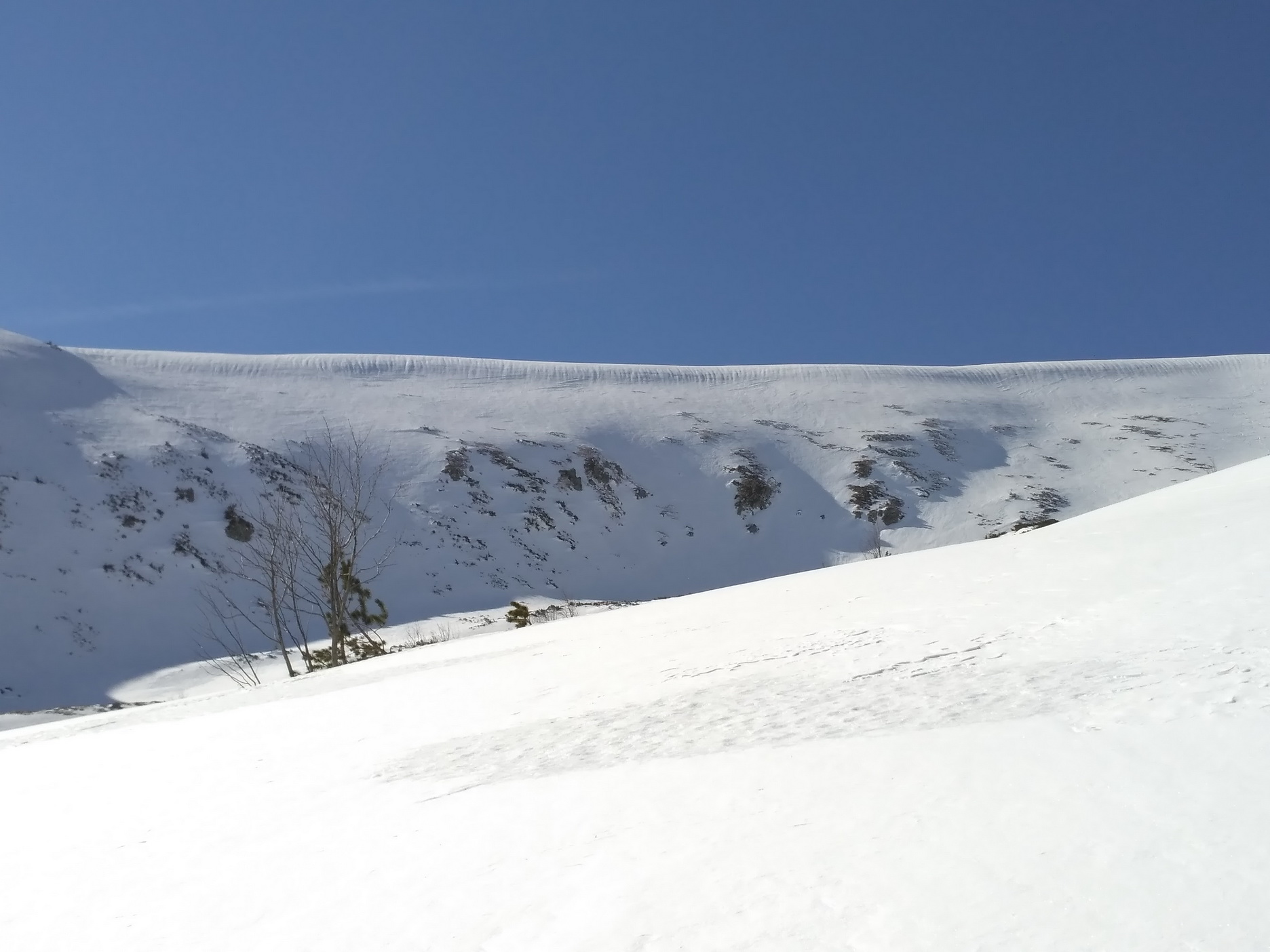Na túru si vyberám slnečný, ale chladný deň. Potom, ako som sa tu minulý rok po dvoch teplých nociach plahočil rozmočenou kašou, nemám chuť si to zopakovať. Robím dobre? Pri výstupe hore žľabom spadajúcim zo sedla Ďurkovej som si nie úplne istý. Povrch je betónový, kde tu mapky nafúkaného nového snehu. Blížiac sa k hlavnému hrebeňu odbáčam na prvom vetvení viac vľavo do žľabu začínajúceho z miesta, kde sa k hlavnému hrebeňu pripája bočný hrebeň smeujúci k Mestskej hore (zelená značka). Tento žľab je pre výstup asi najkomfortnejší a za určitých podmienok sa dá kompletne vypásovať. Dnes tie podmienky nie sú a k záveru hádžem lyže na batoh a obúvam škrabáky. Ide sa dobre a tak po dosiahnutí hrebeňa hneď neprestrojím a testujem, do kedy ma táto neatraktívna technika bude baviť. Výsledky testu nie sú dôležité a čoskoro som na Chabenci (1955 mnm). Zlepím, zapnem a fičím juhovýchodnou expozíciou do záveru Lomnistej doliny. Nádherný priestor, ako všetko zakázané. Na pásoch v diskrétnosti podpásujem obrovskú zbernú plochu Kotlísk a zo záveru kotla v mačkách cikcakujem k vrcholu Skalky.