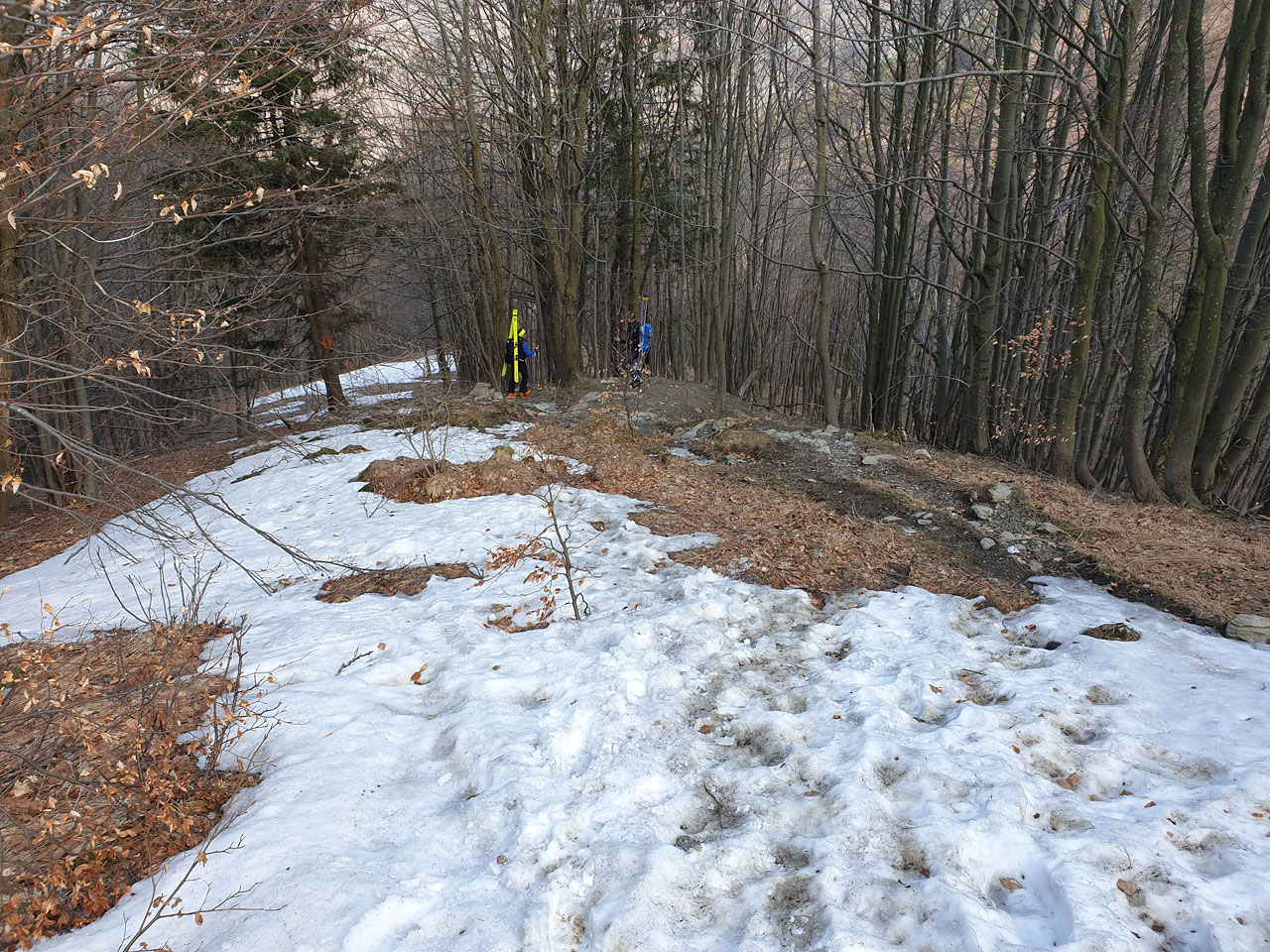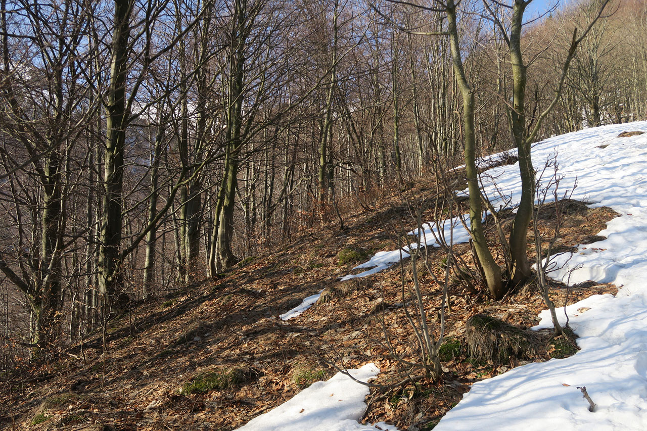 Stretávka na spodnom parkovisku v dohodnutom čase.Prvá prekážka je celkom výdatný potok,lebo lávky niet,a už si to smerujeme niekde do miest sedlo Kraviarske.Ideme napešo najprv po suchej cestičke,neskôr po kameňoch,medzi ktorými je ľad a na ňom lístie.Nie je to celkom pohoda,vyšie v bukovom traverze už fajne a sucho.
