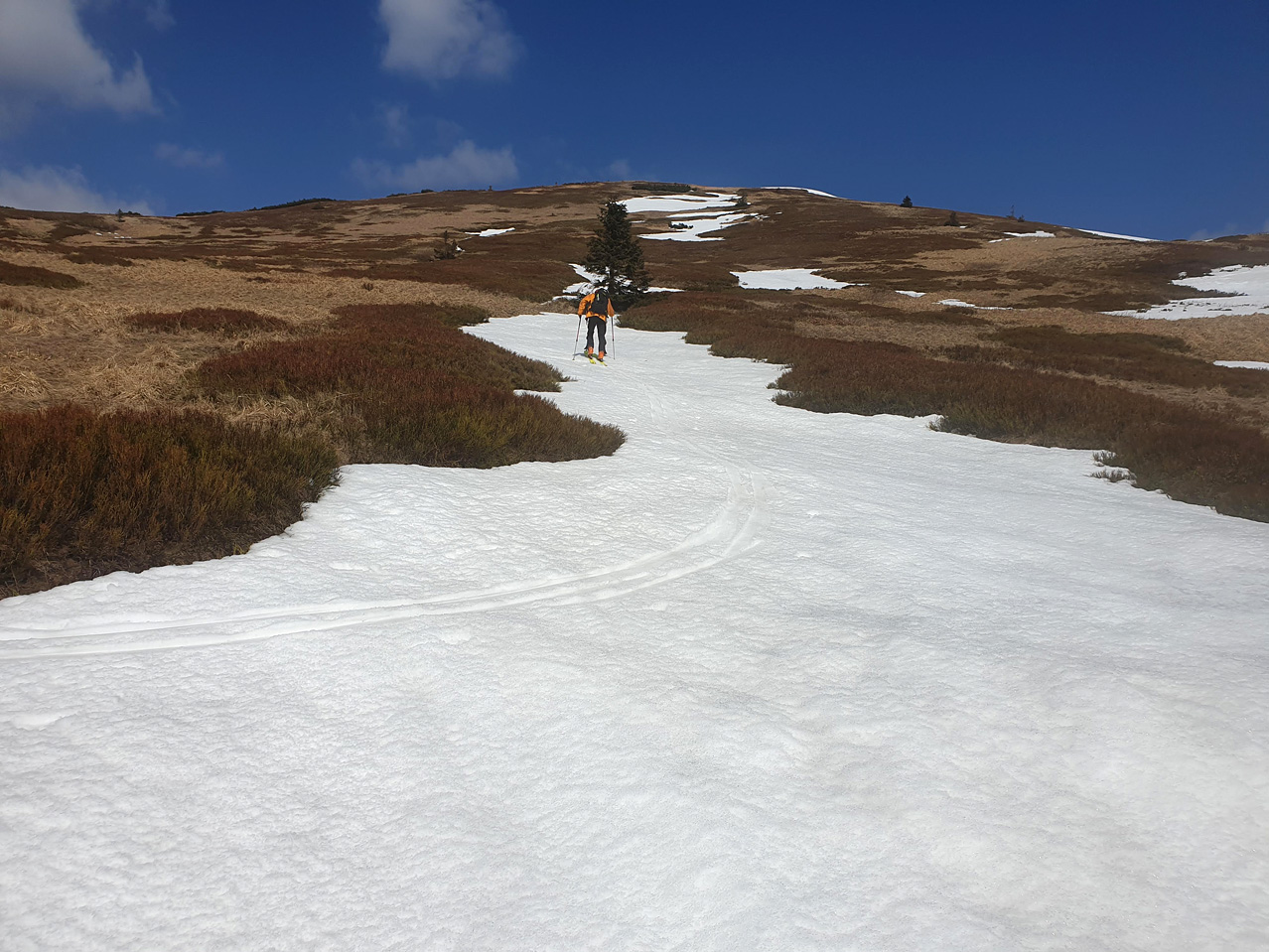 Lyžovačka je rozprávková na oboch dnešných zjazdovkách.Pri výstupe na hlavný hrebeň nachádzame úzku vysneženú cestičku,ktorou sa dostávame na chodník a odtiaľ už len kúsok do Bublena.Pod ním zapíname temer hneď a lyžovačka je spočiatku tvrdá,neskôr na úrovni kosovky už fajne odmäknuté.Tá sa ešte celkom nevymanila zo snehového objatia.Lyžujeme aj kus v bučine až do miest,kde sme ráno zapínali.