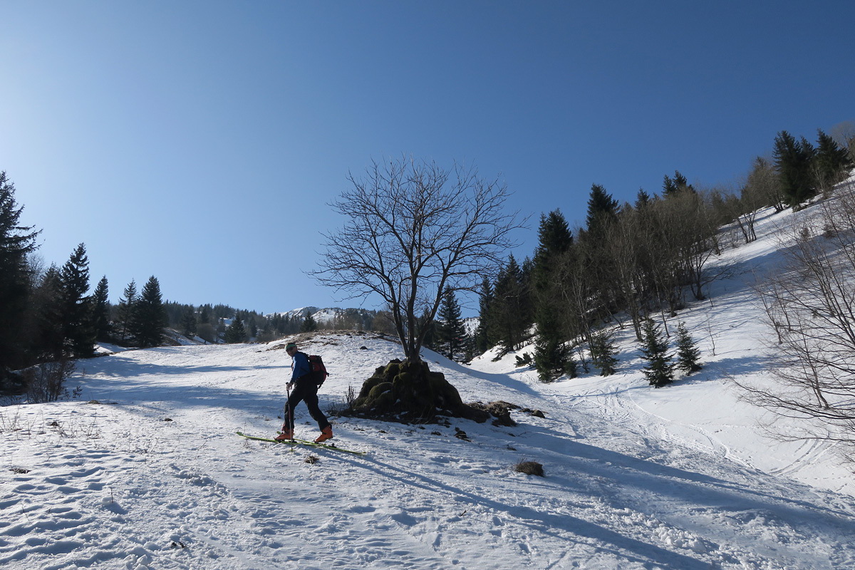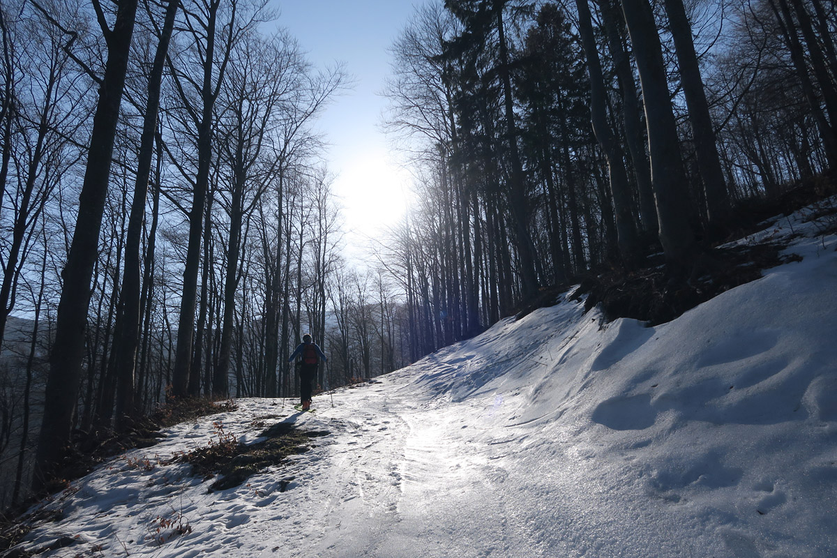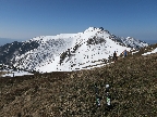 Dole lepíme mokré pásy a ťaháme sa späť na Chleb žľabom smerujúcim k hornej stanici kotvy.Je jasné,že aj tu to stihlo trochu odmäknúť tak pokračujeme k vrcholu.Zaťahuje sa.Tesne pod vrcholom prepíname do zjazdového módu lebo vrch je tráva.Chrbtom Chleba so zatočením na brucho povedľa výstupového žľabu užívame jar vo Fatre.Nižšie v nafúkaných miestach sem tam vata,ktorá nám pripomína byť v strehu.Ďalej lyžujeme až na miesto kde sme ráno zapínali..