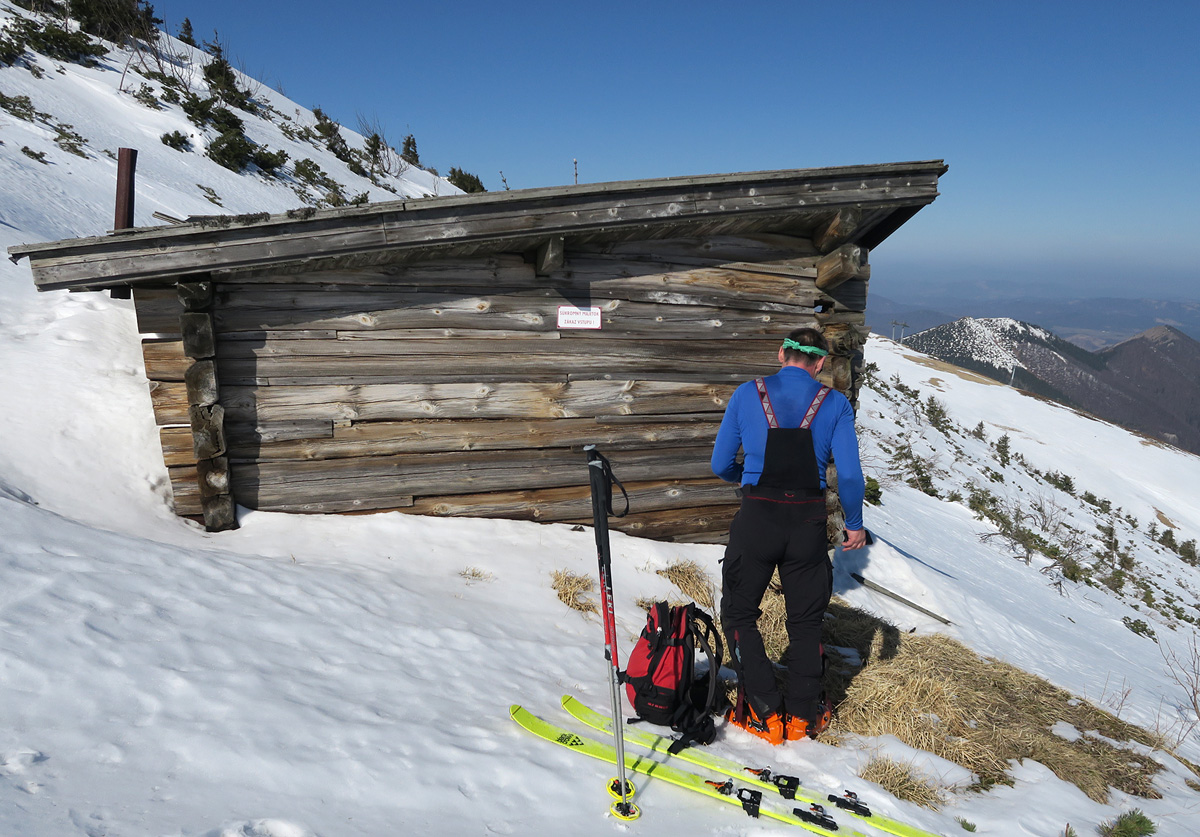 Pauzujeme na starej chate Slovanu so zbortenou strechou,kde končil kedysi oddielový „bejby“vlek.Neponáhľame sa,je neobvykle tvrdo,len uvažujeme,či potiahneme hore na Chleb,ale rozlúskne to pohľad z hrebeňa na Veľký Kriváň,kde už niekto zjazduje a nepočuť ho,takže predpokladáme,že tam už je odmäknuté.
