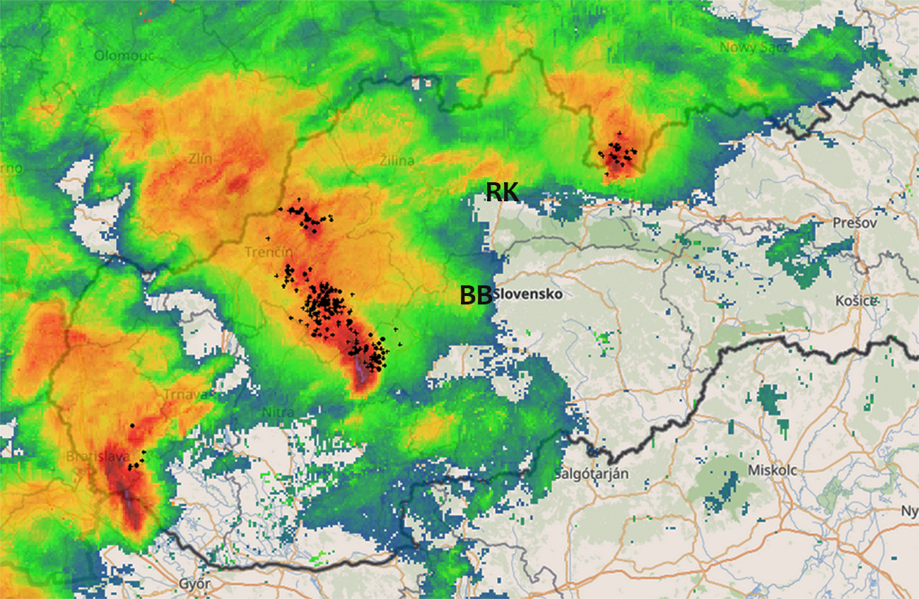 ...a to doslova a dokonca v dvoch významoch – padli všetky traťové rekordy (aj ten psí), takže behalo sa bleskovo. A nebyť tých ozajstných bleskov (ktorých bolo až moc a boli nebezpečne blízko), boli by časy ešte rýchlejšie. Takže jubilejná desiata UF sa zapísala do svojej vlastnej histórie aj do pamäti účastníkov a organizátorov poriadne intenzívne. Našťastie sa nikomu nič vážne nestalo, až na nejaké dva vytknuté členky a jednu rozbitú hlavu. Plus možno nejaké zranené egá, ako to pri ultrabehoch býva. No teraz najmä počasie hralo dosť významnú rolu, ako v reality show o varení: najprv tvrdé ultramäso pred štartom napácovalo letným dažďom, potom ho cestou cez Japeň a Majerovu skalu zľahka podusilo vo vlastnej šťave s lesnými bylinkami. Na záverečnú úpravu bleskovým opražením do chrumkava už našťastie nedošlo, aj keď u niektorých k tomu vraj veľa nechýbalo, podľa ich vlastných slov a zježených chlpov. Lebo cez trať sa počas dňa prehnali tri rýchle búrky, ako postupovali z JZ na SV, tu ich je vidieť: prvá už odchádza do Poľska, druhá (tá najhoršia) akurát útočí na Veľkú Fatru, tretia je ešte v Rakúsku: