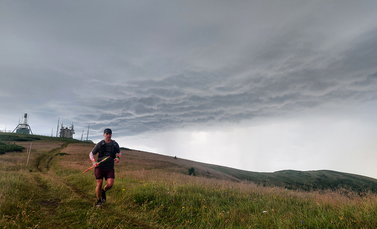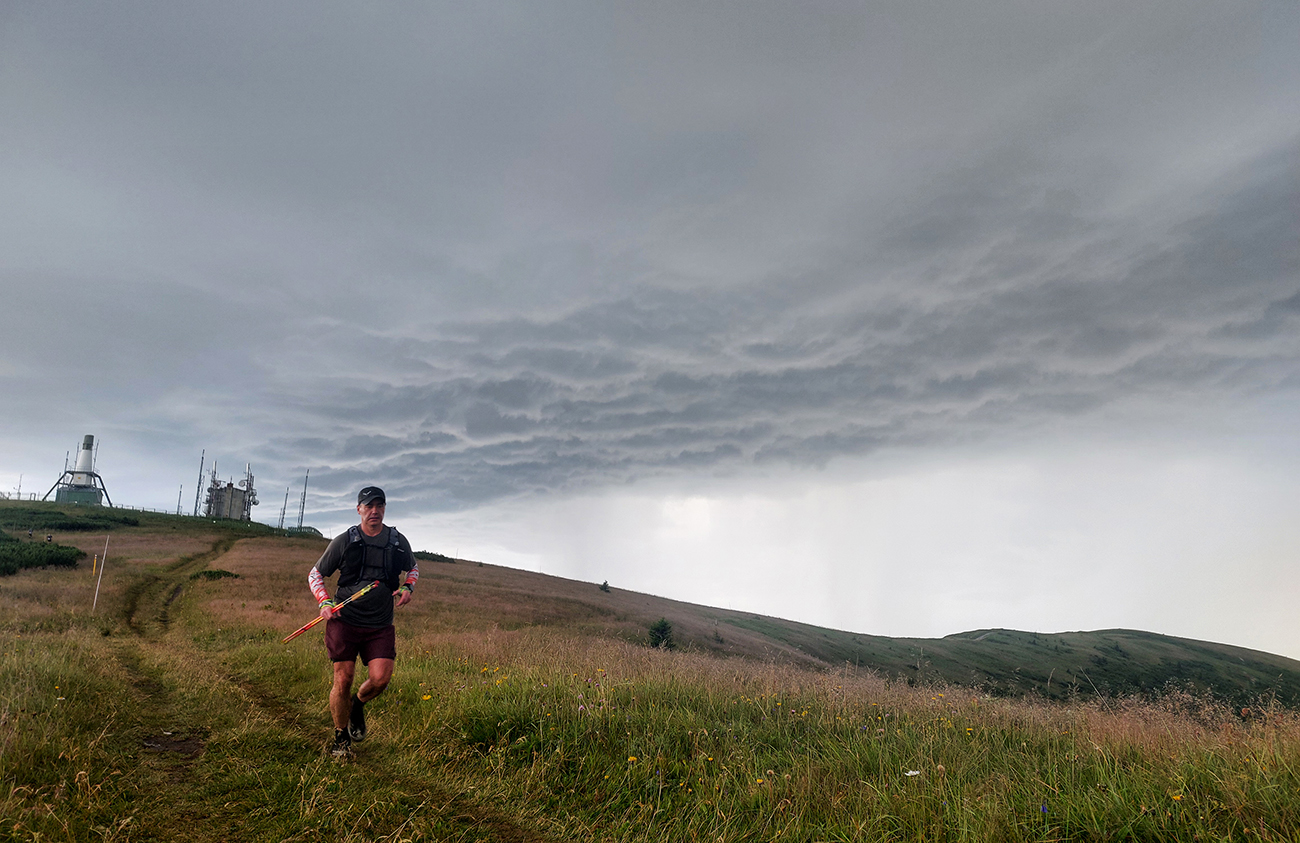 Stúpanie na Krížnu, to bolo to dusenie v bylinnom náleve, našťastie nad lesom už pofukovalo a nanešťastie spoza Krížnej pohrmievalo. Ako ďaleko sa tá búrka zdala byť ešte pred desiatou spod Krížnej, tak rýchlo priletela a tesne po desiatej už zúrila priamo nad hrebeňom. Našťastie sa elektrina vybíjala prevažne hore v mrakoch, aj so sprievodnými svetelnými efektami. Prvé varovanie – tam sa ozaj nie je kam ukryť. Vypol niekto aspoň telefón? A novinka v podobe gps trackera, ktorú si každý niesol so sebou, na bezpečnosti tiež asi nepridala. Pípla síce sms od organizátorov, že hrozia búrky, ale čo už z toho? Možno už tu mohli byť preteky zrušené a ľudia aspoň s pomocou sms zahnaní dole z hrebeňa... Pritom to najlepšie ešte len malo prísť.