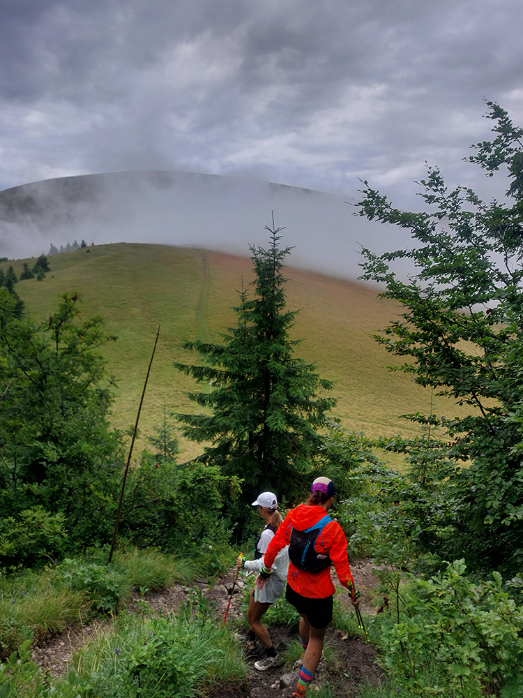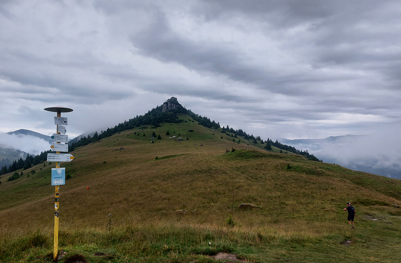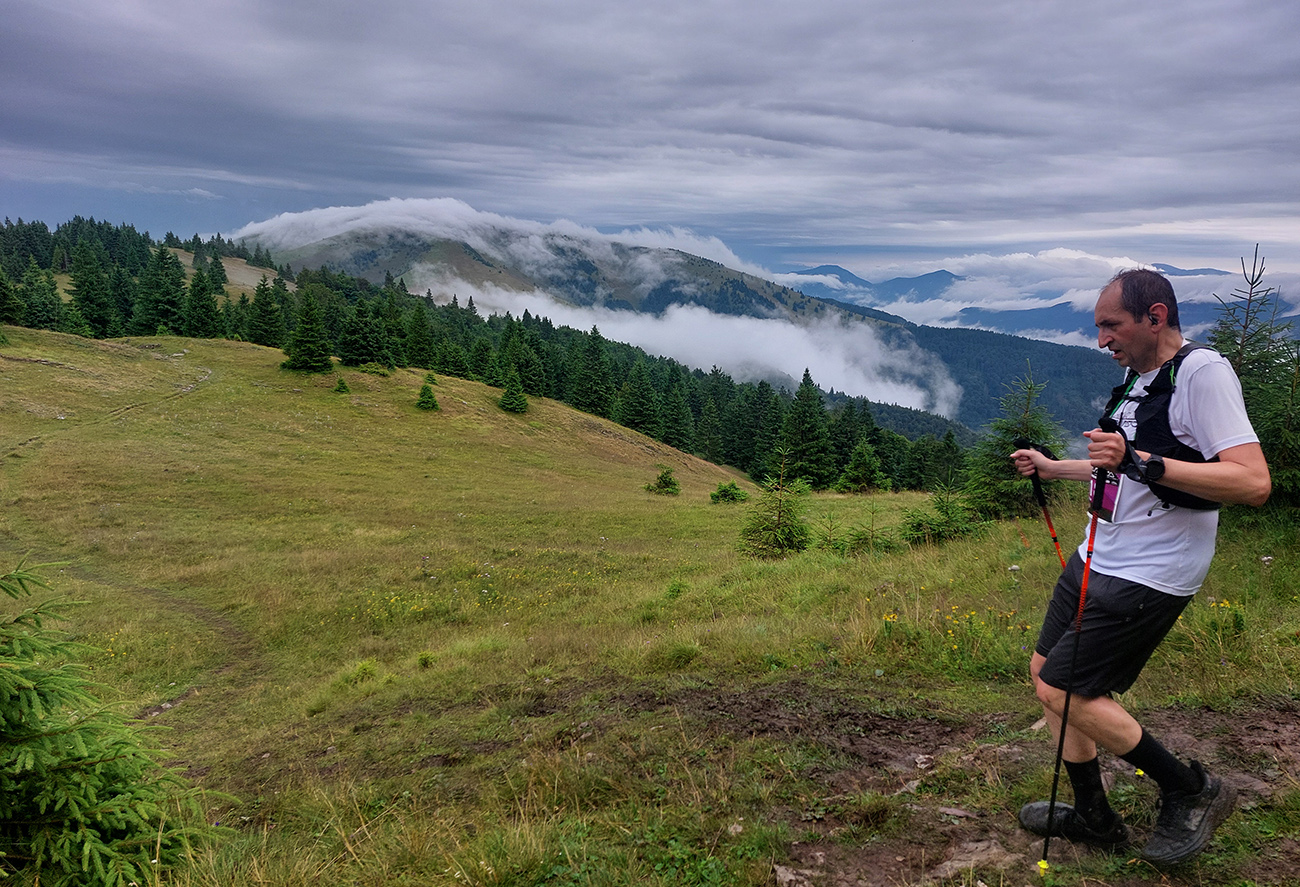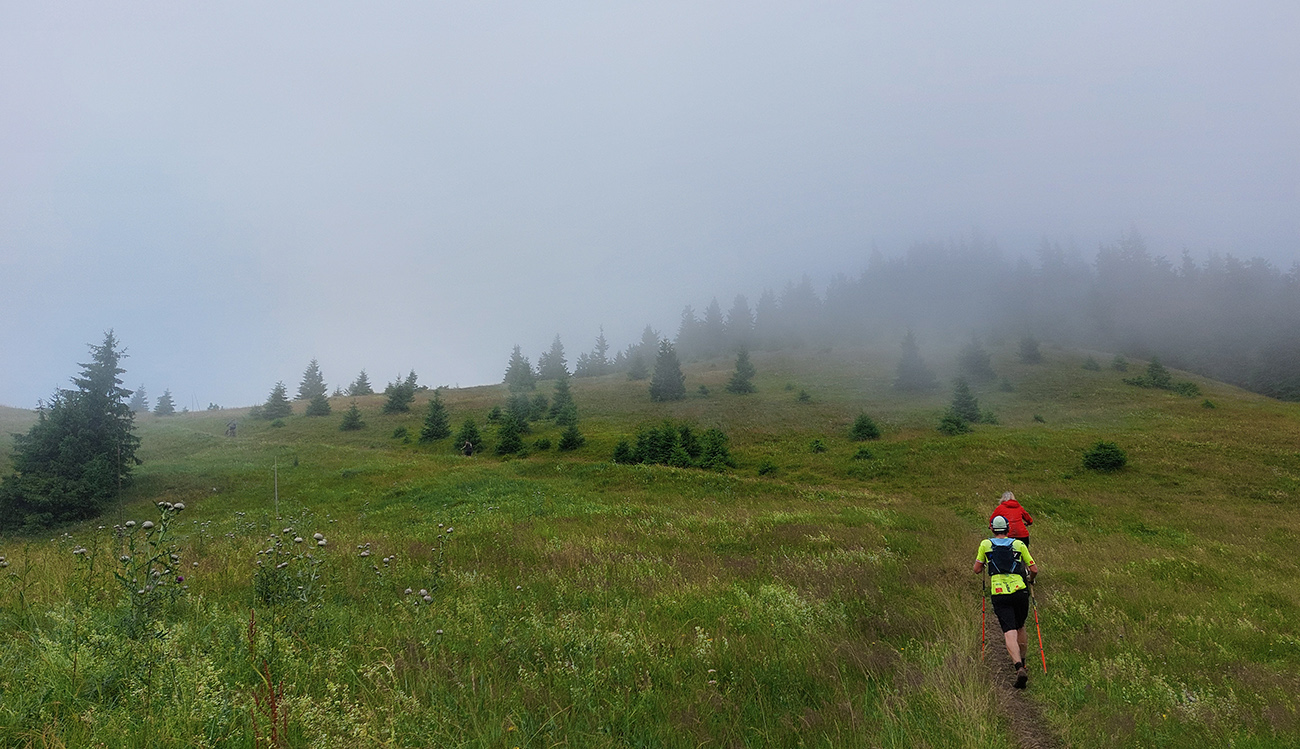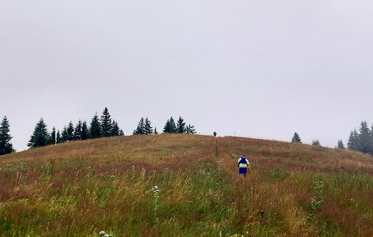 Predpeklie teda rýchlo prehrmelo a behanie až po K2 pod Borišovom (pre prvých hádam až po K3) bolo príjemné. Teda až na ten magľajz pod nohami na viacerých miestach, chcelo to zvlášť dobrý dezén. Teplota ideálna, ďaleké výhľady, biele útržky mrakov medzi kopcami a pod Ploskou stádo bečiacich kosačiek.