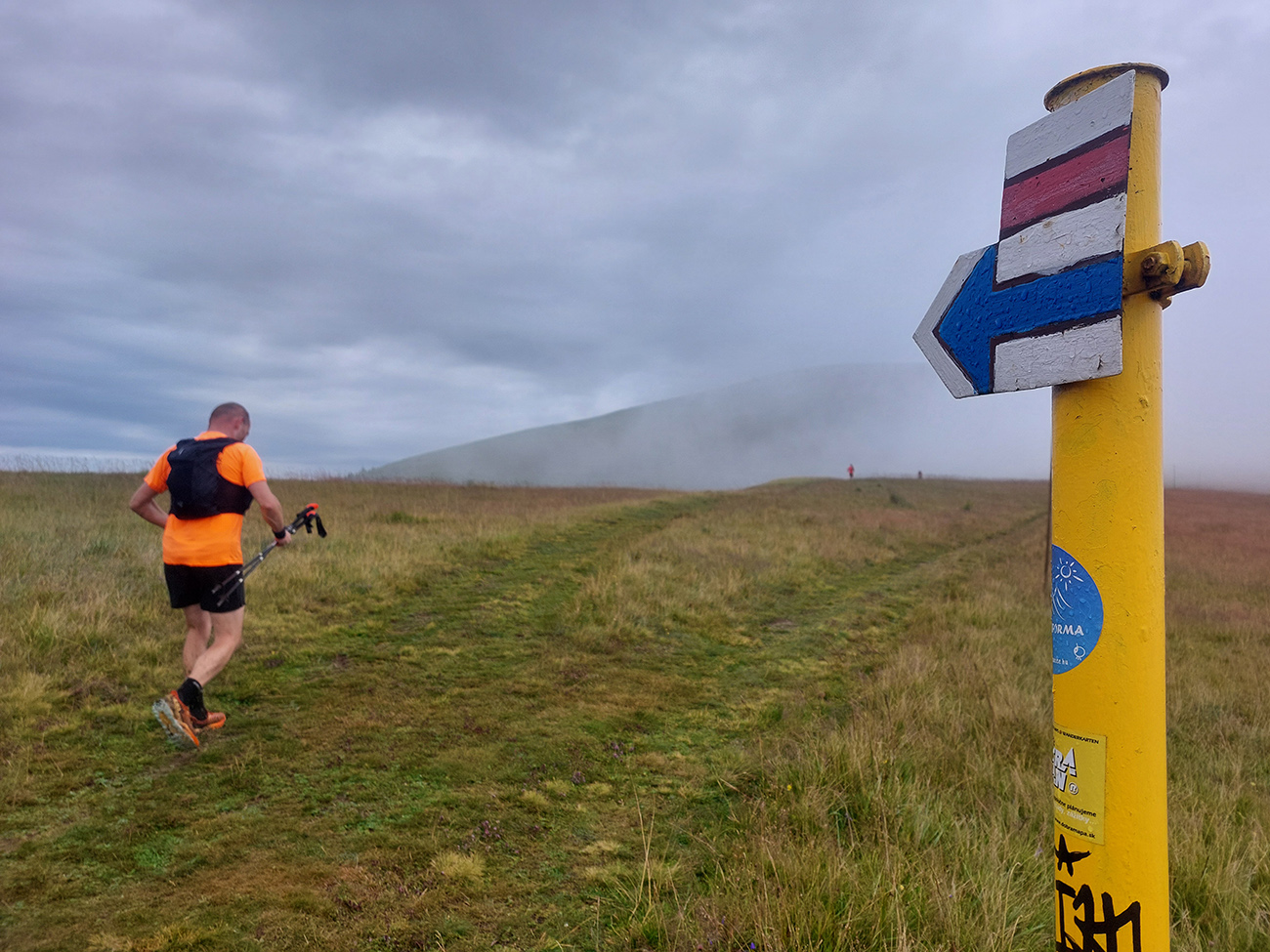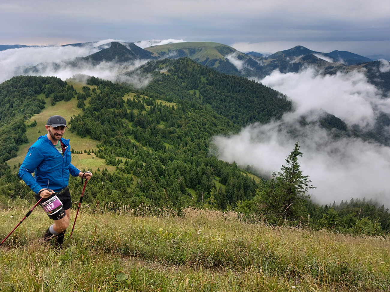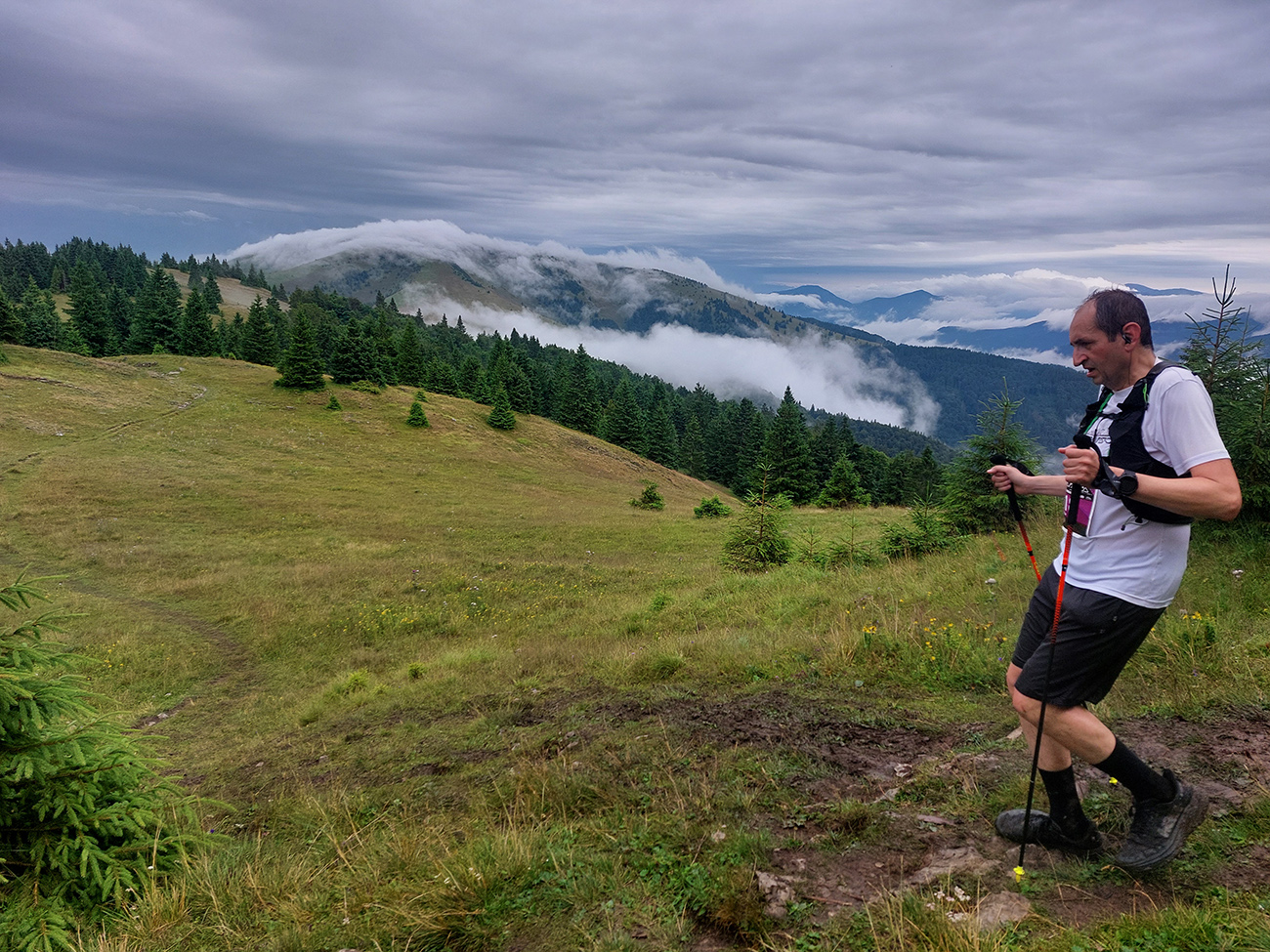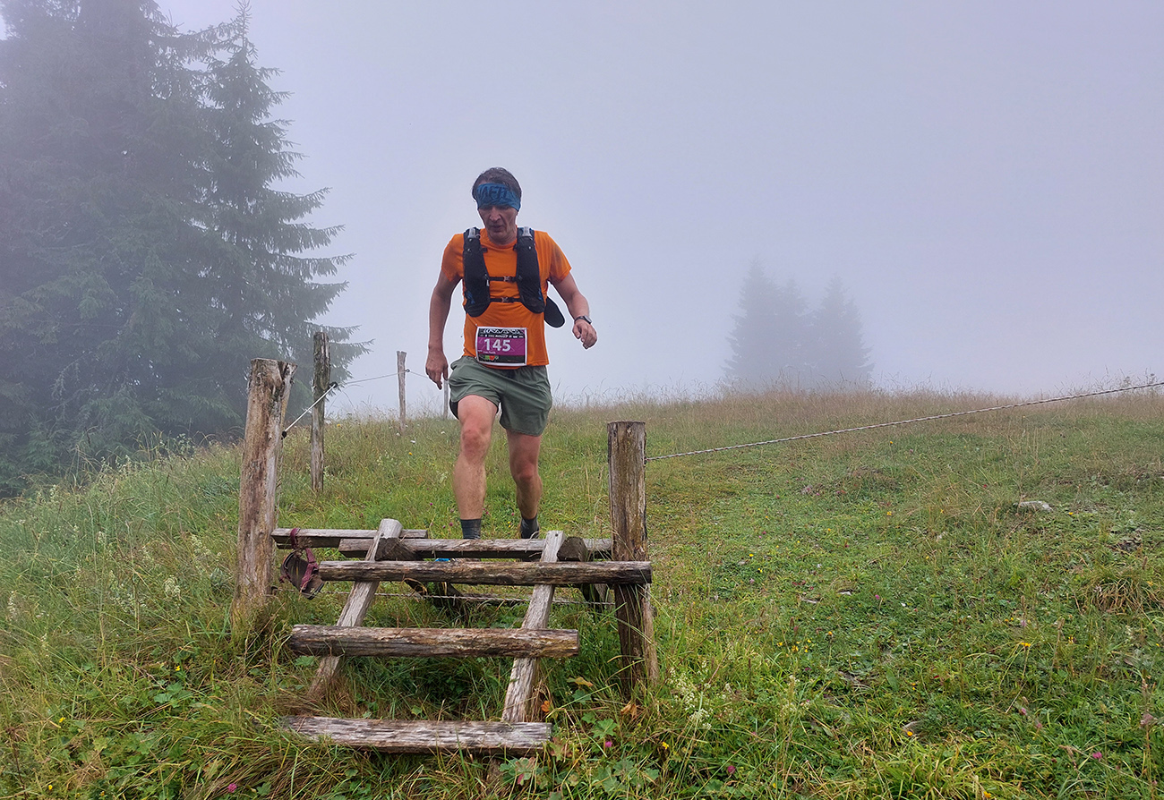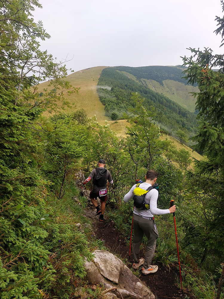 Predpeklie teda rýchlo prehrmelo a behanie až po K2 pod Borišovom (pre prvých hádam až po K3) bolo príjemné. Teda až na ten magľajz pod nohami na viacerých miestach, chcelo to zvlášť dobrý dezén. Teplota ideálna, ďaleké výhľady, biele útržky mrakov medzi kopcami a pod Ploskou stádo bečiacich kosačiek.